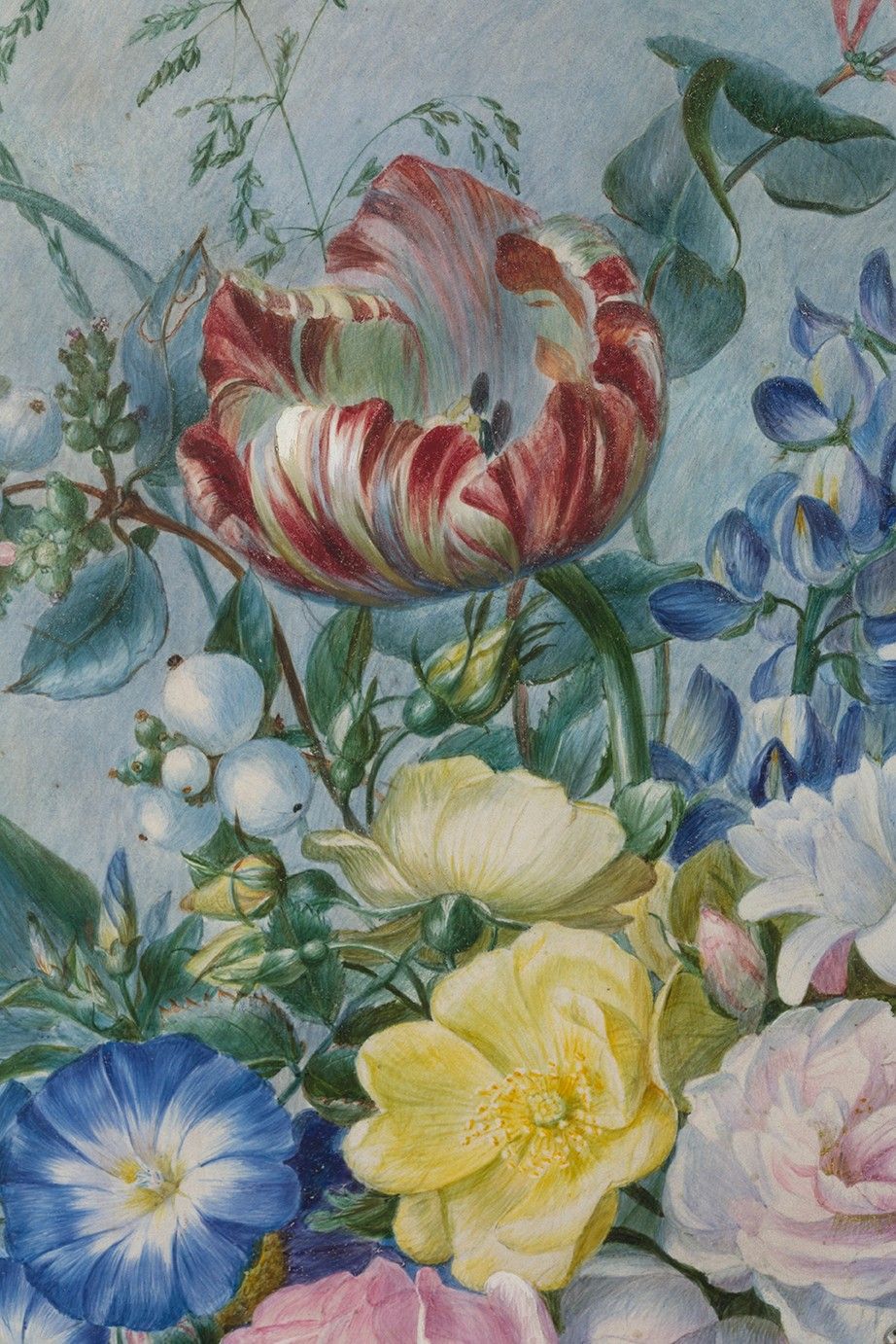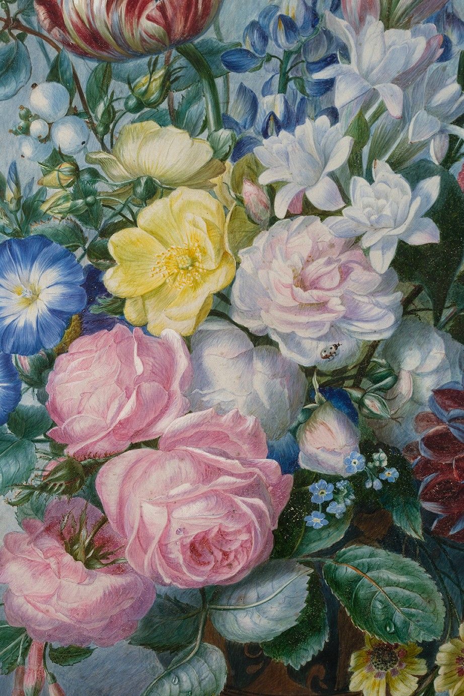 Still life with a nest and bouquet of roses, tulips, lupinus, ipomea, white waterlilys, myosotis, chrysanthemum, coreopsis, auriculas, fuchsias, pansies and snowberry on a stone entablature, graphite and watercolour enhanced with gum arabic