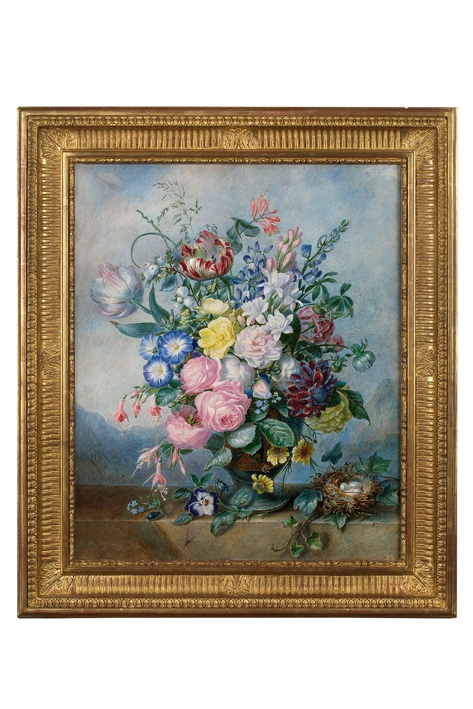 Still life with nest and bouquet of roses, tulips, lupins, ipomoeas, white lotuses, forget-me-nots, chrysanthemums, coreopsis, auriculae, fuchsias, pansies and snowberry on a stone entablature