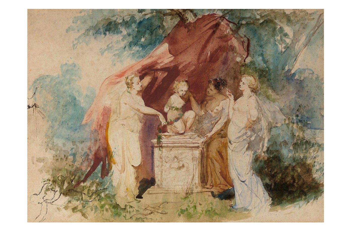 The three Graces paying homage to Love, watercolor