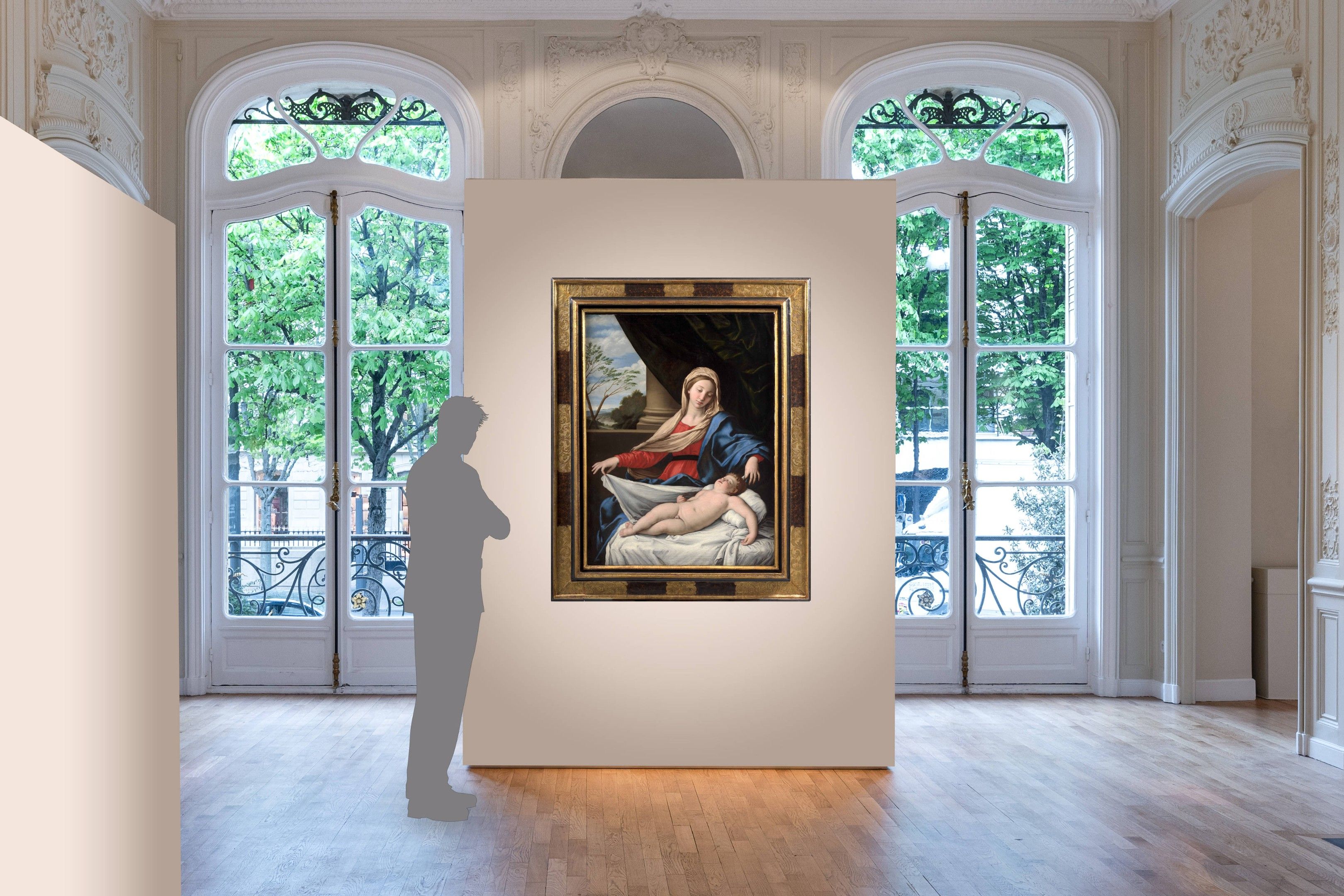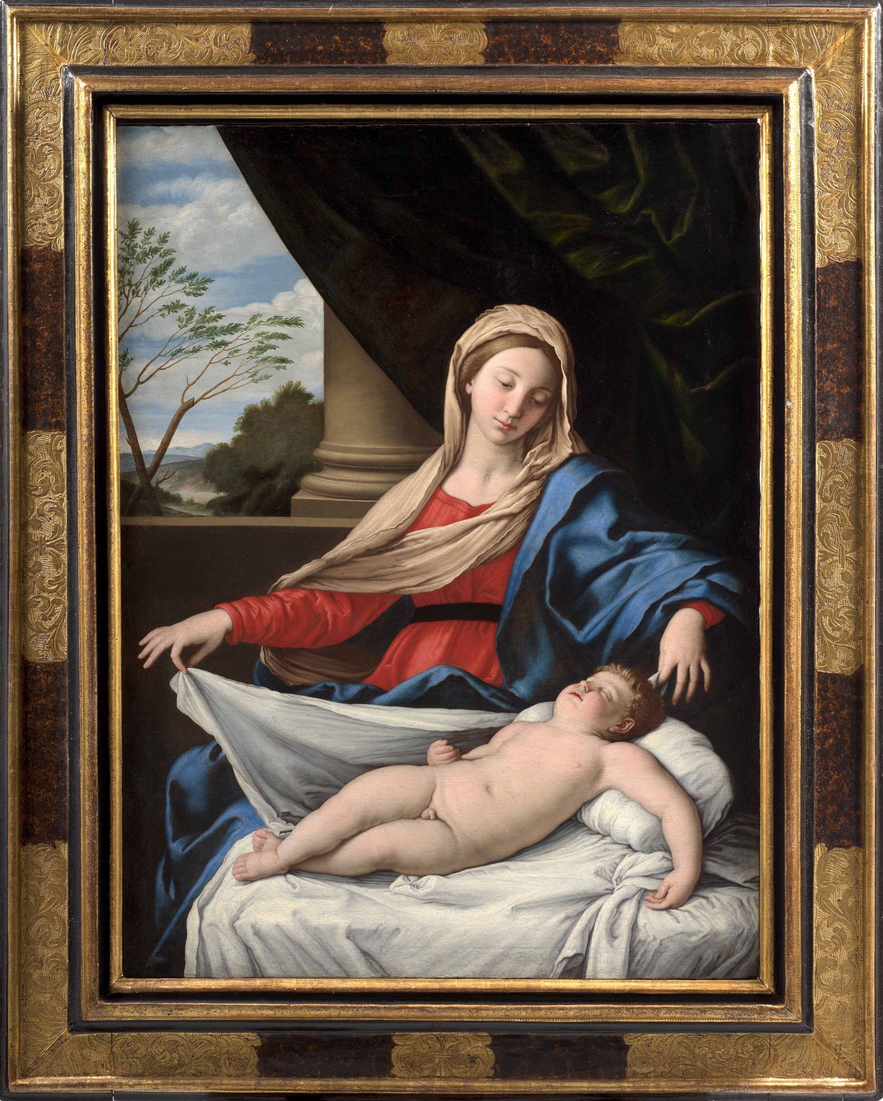 The son of a painter who left frescoes in Sassoferrato, Giovanni Battista Salvi is mentioned in 1630 in Perugia. There, he familiarised himself with the work of Perugino before continuing his career in Rome, where he was recorded in 1641. His work was part of the Counter-Reformation movement, which promoted the cult of the Virgin Mary. A painter for the papacy, rightly nicknamed the "painter of the Madonnas", he produced around a hundred devotional works depicting the Mother of Jesus. Emerging from the shadows, the Virgin, in this case pensive, protects the sleeping Child. The importance given to the white linen, highlighted by the abundance of folds, already foreshadows the shroud of her Passion.