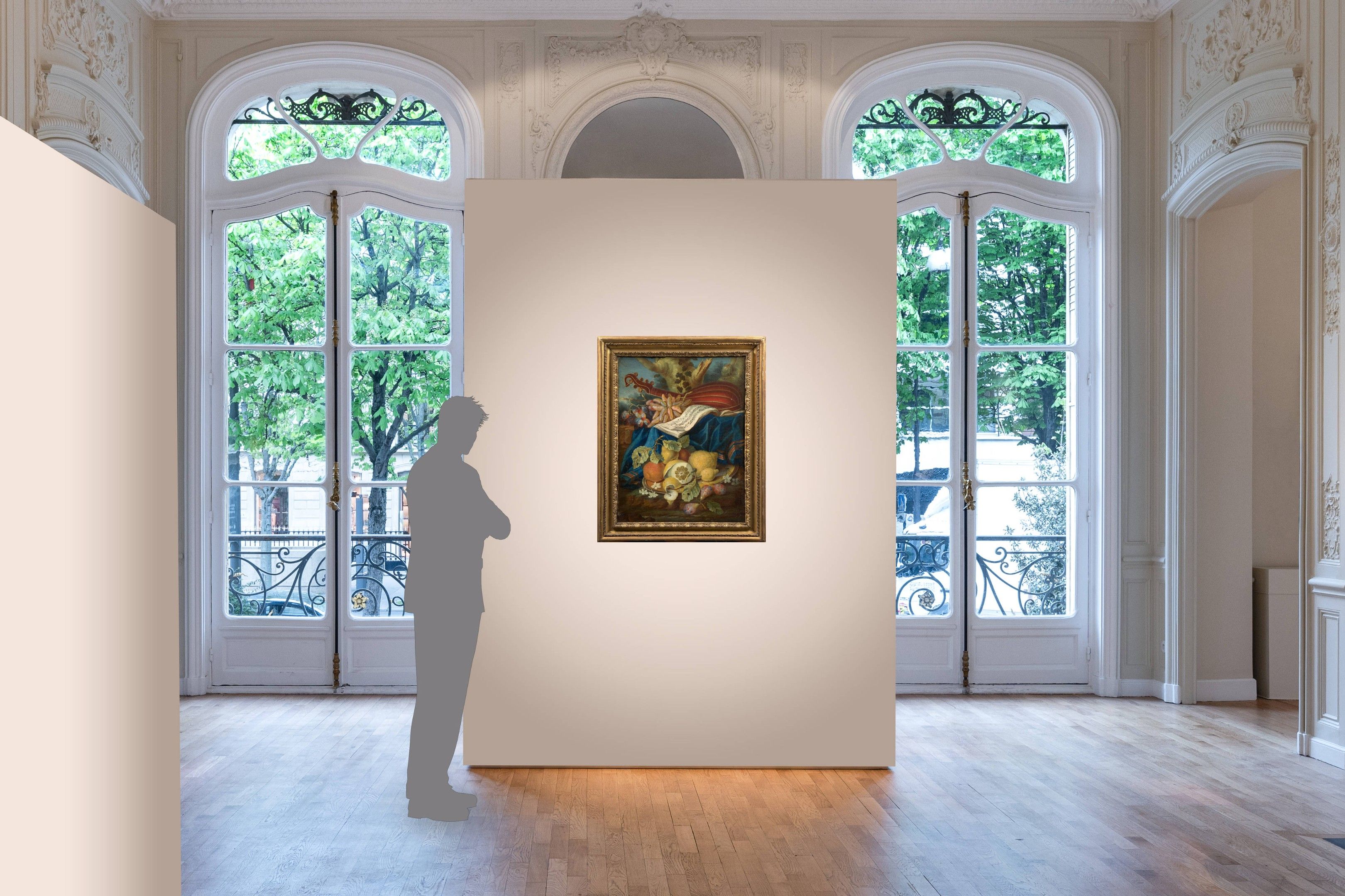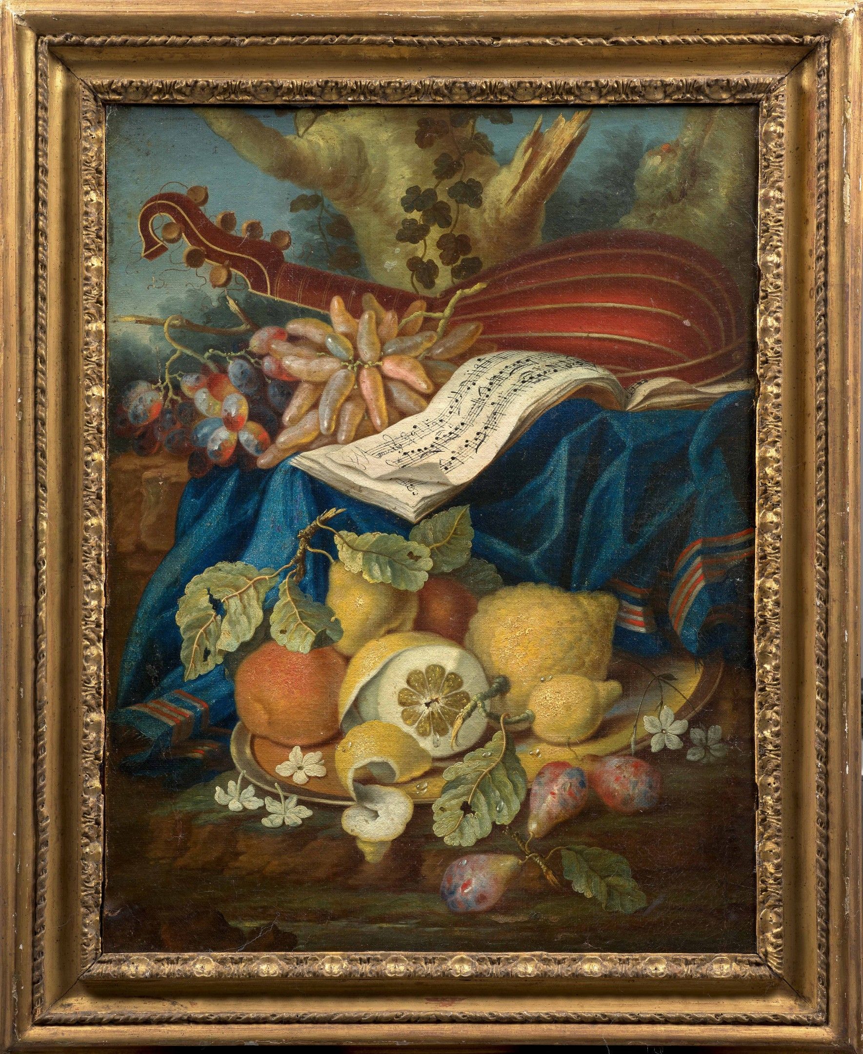 Composition with citron, viol and fruits, oil on canvas, by M. Pfeiler