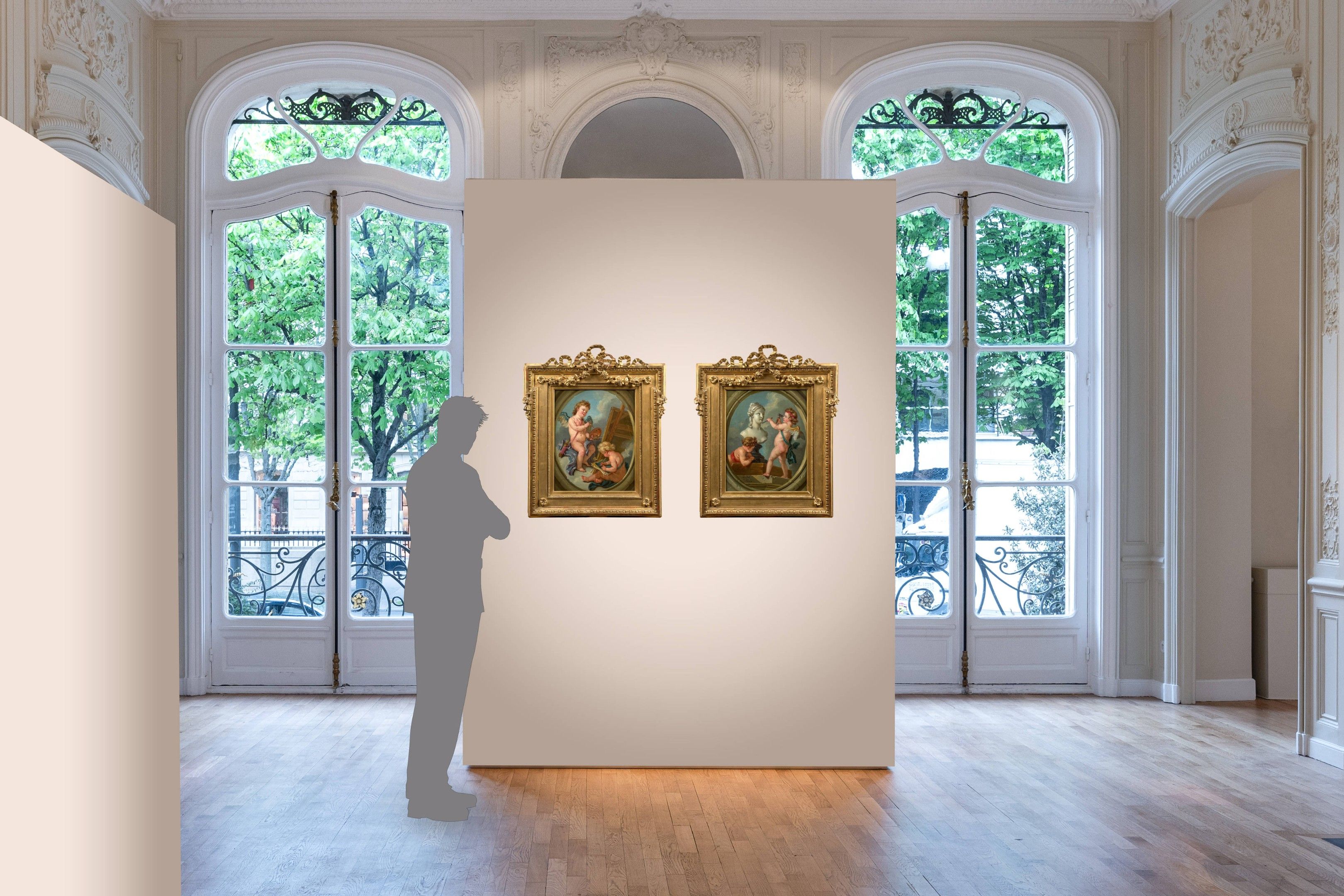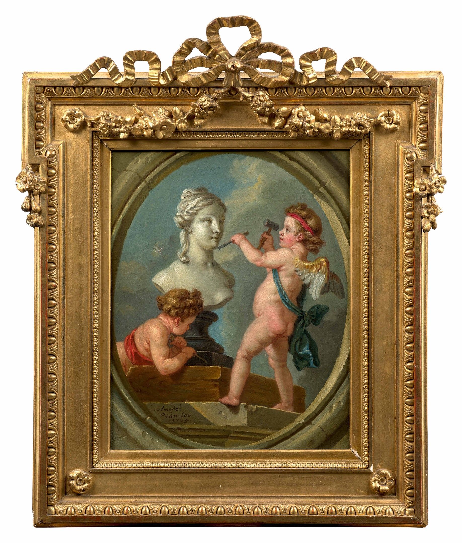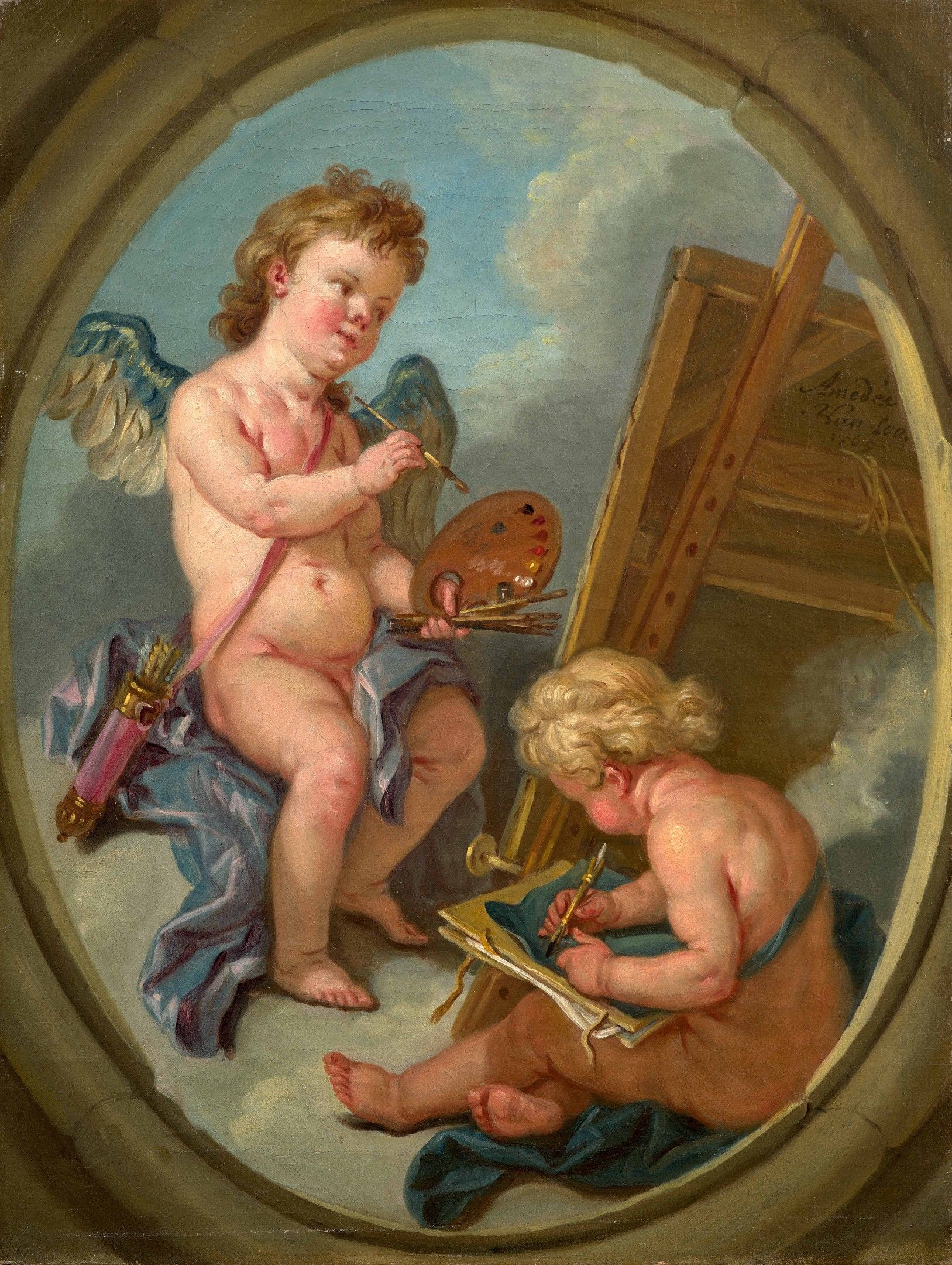 In 1752-1753, Carle van Loo (1705-1765) commissioned Madame de Pompadour to produce a series of four allegories of the fine arts (now in San Francisco) for the Salon de Compagnie at the Château de Bellevue. Distributed by engraving, these works were a great success, as evidenced by the many repeats painted1. Our paintings by Carle van Loo's nephew, Charles Amédée, were produced during the painter's second stay in Potsdam. Although their subject matter is reminiscent of Carle's work, they differ in their composition, in that they depict little winged lovers rather than children disguised as painters, sculptors, architects and musicians. We can assume that our paintings were commissioned by King Frederick II of Prussia (1712-1786) to decorate one of his residences. The fact that Carle van Loo declined Frederick II's invitation to work for him and was replaced by Amédée supports this assumption.