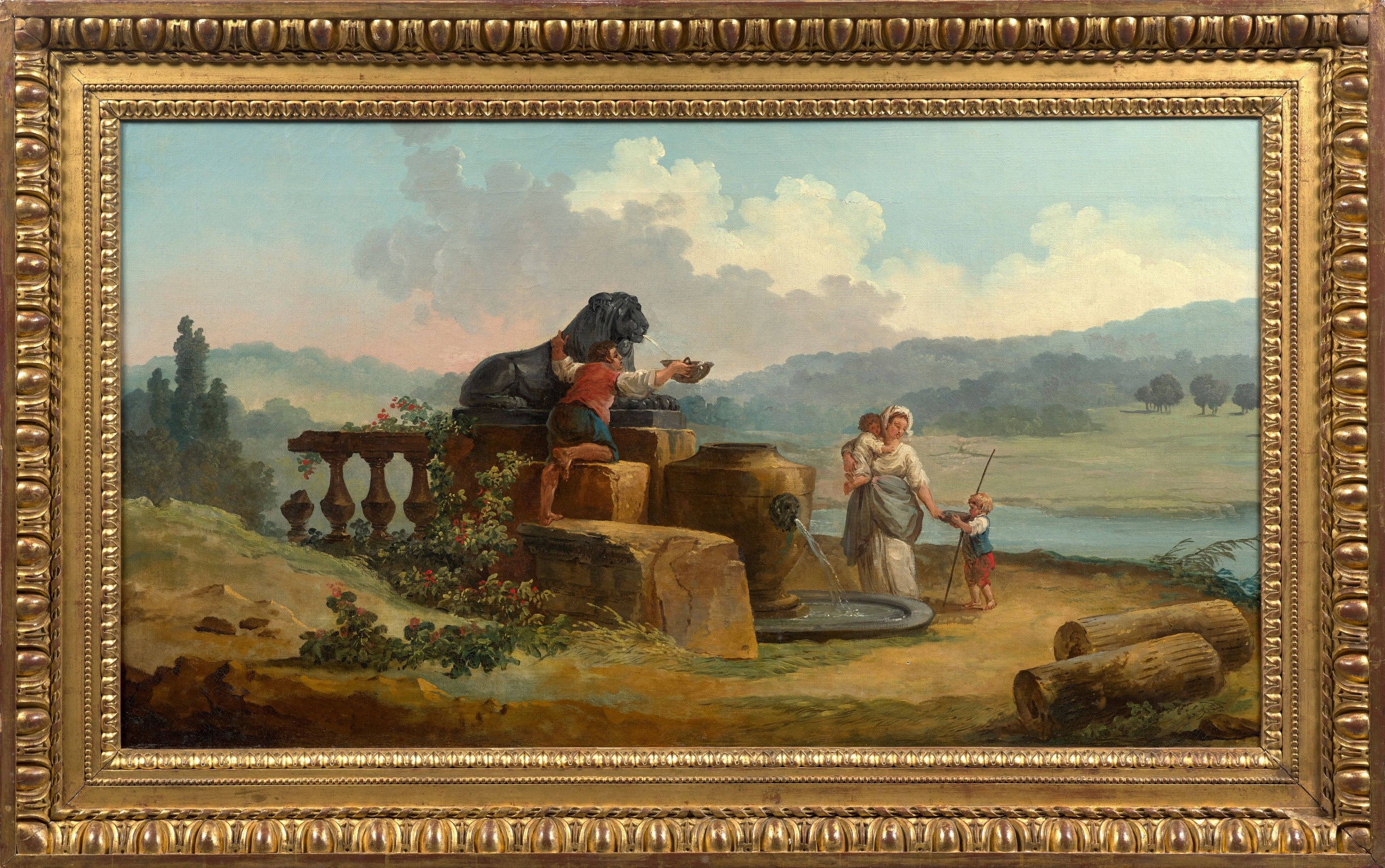The phenomena of variation and repetition run through Hubert Robert's work, and he enjoyed repeating certain motifs over and over again. The lions of the 'cordonata' are among the most recurrent subjects1. The female figure accompanied by young children and the young man filling a bowl with water are also similar to other figures in Robert's work. In particular, it evokes the washerwomen who are a feature of Robert's paintings.