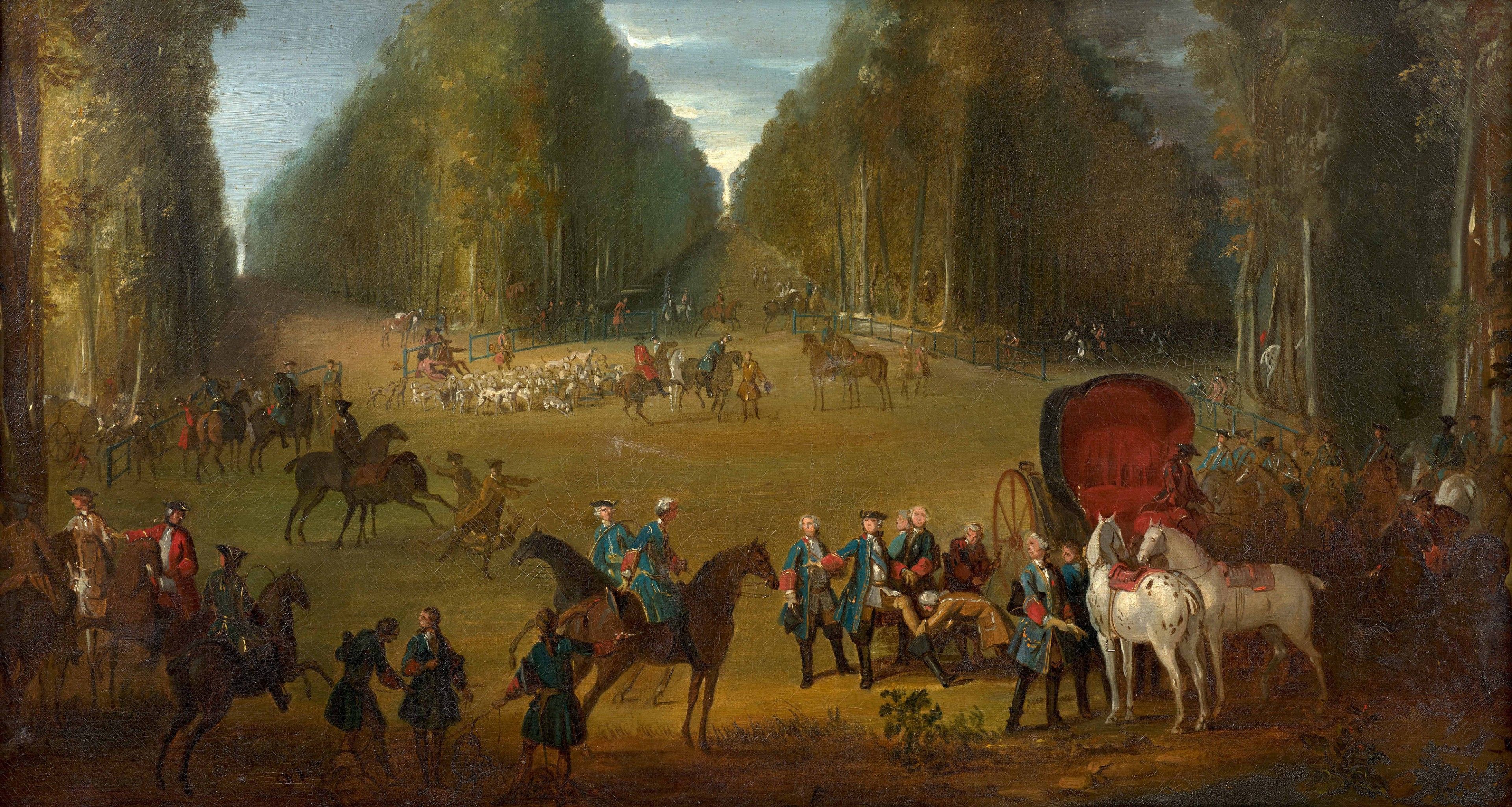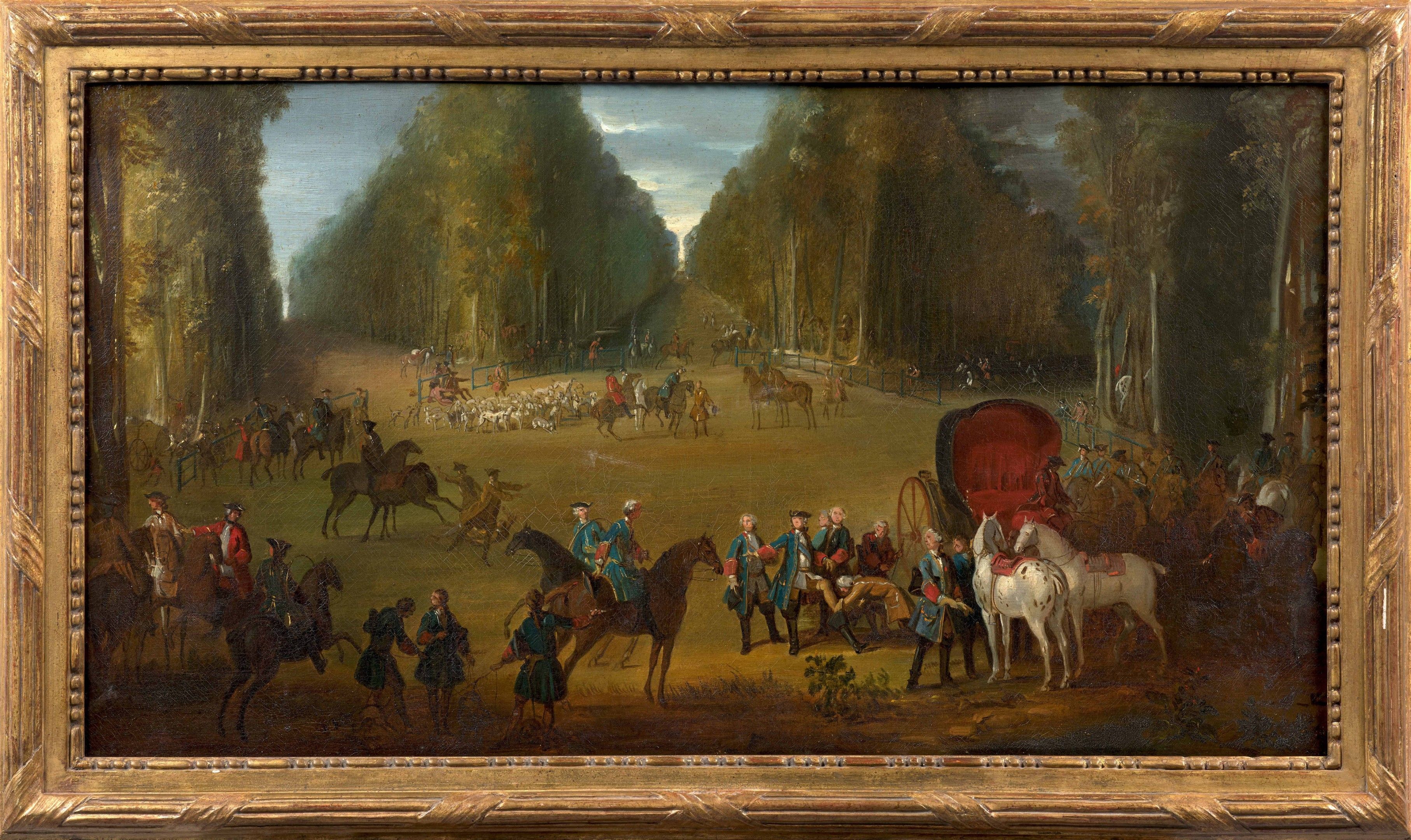 Our painting is based on the 1735 tapestry cardboard of one of the compositions that make up the suite Les Chasses royales de Louis XV by Jean-Baptiste Oudry (Musée national du château de Fontainebleau). The 430 x 673 cm tapestry is now in the Palazzo Pitti in Florence (inv. no. 608).