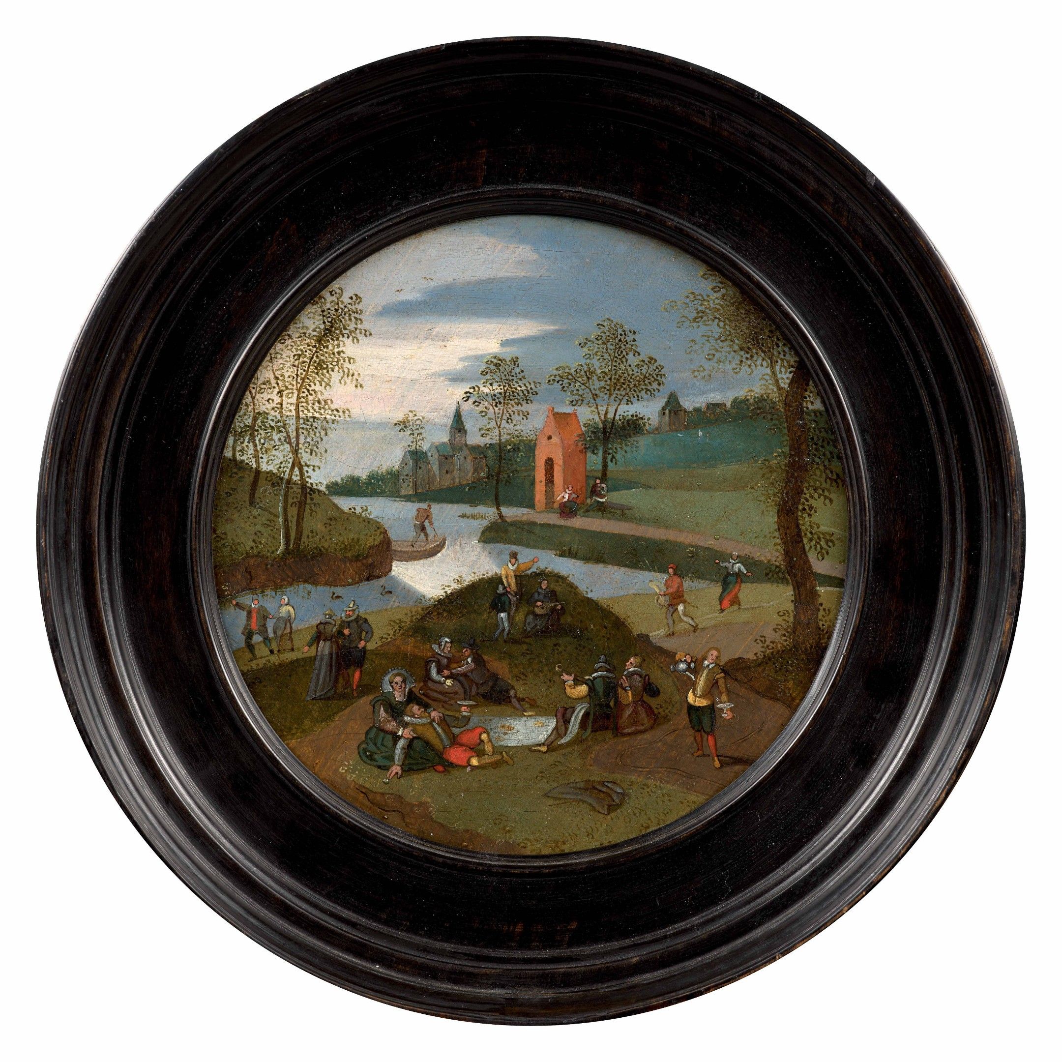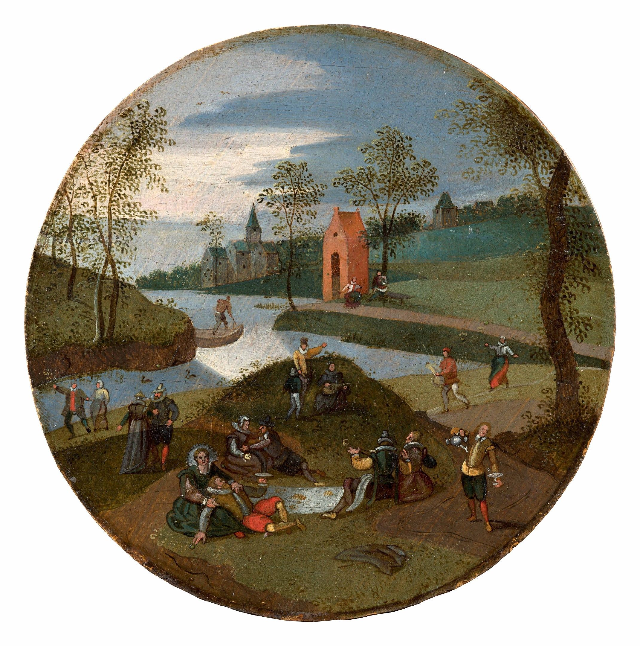 Our tondo, depicting a picnic by a river, is an illustration of the month of May. In all likelihood, our little panel is part of an incomplete series on the twelve months of the year, of which seven paintings are now known and identified. These seven paintings, described in the monographic work on Jacob and Abel Grimmer, were presented by the Galerie de Jonckheere in 1986.