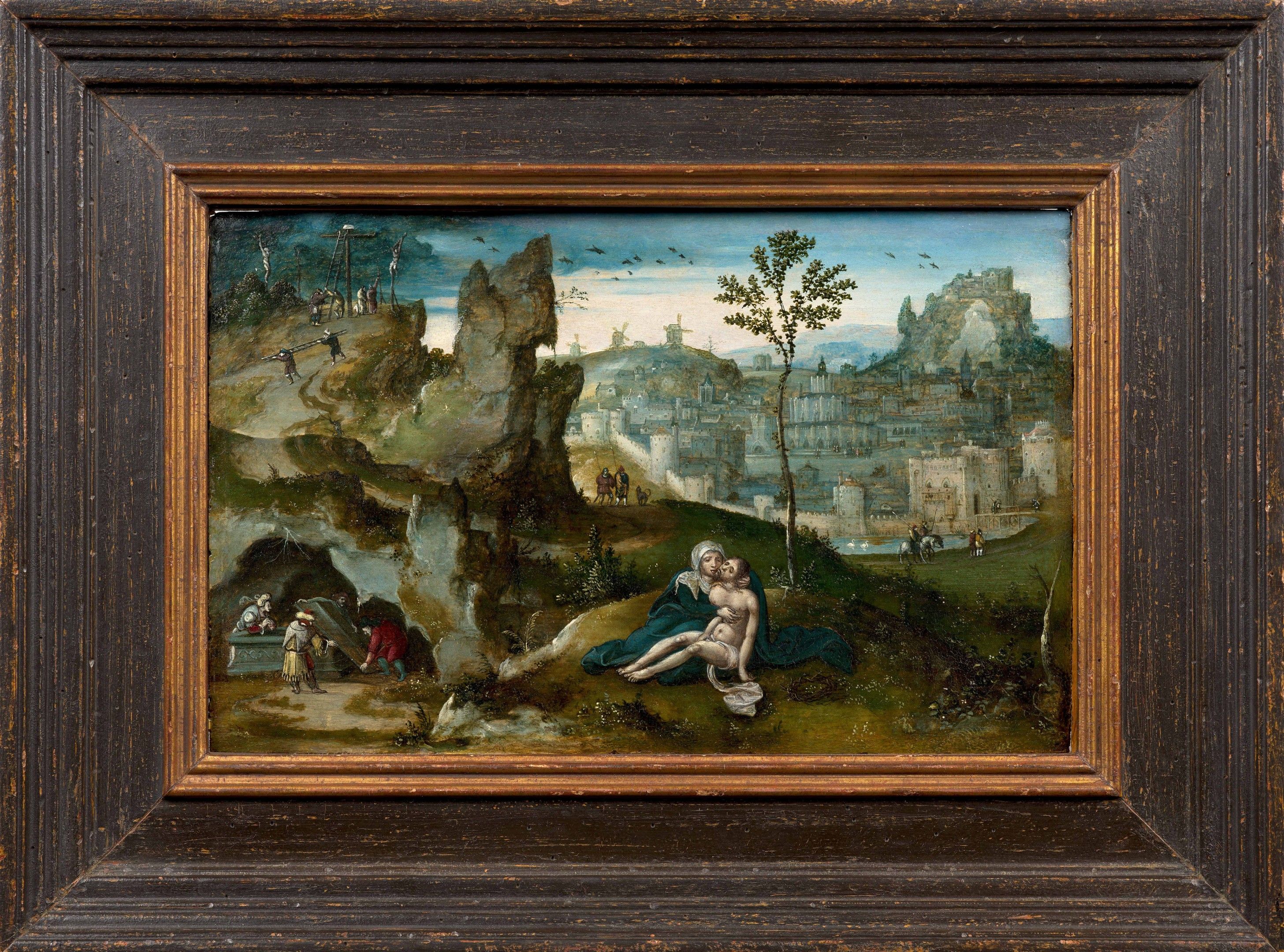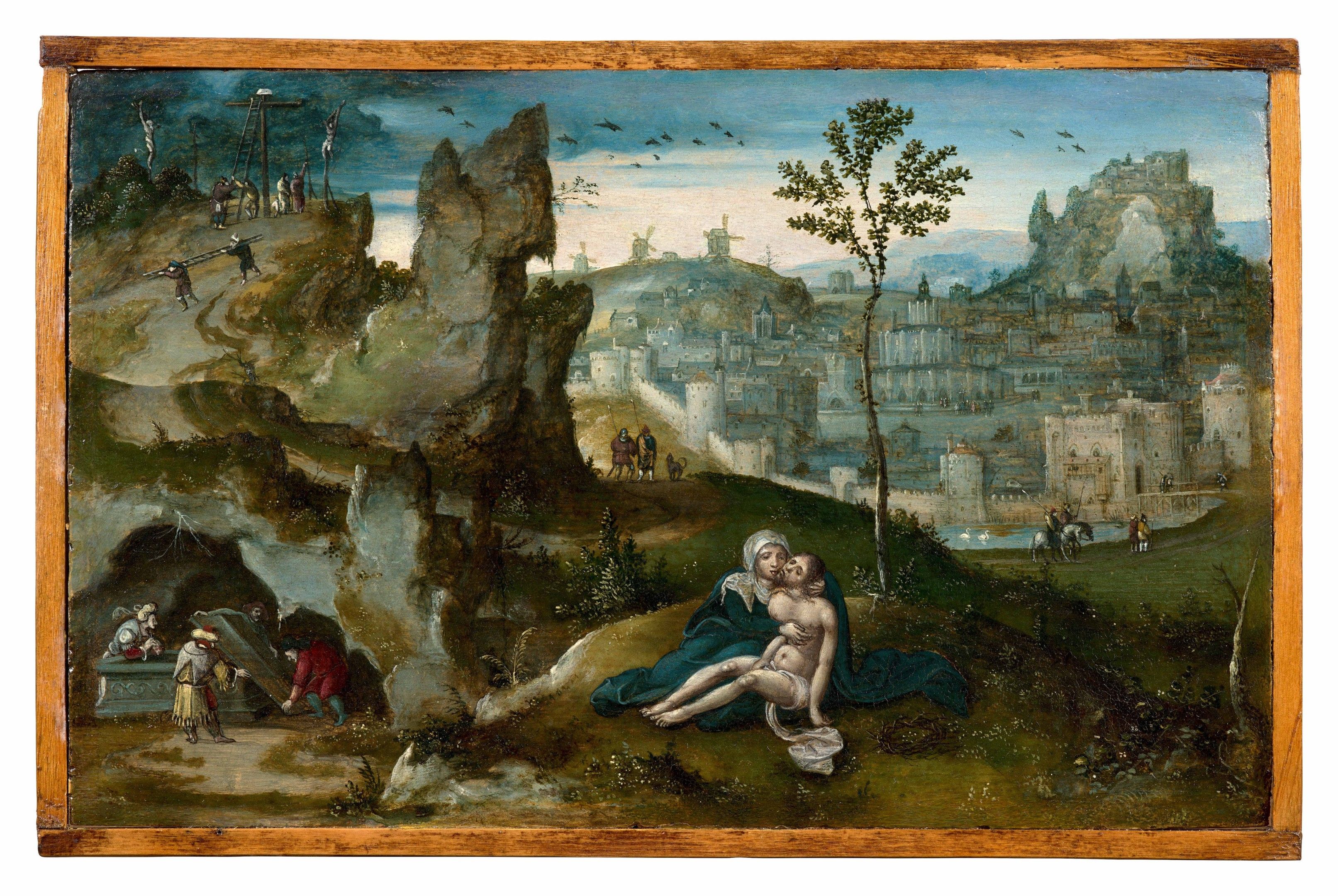 Pieta in a landscape with Jerusalem in the background, oil on panel, Netherlands, early 16th C.
