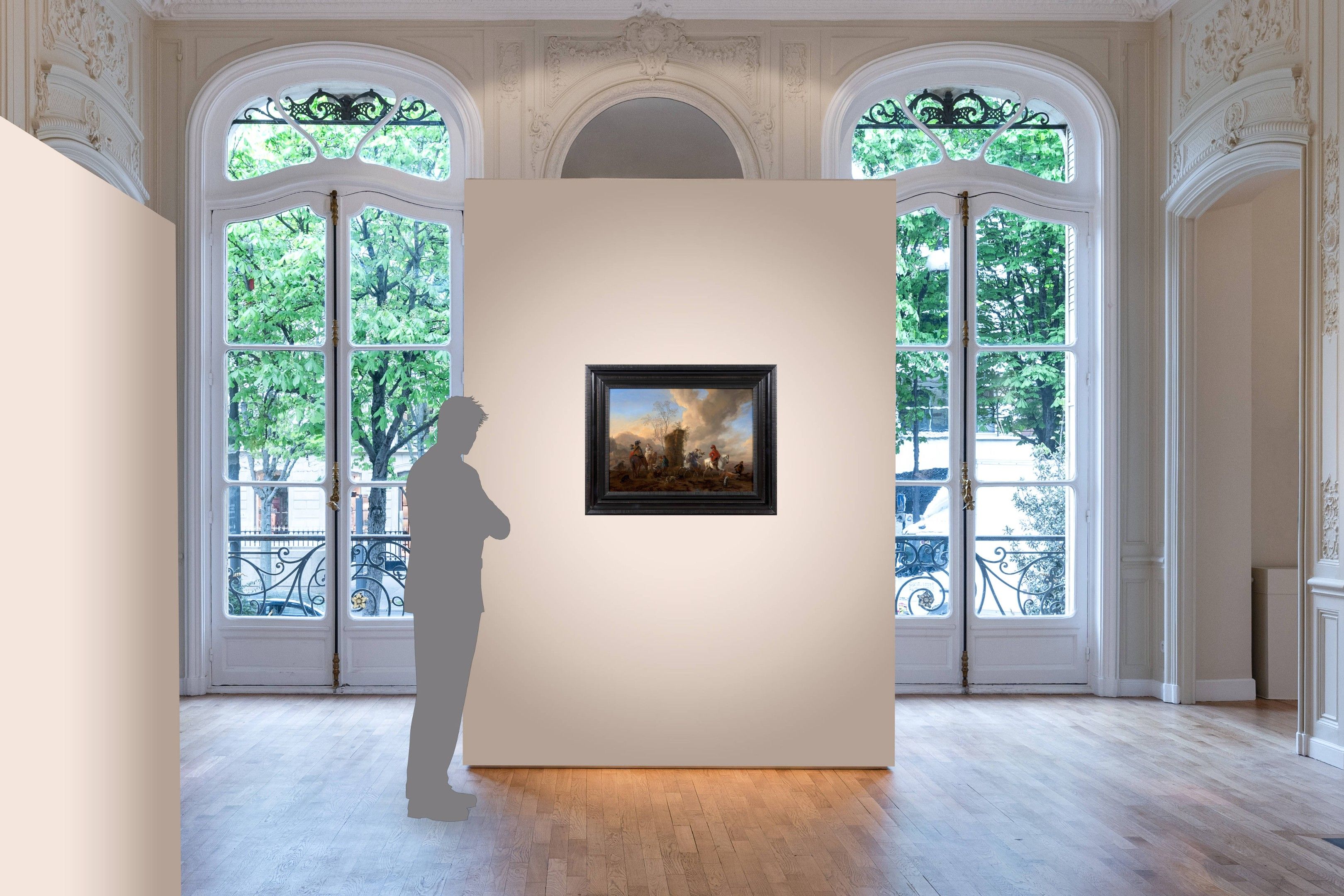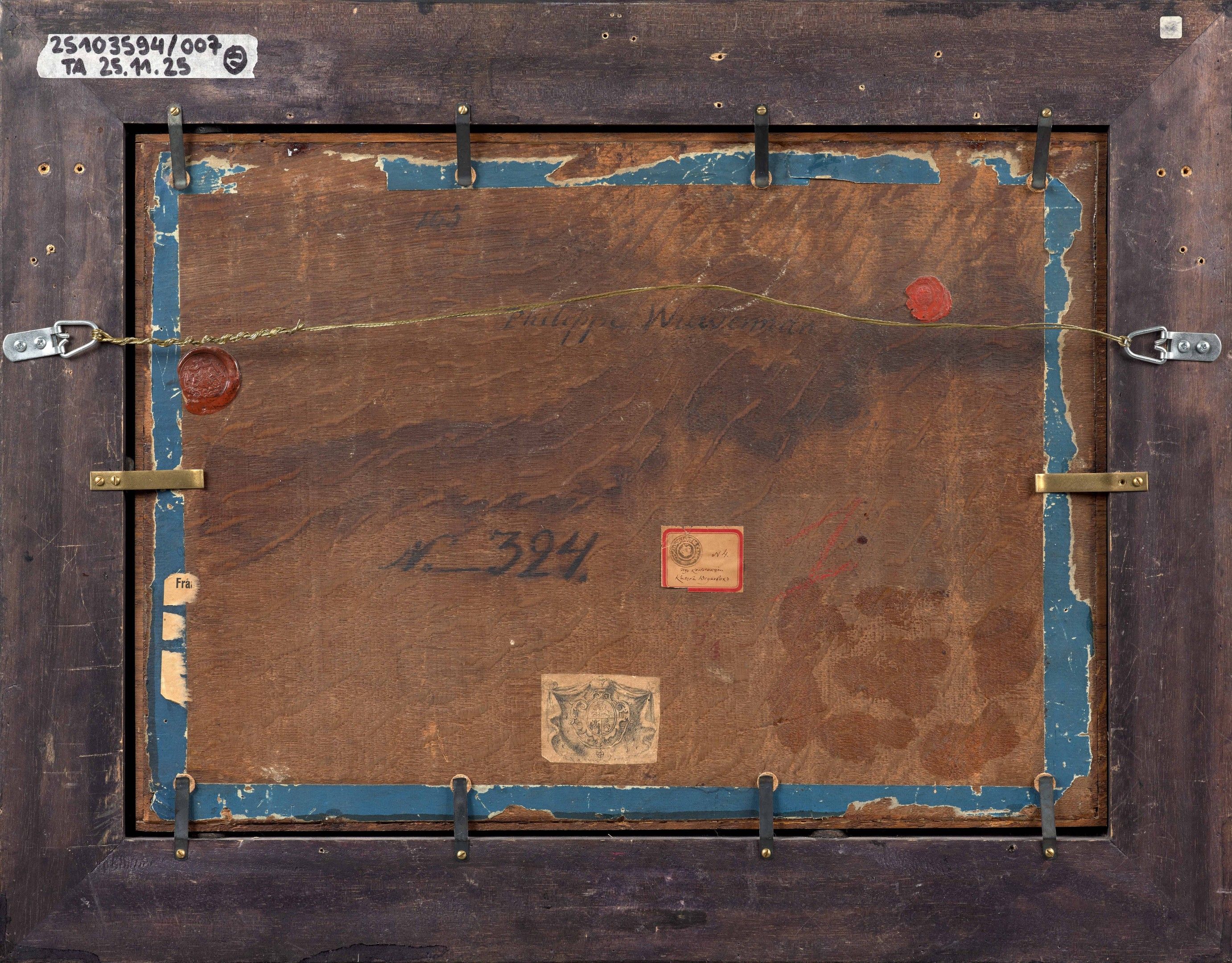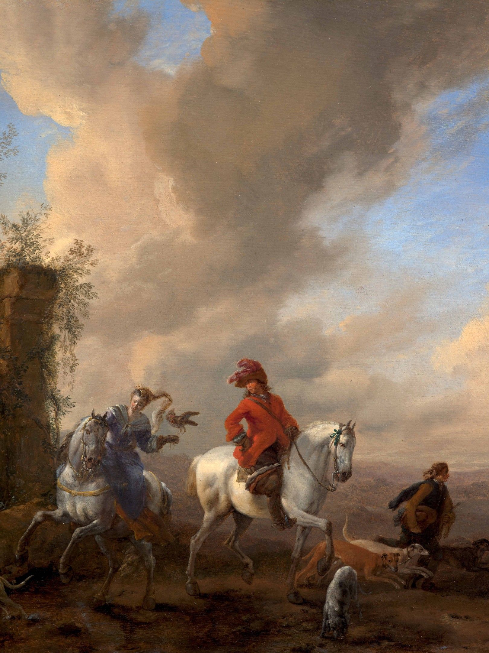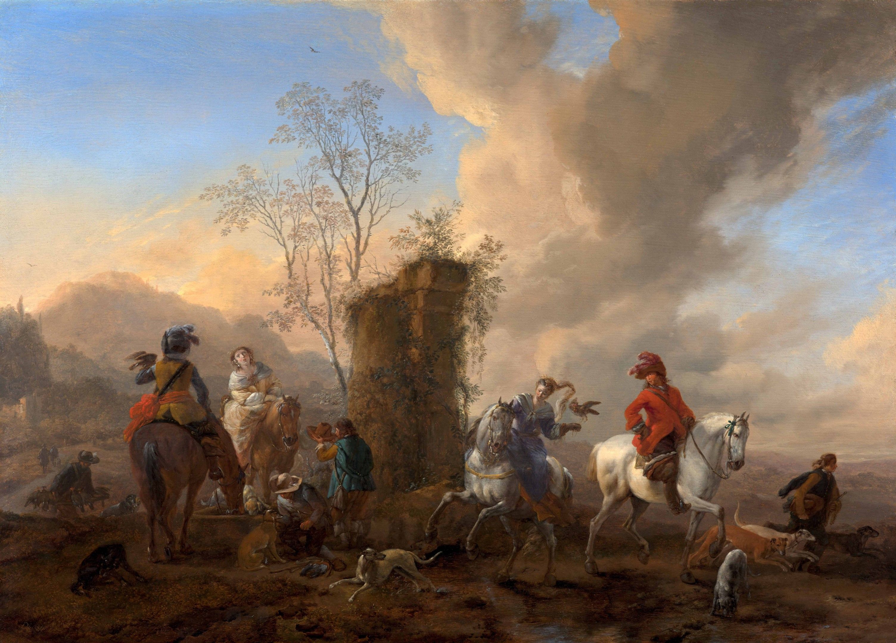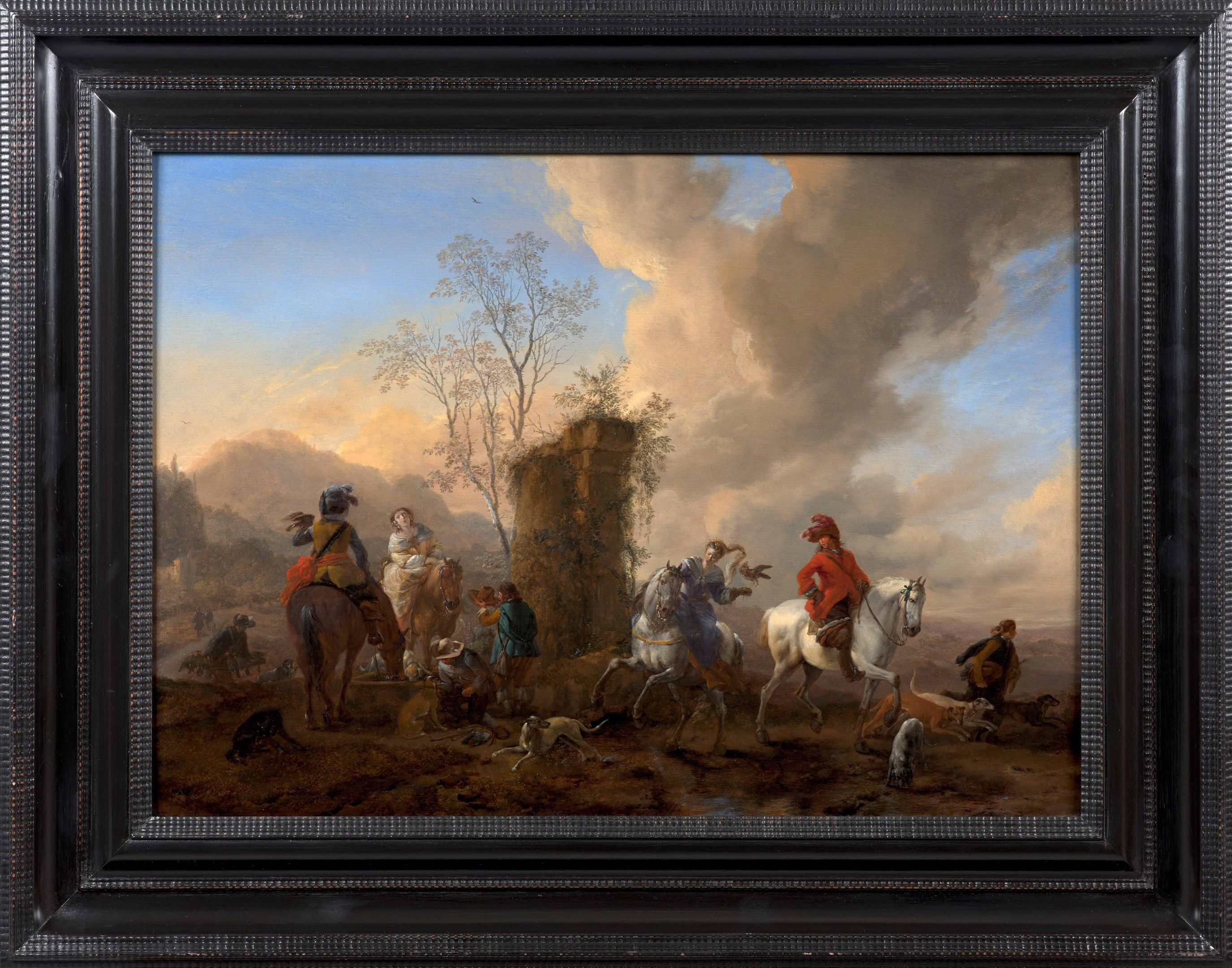Philips Wouwerman's work consists of landscapes, battles and hunting parties in which the figures' mounts play a prominent role. In addition to this output, he also painted figures for other artists working in Haarlem, such as Jacob van Ruisdael, Jan Wijnants and Cornelis Decker, to embellish their landscapes. Particularly prolific despite a relatively short career, Wouwerman left a body of work of almost 600 paintings. His favourite subjects included hunting scenes. Our painting probably dates from the end of Wouwerman's career, although it is difficult to put a precise date on it as there are no dated works from the last fifteen years of his career. The white horse motif is reminiscent of the one in the Rijksmuseum painting dated 1662-1664 (no. SK-A-484). Wouwerman also interpreted a similar subject in a painting in the Mauritshuis (Gallery of Prince Willem V, inv. no. 216), which was probably painted around 1660-1670.