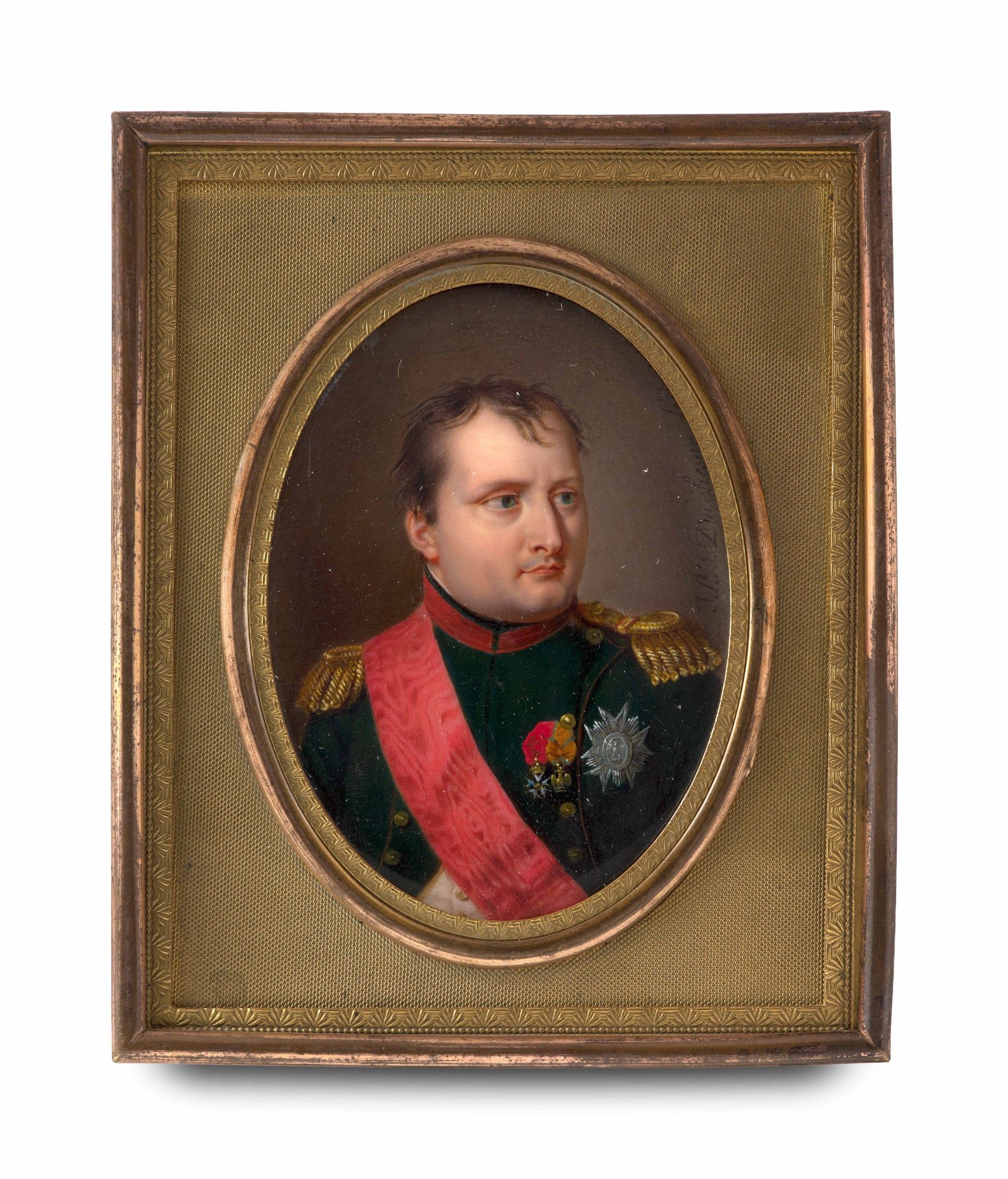 Emperor Napoleon Bonaparte in the uniform of the Horse Guard Chasseurs, gouache and gum arabic on ivory, signed and dated, by J.-B. J. Duchesne