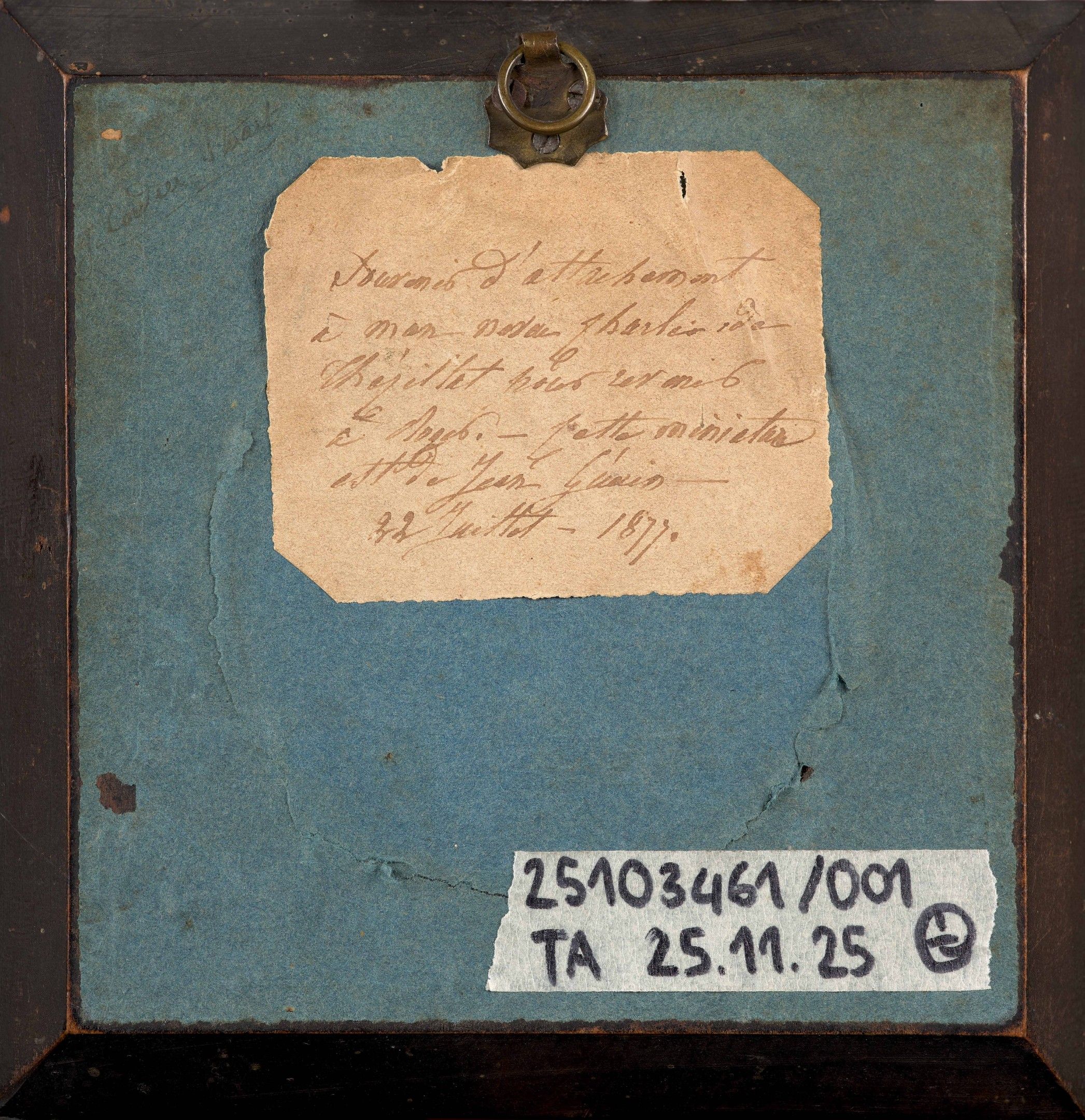 Label on verso: '(...) d'attachement / à mon neveu Charles de / (...) cette miniature / est de Jean Guérin / 22 juillet 1877'.