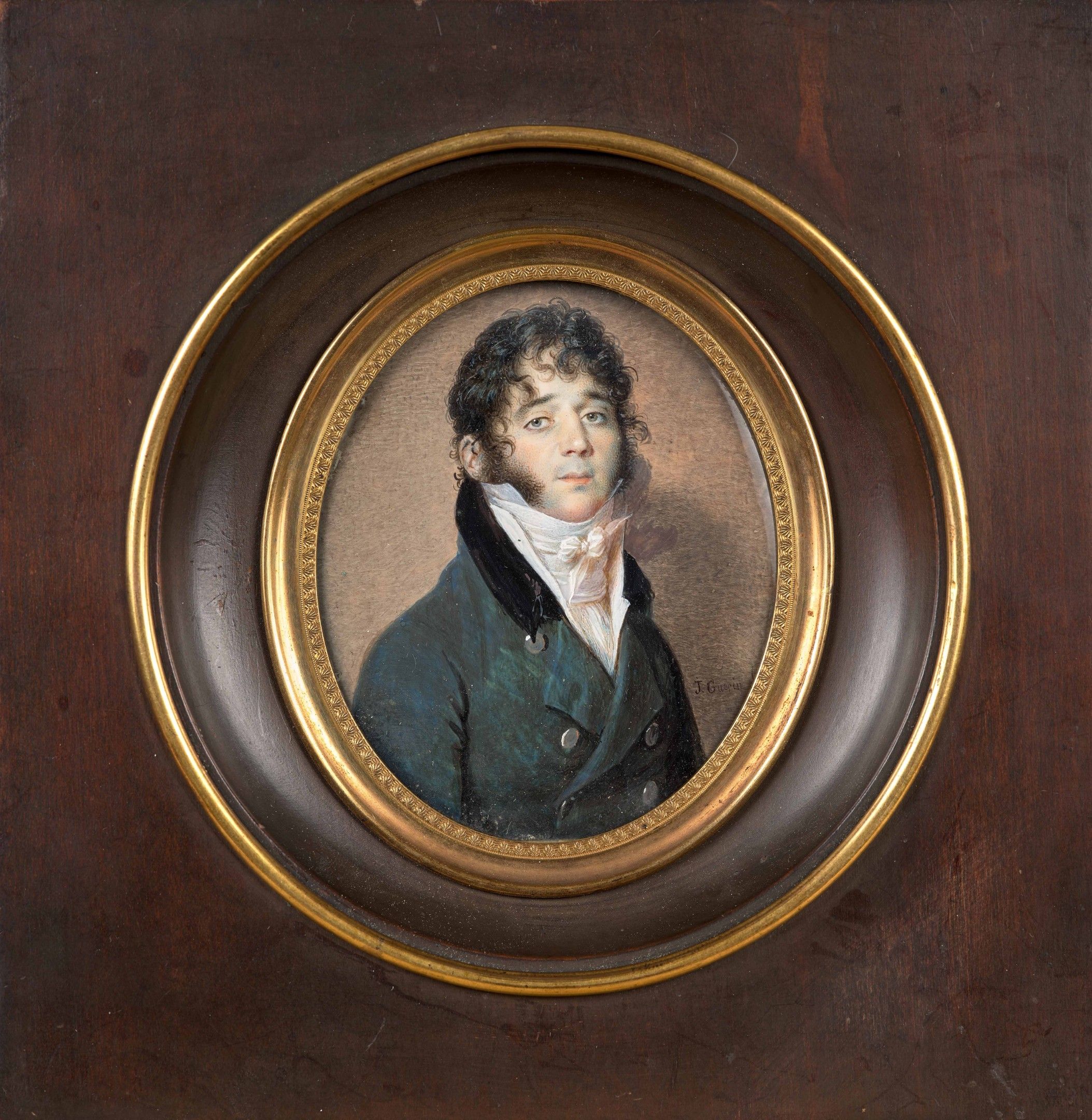 Portrait of a man in a green coat, gouache and gum arabic on ivory, signed, by J.-U. Guérin