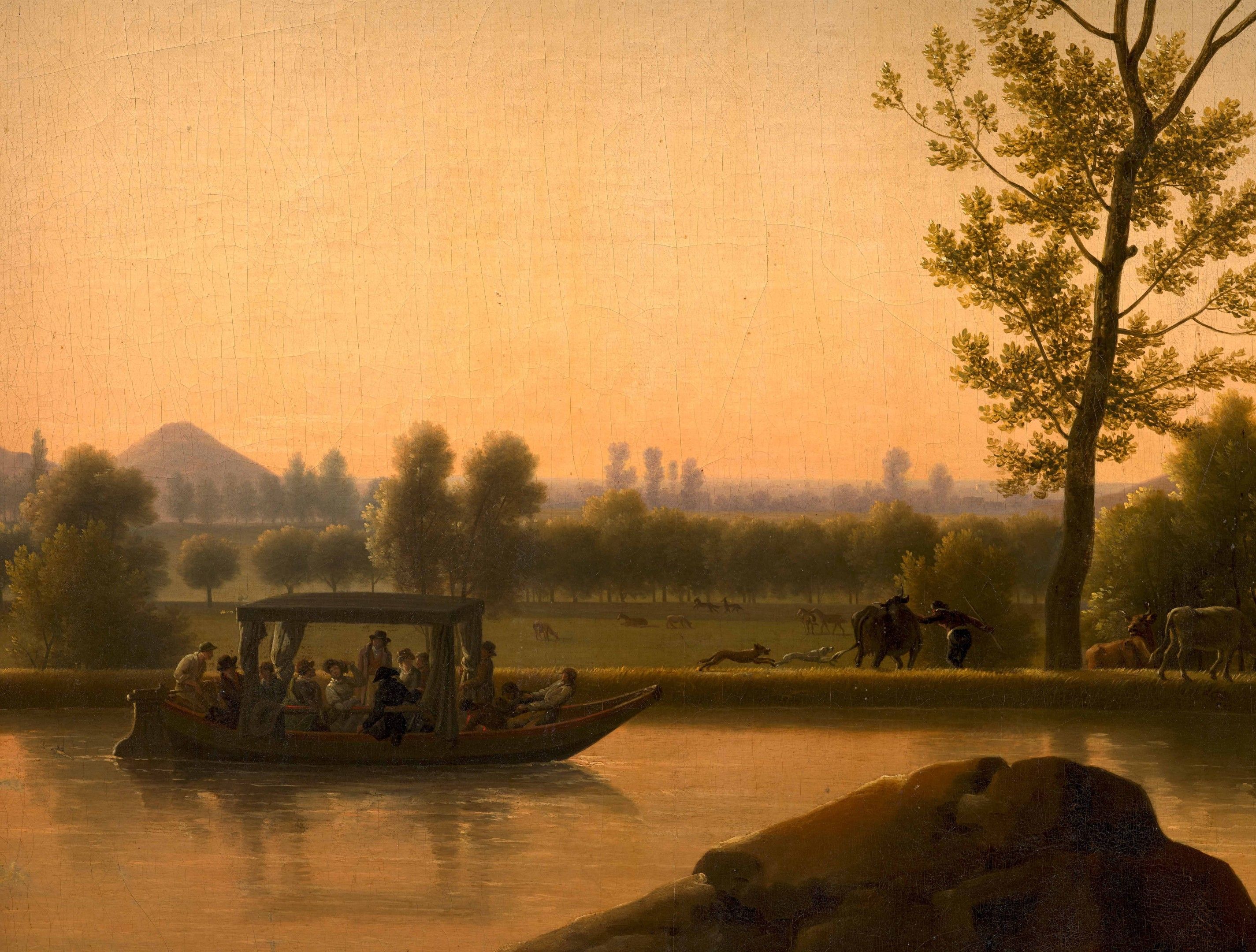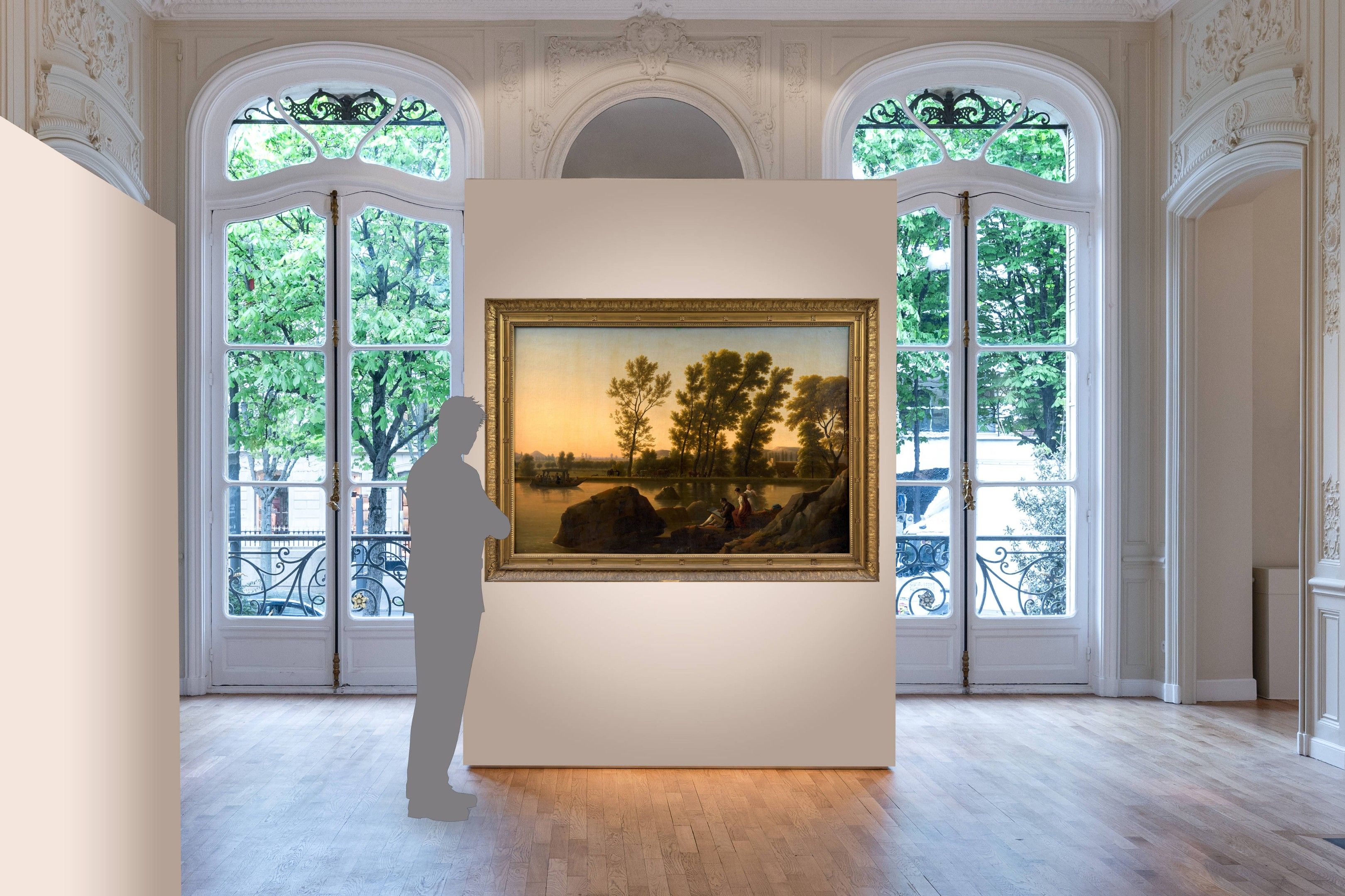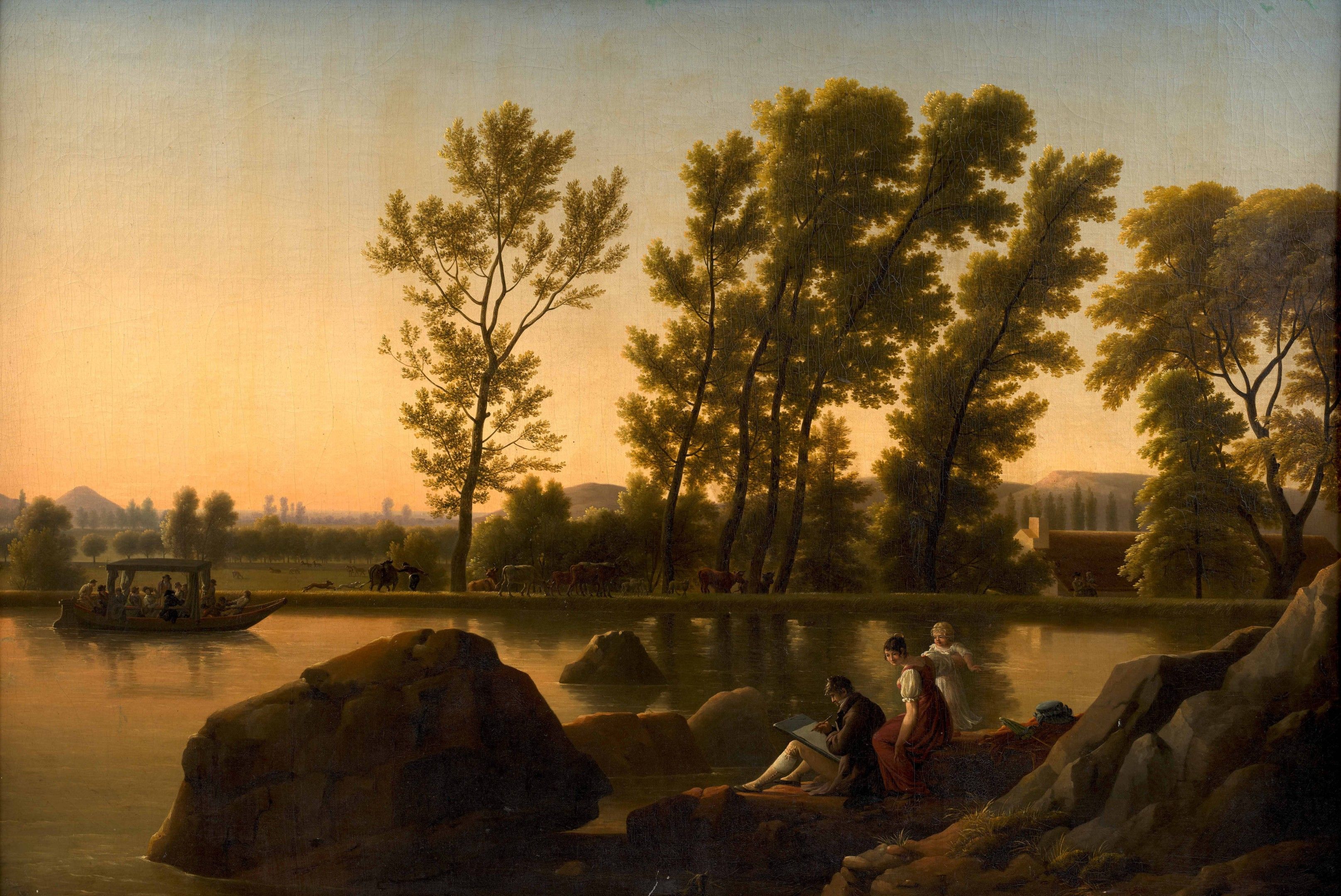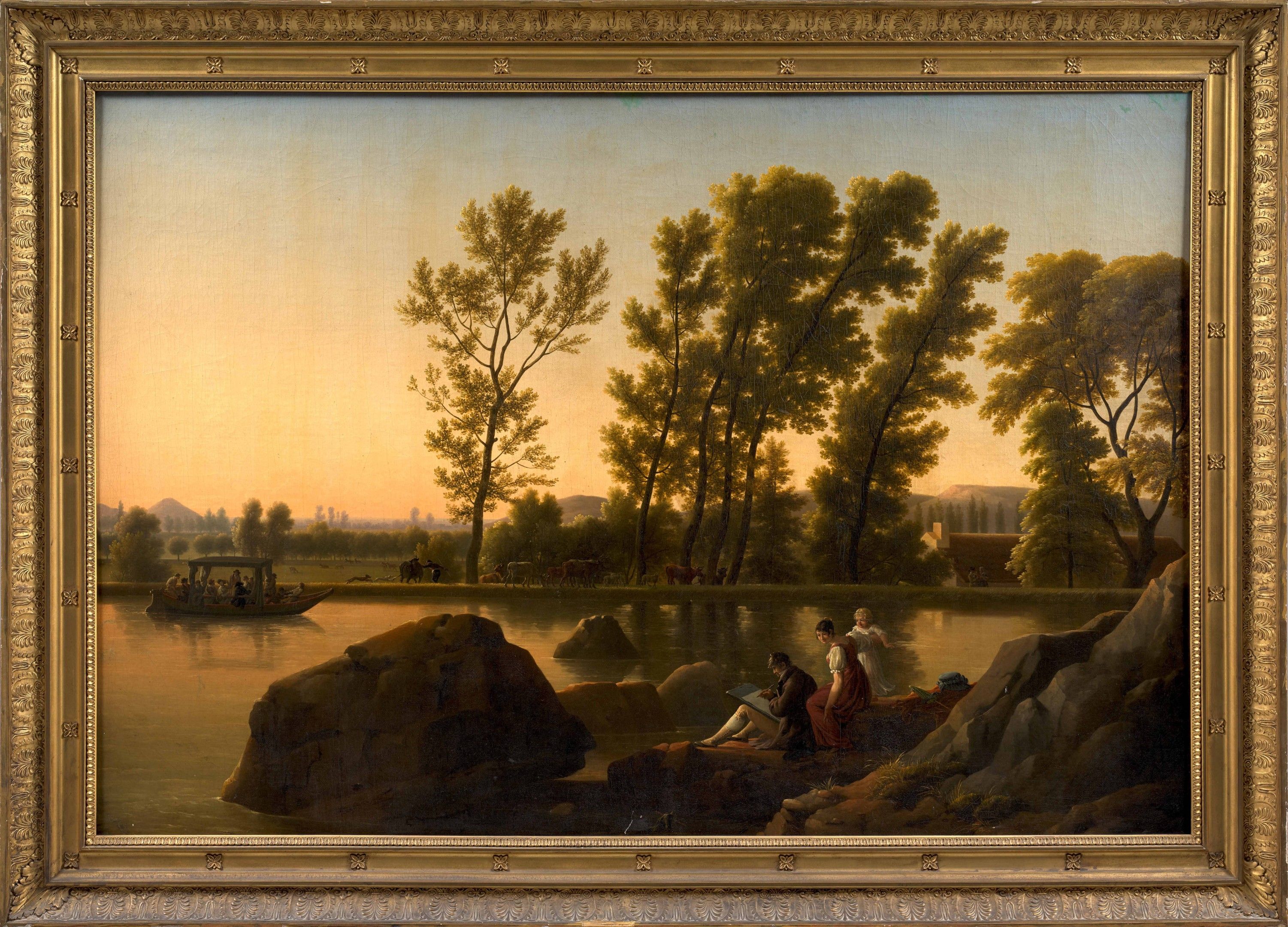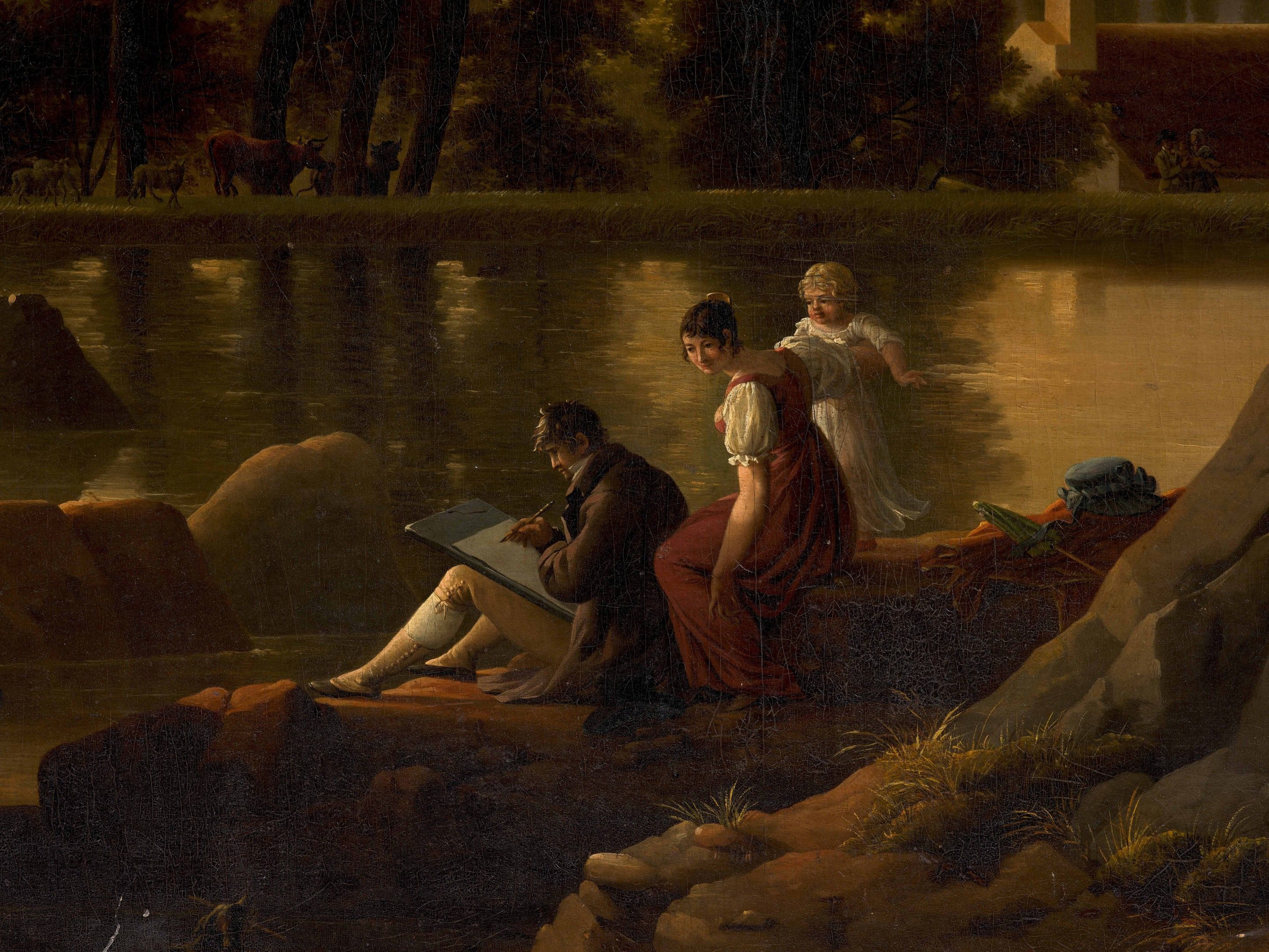 Here Bidauld produced an ambitious work that we can relate to another painting commissioned by Joseph Bonaparte, also dated 1806 and now in the Indianapolis Museum of Fine Arts.1 Joseph Bonaparte's country residence from 1798 onwards, the château and grounds of Mortefontaine, witness to the marriage of Joachim Murat and Caroline Bonaparte, were much admired by artists such as Elisabeth Vigée-Lebrun and Hubert Robert. Bidauld, the Bonapartes' favourite landscape painter, visited regularly and began a series of paintings for the sovereign at the beginning of the 19th century. We think that the artist's subject here is the shores of the lake, a favourite theme of his. The diaphanous light bathes the composition, accentuating the shimmer of the trees with small touches on the foliage. On the right-hand edge, the painter, perhaps Bidauld himself, fixes the memory of that day on paper. The composition is enlivened by small anecdotal details. The landscape, which is not an absolutely faithful representation of the park, seems vast to us and the atmosphere is almost contemplative for a painting that was intended above all as a happy testimony before the fall of the Empire a few years later. In 1831, we find a similar theme in a work presented at the Salon, this time depicting the park at Ermenonville, just a few kilometres away. This painting illustrates the attraction and admiration his work aroused among his contemporaries. At the Salon of 1806, the critic Pierre Jean Baptiste Chaussard summed up the painter's strengths and weaknesses: "(...) The details are perhaps rendered with too much care and accuracy, which makes them dry, in addition to the fact that many of them must be lost at a certain distance, but his foliage is broad and affected, the factories are well lit and the tone is brilliant and silvery" 2.