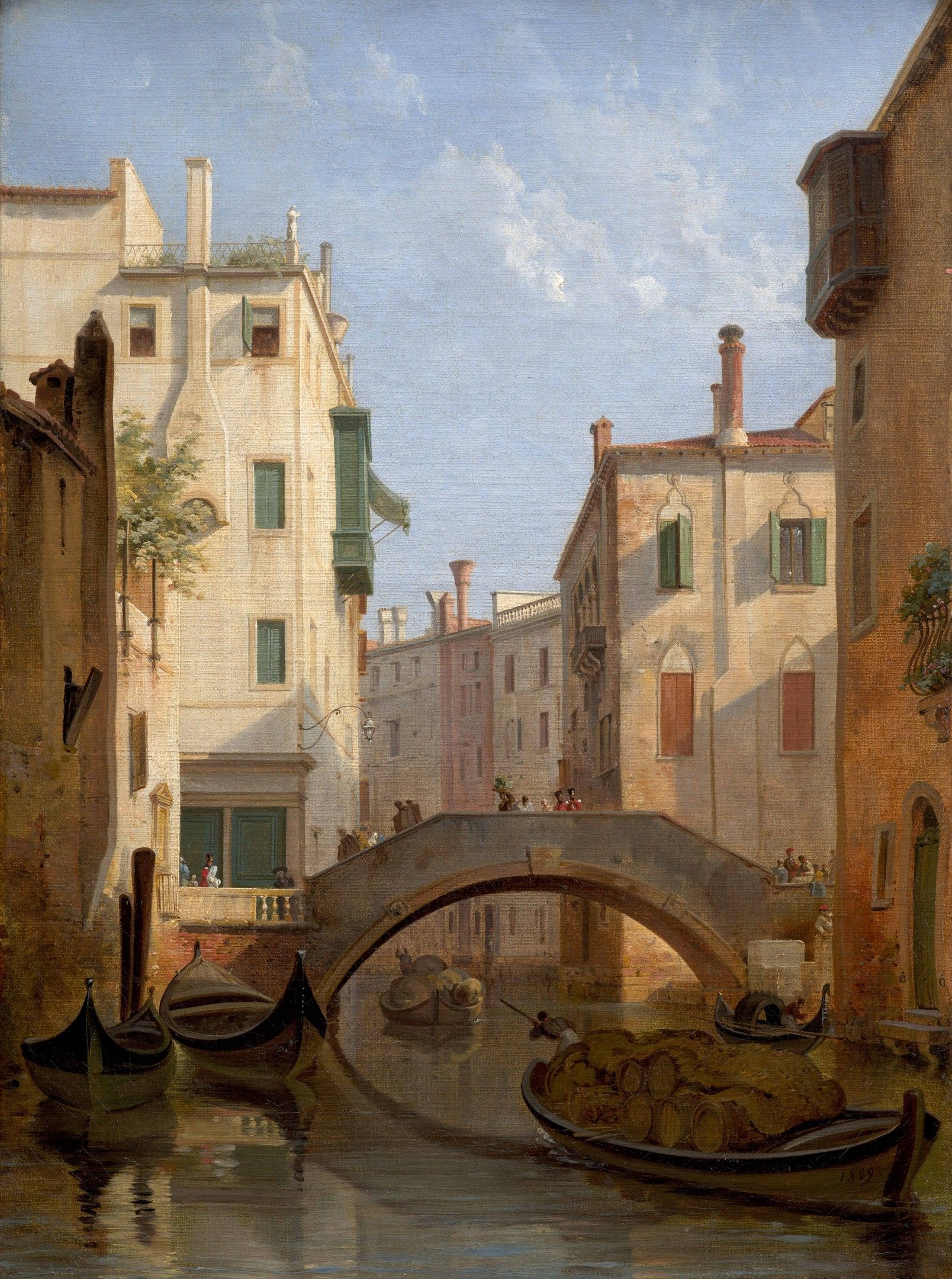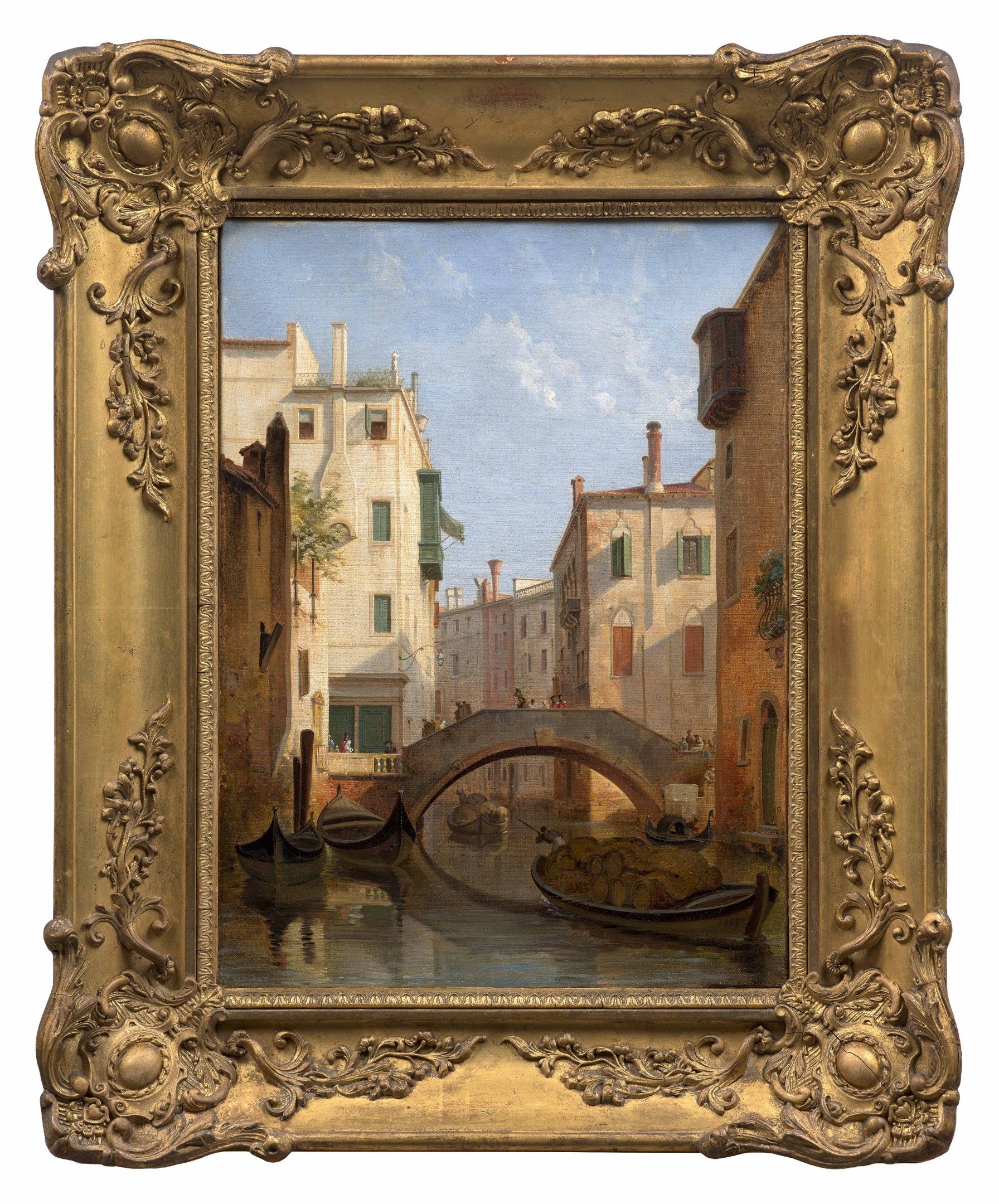 Well-known for his generous donation of objets d'art and antiques to the Musée des Beaux-Arts in Angers, Lancelot Théodore Turpin de Crissé was also a talented painter who produced numerous views from life during his many visits to Italy. Working alongside his godfather, Count Marie-Gabriel-Florent-Auguste de Choiseul-Gouffier (1752-1817), the young Turpin de Crissé discovered Rome and the surrounding area, Florence and Naples. From 1806, he began exhibiting his landscapes and historical views at the Salon. In the Serenissima, which he visited for a second time from 1829 to 1838 as chamberlain to Empress Joséphine de Beauharnais, Turpin de Crissé sketched the daily life of the Venetians with passion. Here, he depicts the bustle of a varied crowd near the canals and on the bridges that span them, and brilliantly captures the movement of the gondoliers as they skilfully manoeuvre their barrel-laden boats. At the time of our painting, in 1829, he was appointed a member of the Venice Academy of Fine Arts. Our painting appears to illustrate the painter's pictorial research during his Venetian sojourn: the singular viewpoints afforded by the city's original topography, and the contrasting light effects on the buildings created by the narrow canals. This rather low viewpoint, perhaps captured from a gondola, can also be seen in the View of the church of Santa Maria dei Miracoli in Venice (Angers, Musée d'Angers, inv. MTC 35). His taste for light, his rendering of masses and planes, and his sense of the articulation of volumes can also be seen in other representations of the canals of Venice, such as the painting presented for sale at Drouot on 25 May 1984 (lot 111).