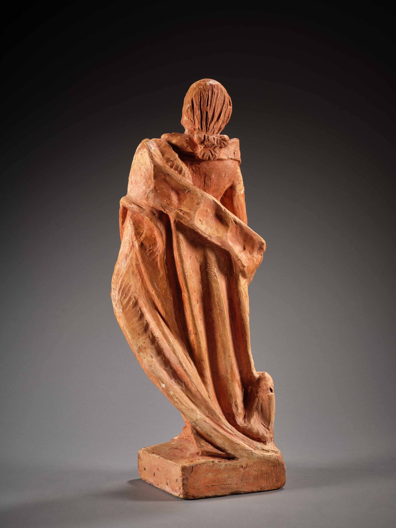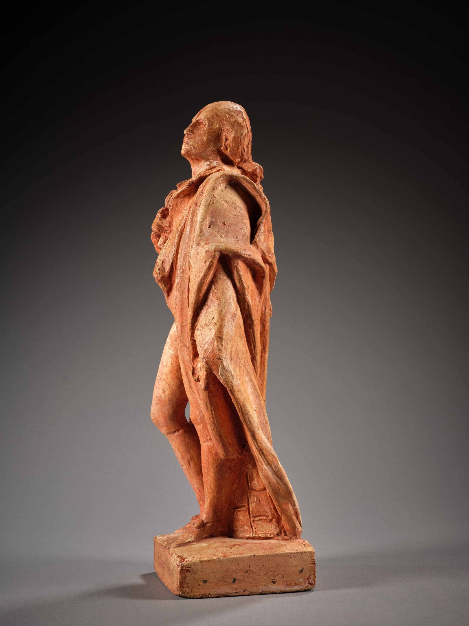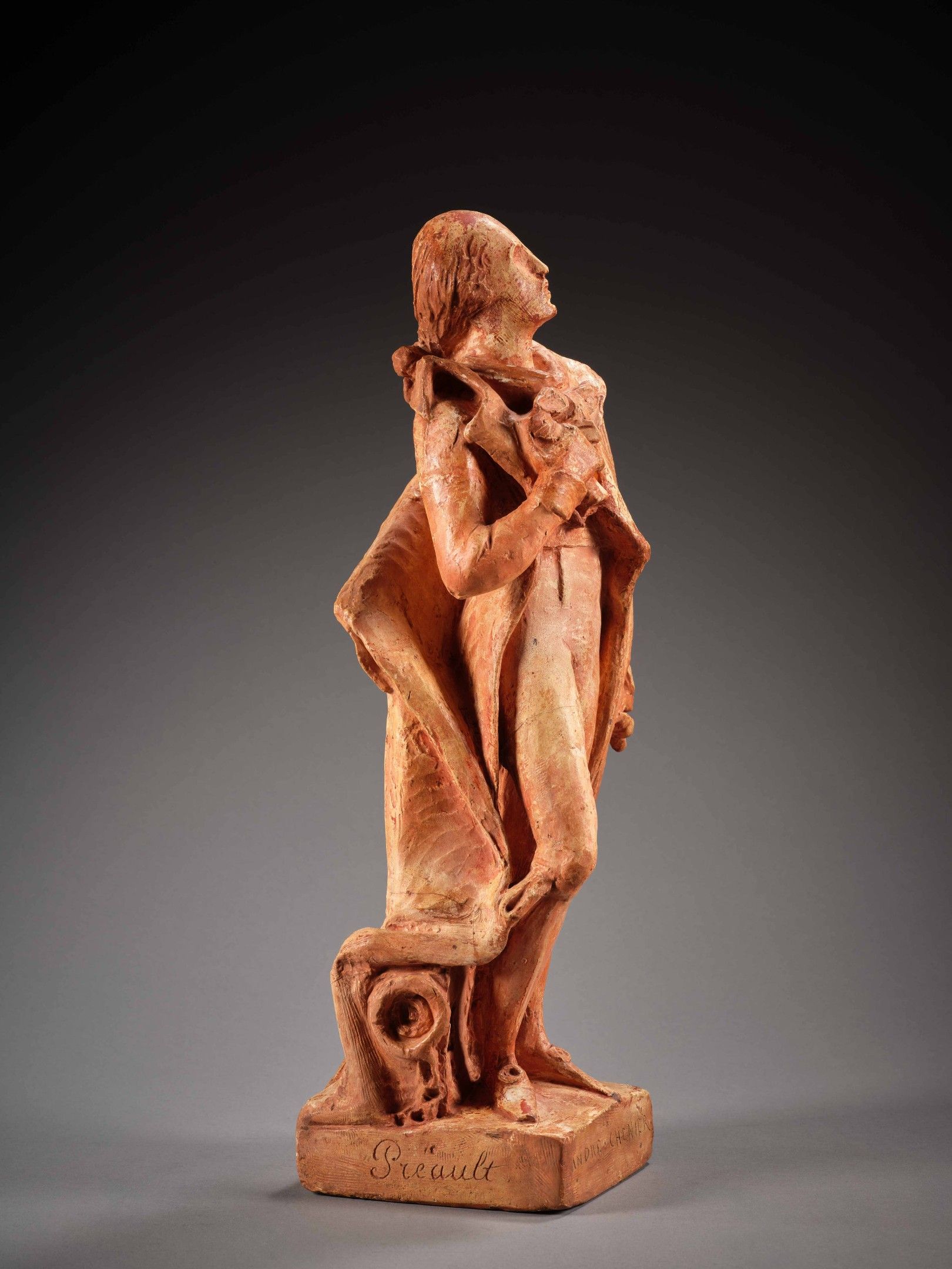 This preparatory model in patinated plaster of the poet André Chénier is a rare testimony to the history of the Palais du Louvre. It was made by Auguste Préault in the context of the major building project commissioned by Napoleon III and directed from 1854 onwards by the architect of the Louvre, Hector Lefuel.