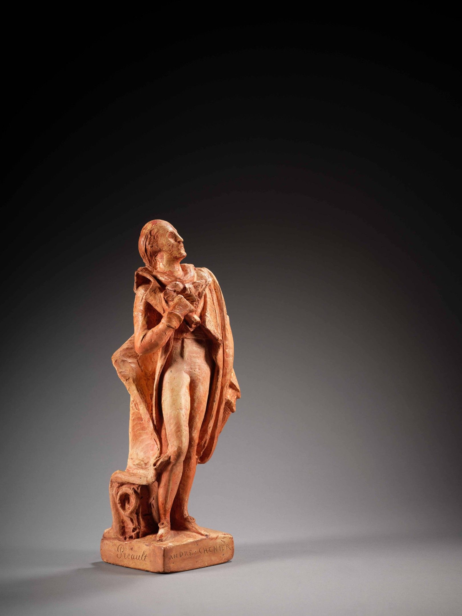 The poet, dressed in Directoire period costume, holding a rolled-up piece of paper in his right hand, standing firmly on his two feet with his head slightly raised, seems to be declaiming verses from his famous "Jeune Tarentine". The facial features are not yet shaped.