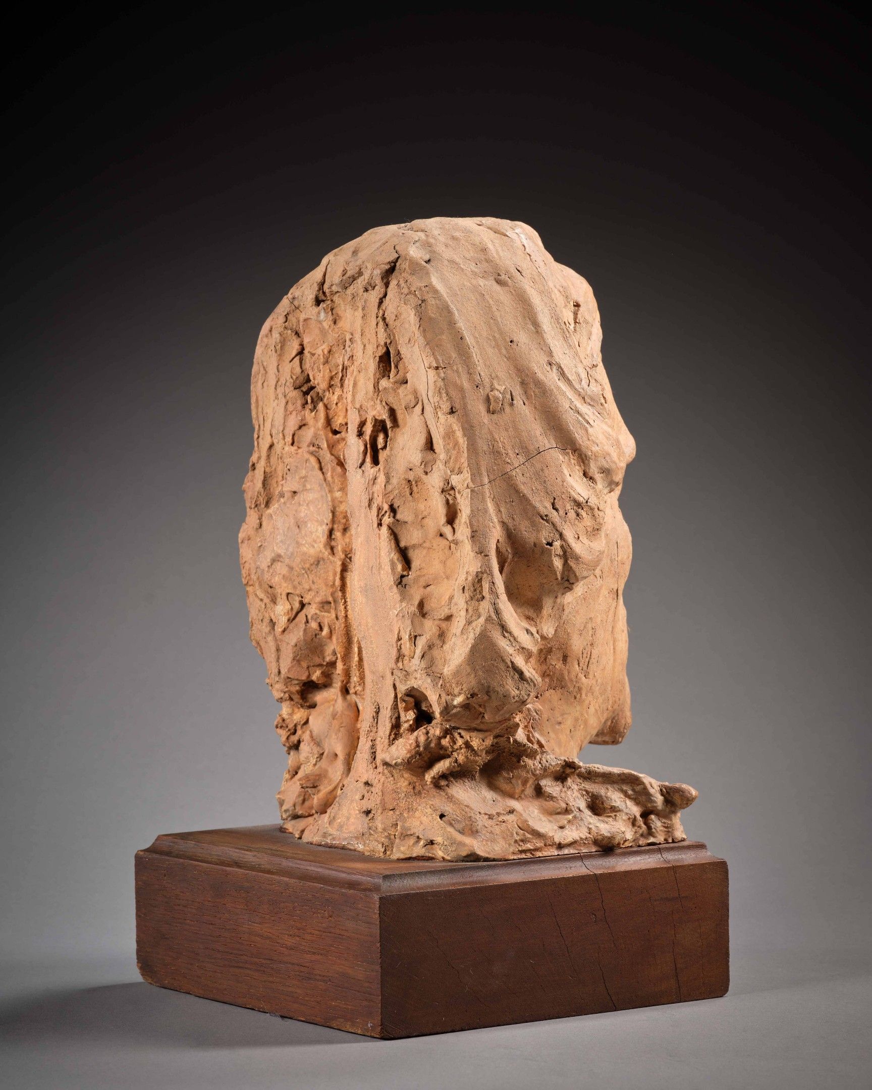 The marble originally commissioned was never made, for reasons that still elude us. All that remains of this project is our bust, which is closer to a modello than to a perfectly finished work. Our object, like a preparatory sketch, brings the model to life with an irregular, vibrant surface, an effect accentuated by the marks, still visible and sometimes brutal, of the sculptor's work. The model's personality - conquering, confident, with a piercing gaze - is brilliantly captured by our artist, whose admiration for Delacroix is undeniably reflected in our portrait.