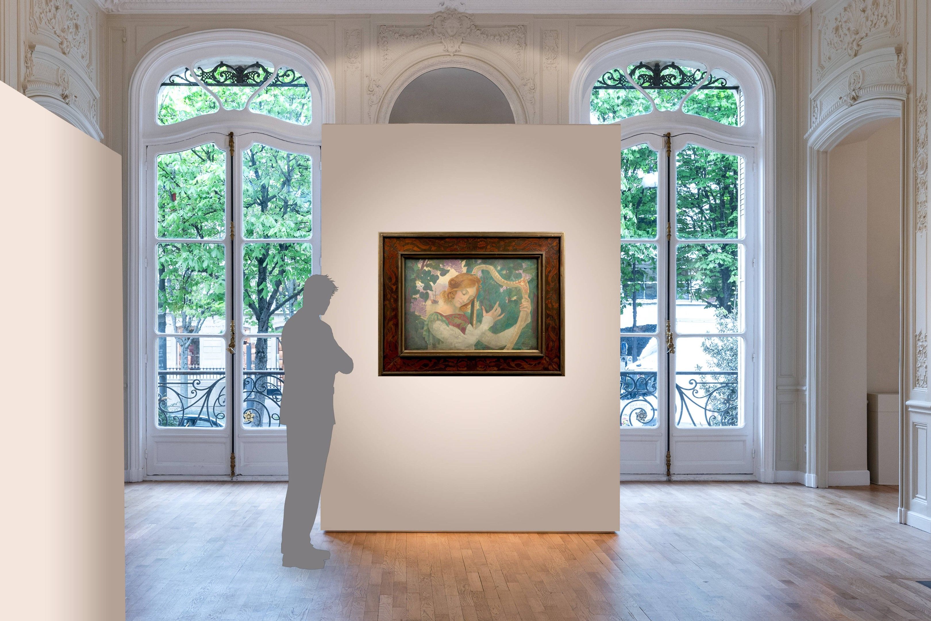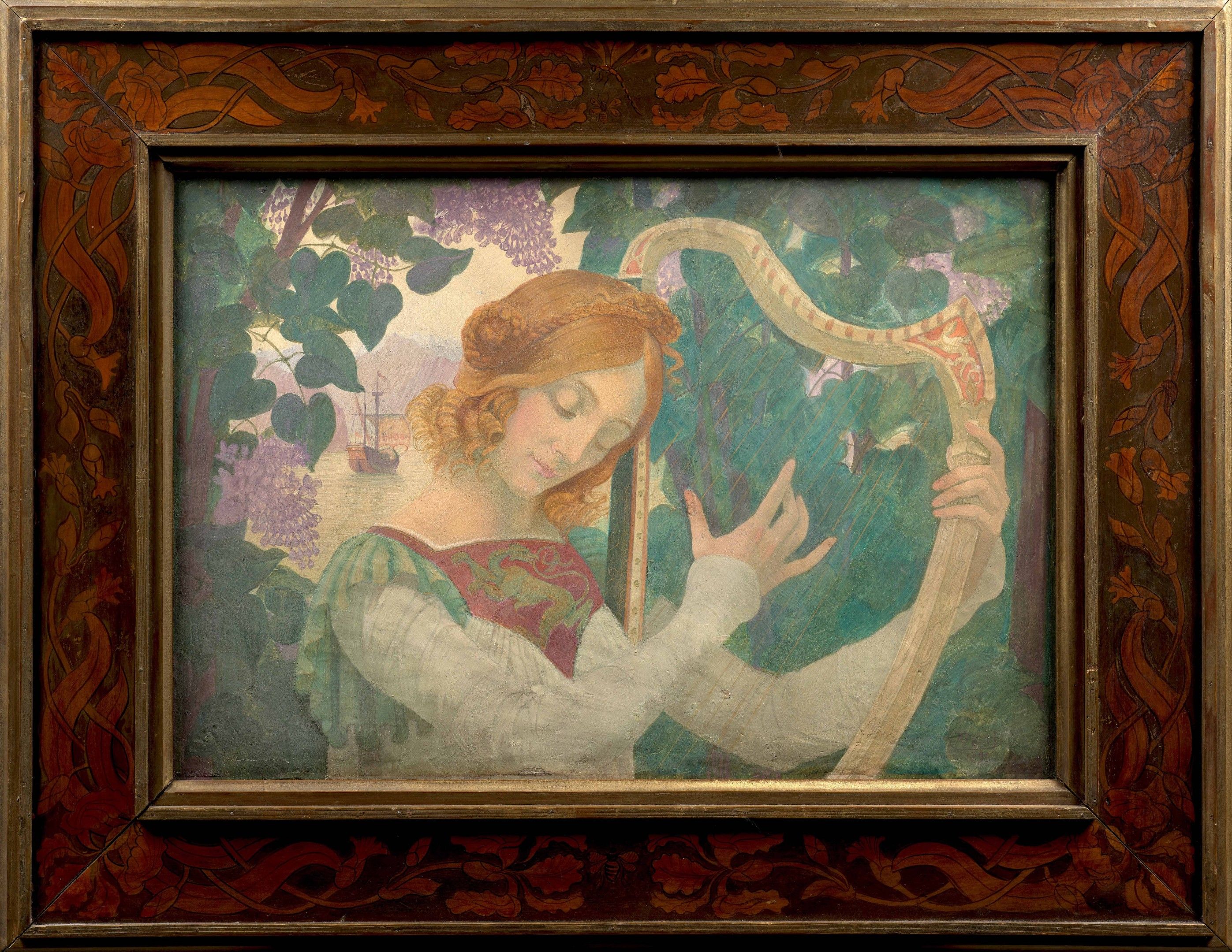 Our painting, precisely dated 1895, a few months after his return from Italy, fits in perfectly with Armand Point's new approach to painting. It is also part of a series of works by the artist based on the model of the woman with the lyre. At the Salon de la Rose-Croix in 1896, our artist exhibited Avril, a full-length version derived from our composition, also painted in fresco in 1895, acquired directly by the State and now conserved - unfortunately in a very poor condition - at the Musée d'Orsay (Inv. RF 1979 25, fig. 1). An ambitious preparatory drawing is also known, exhibited at the same Salon and sold several times. Unlike the Musée d'Orsay version, our painting, preserved in its original frame invented by the artist, comes to us in a marvellous state of conservation, quite rare for works respecting this particularly fragile fresco technique.