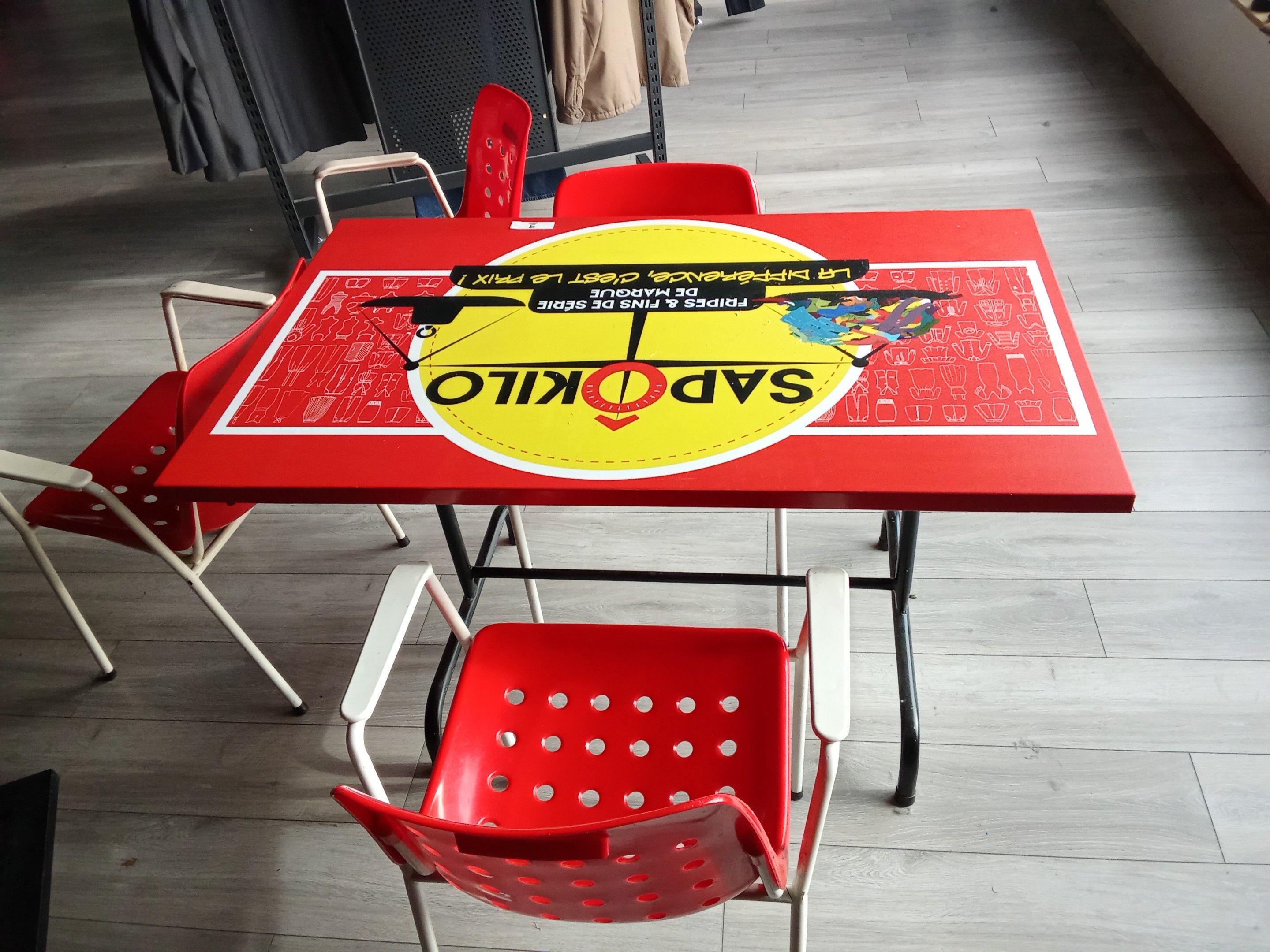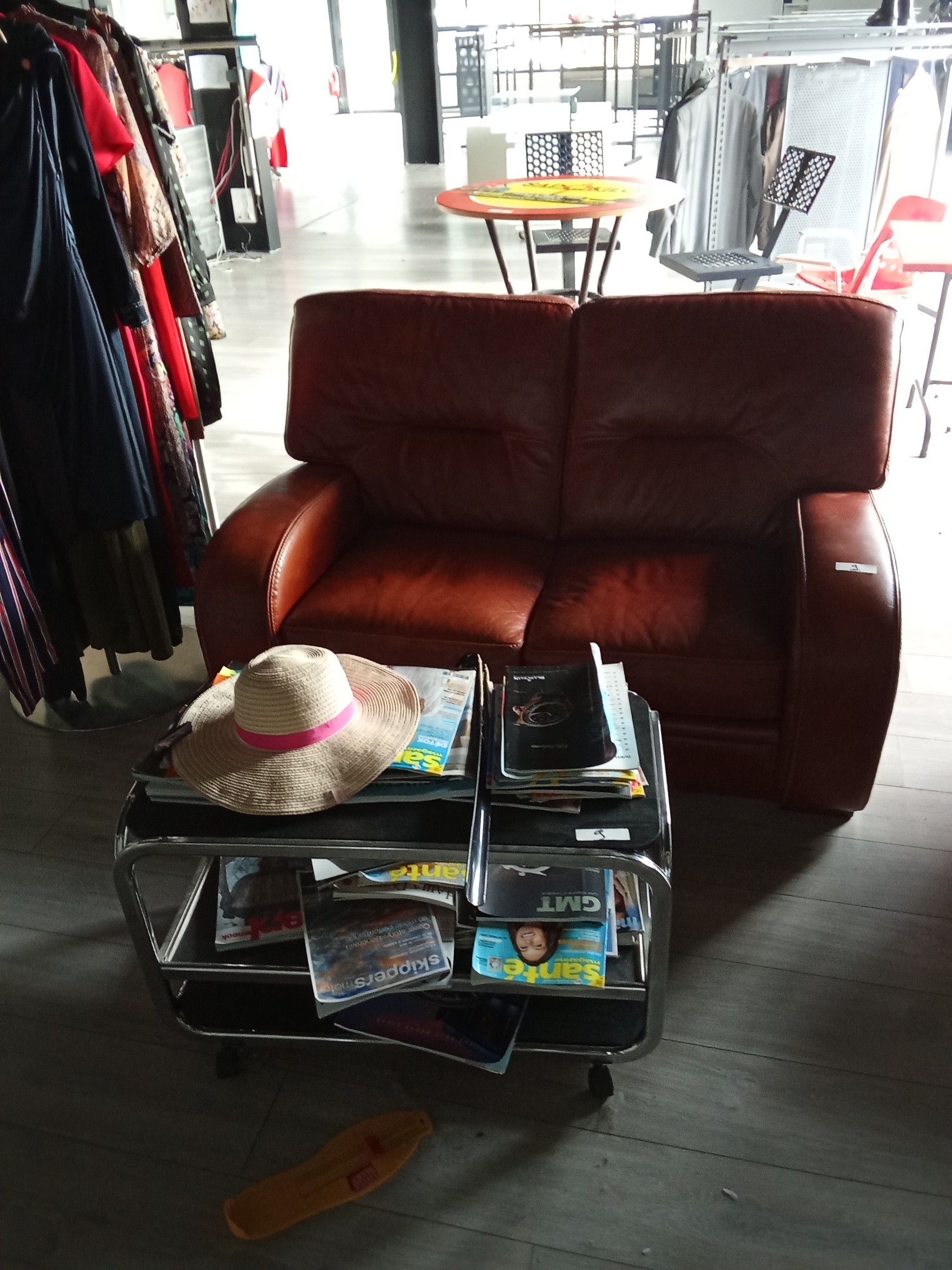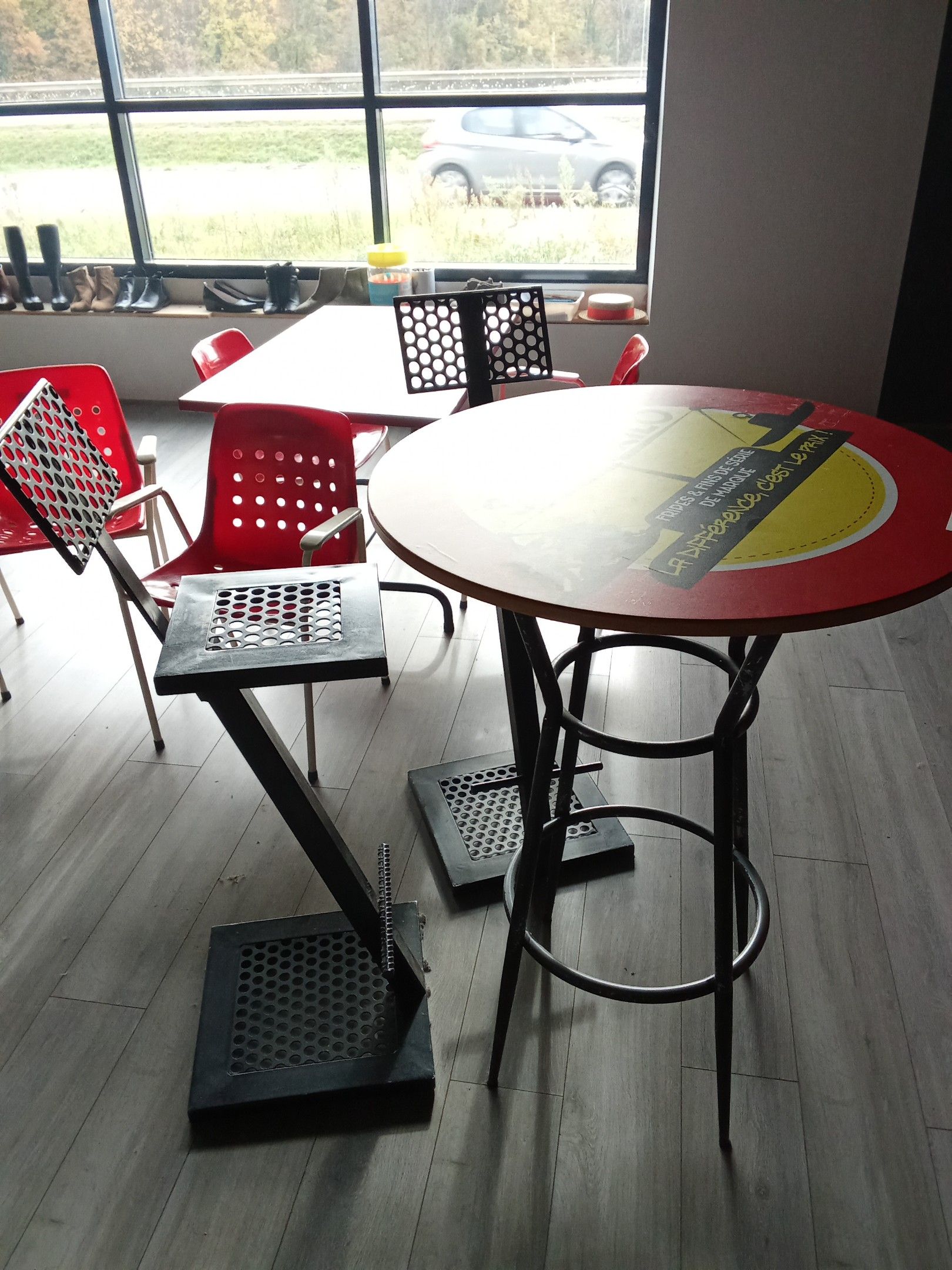 Leather sofa (worn), pair of rattan armchairs, coffee table, high table and two high chairs, four OWI metal and plastic chairs, four OWI metal and plastic chairs.