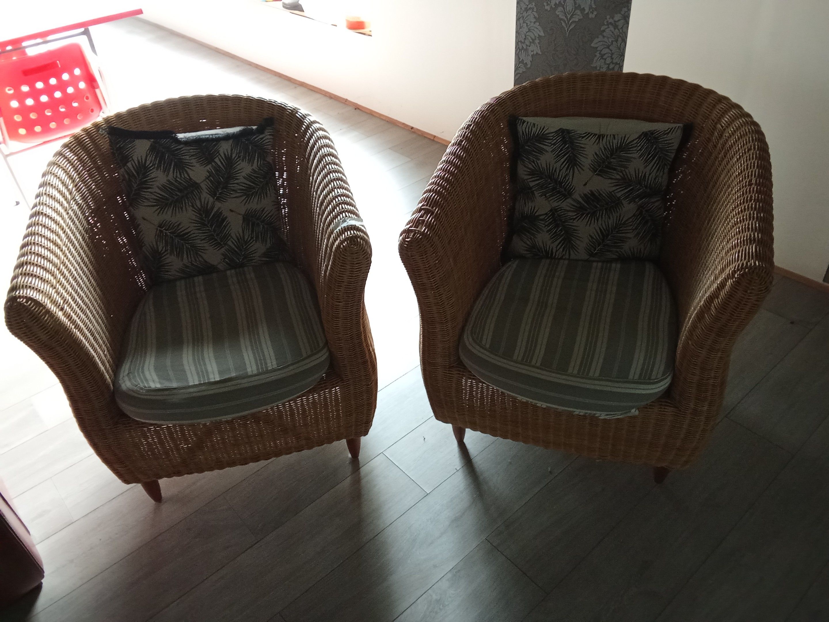 Leather sofa (worn), pair of rattan armchairs, coffee table,…