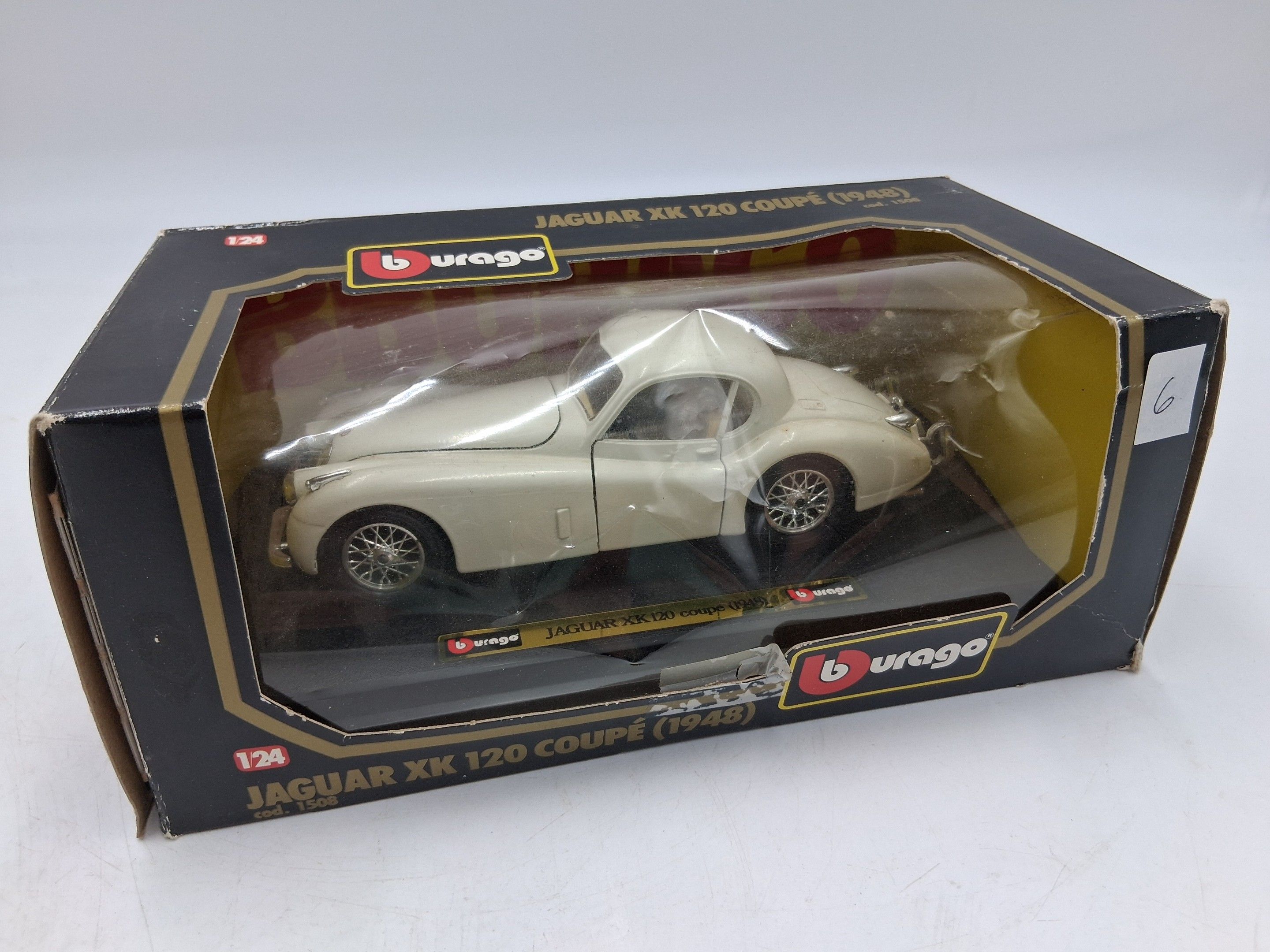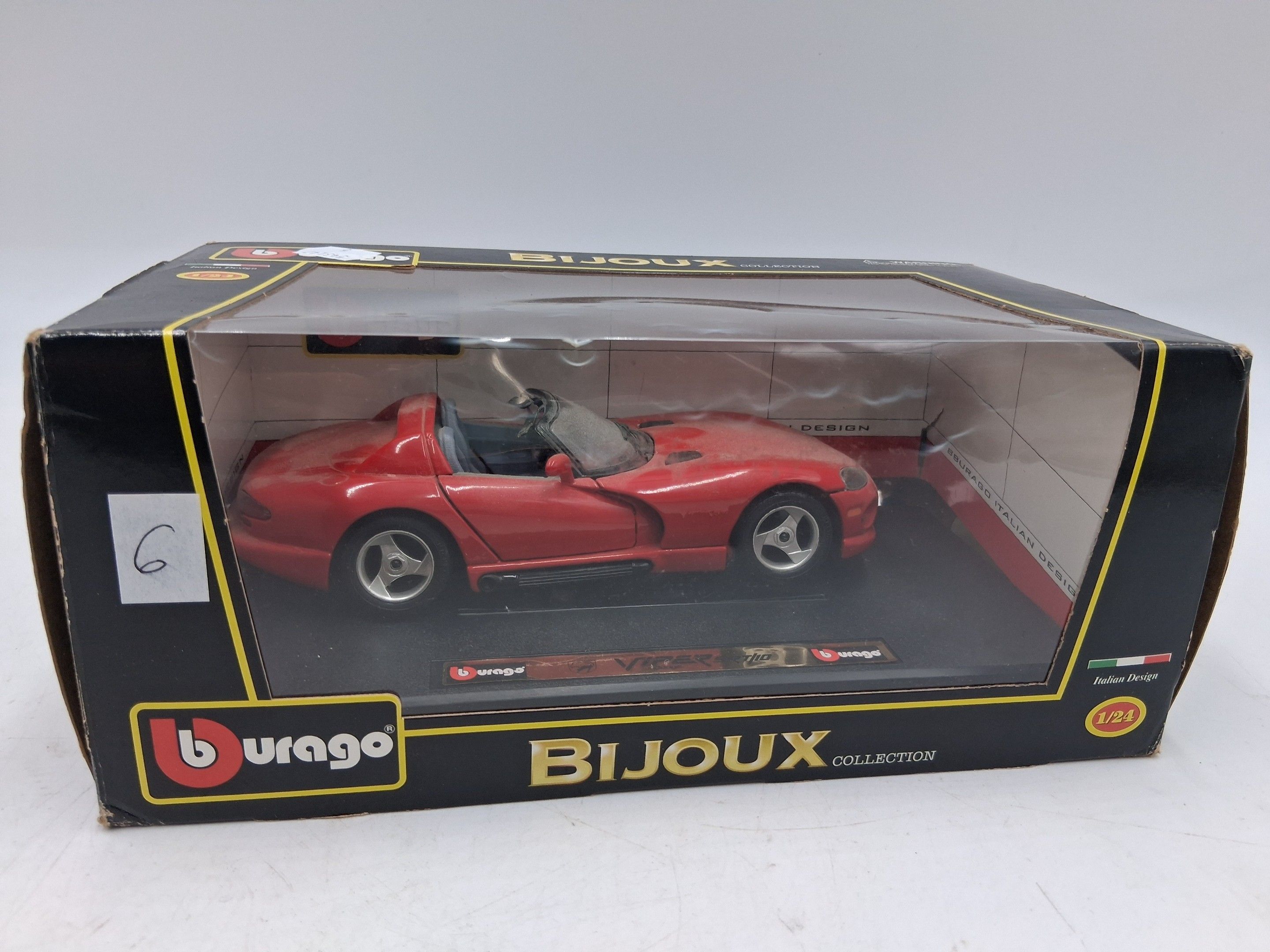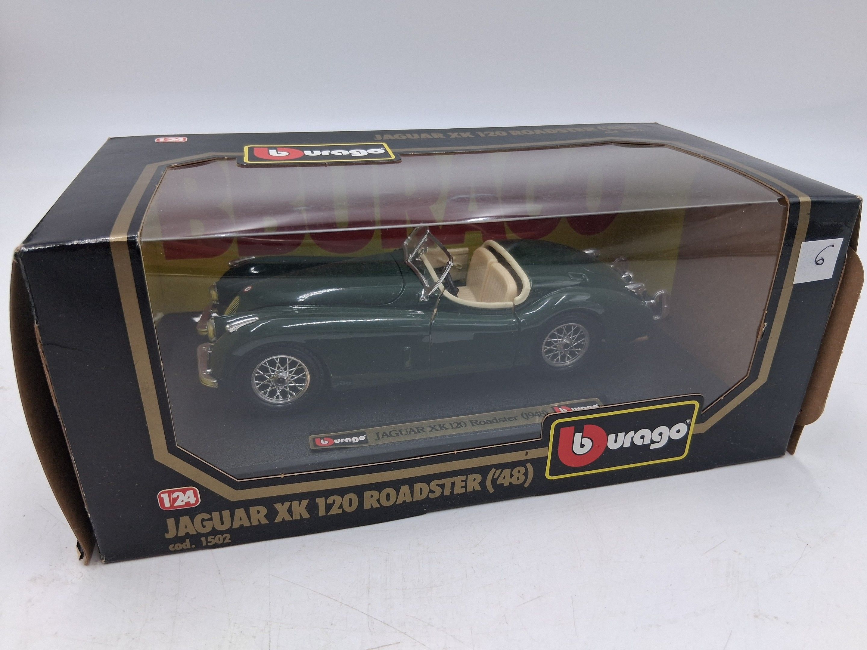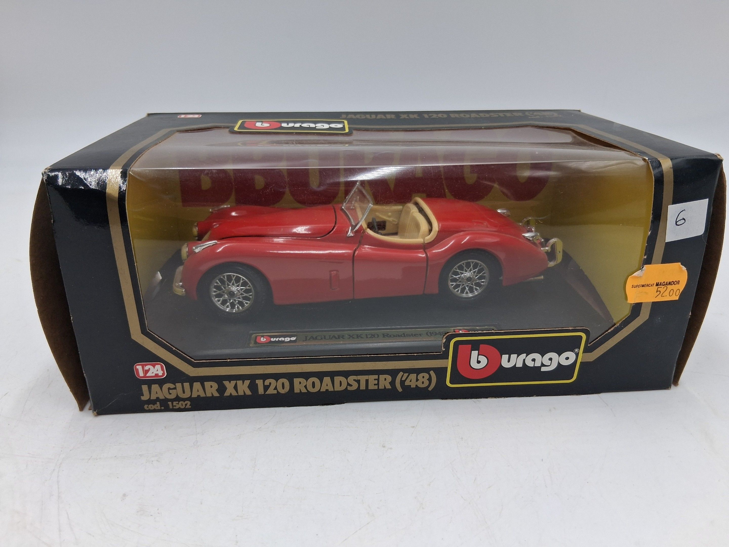 Lot of three 1948 Jaguar XK120, two Roadster and one coupe, scale 1/24, BURAGO. Original box. Also a Dodge Viper SRT 10. Box pressed