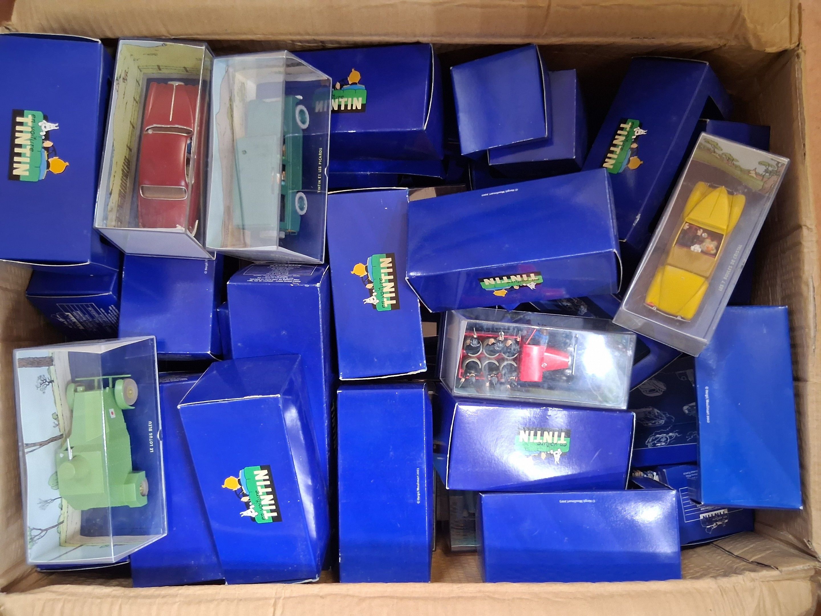 Based on HERGE. En voiture Tintin" collection, Atlas publisher for Moulinsart, set of 54 painted metal miniature vehicles in 1/43 scale, taken from the various adventures of Tintin.