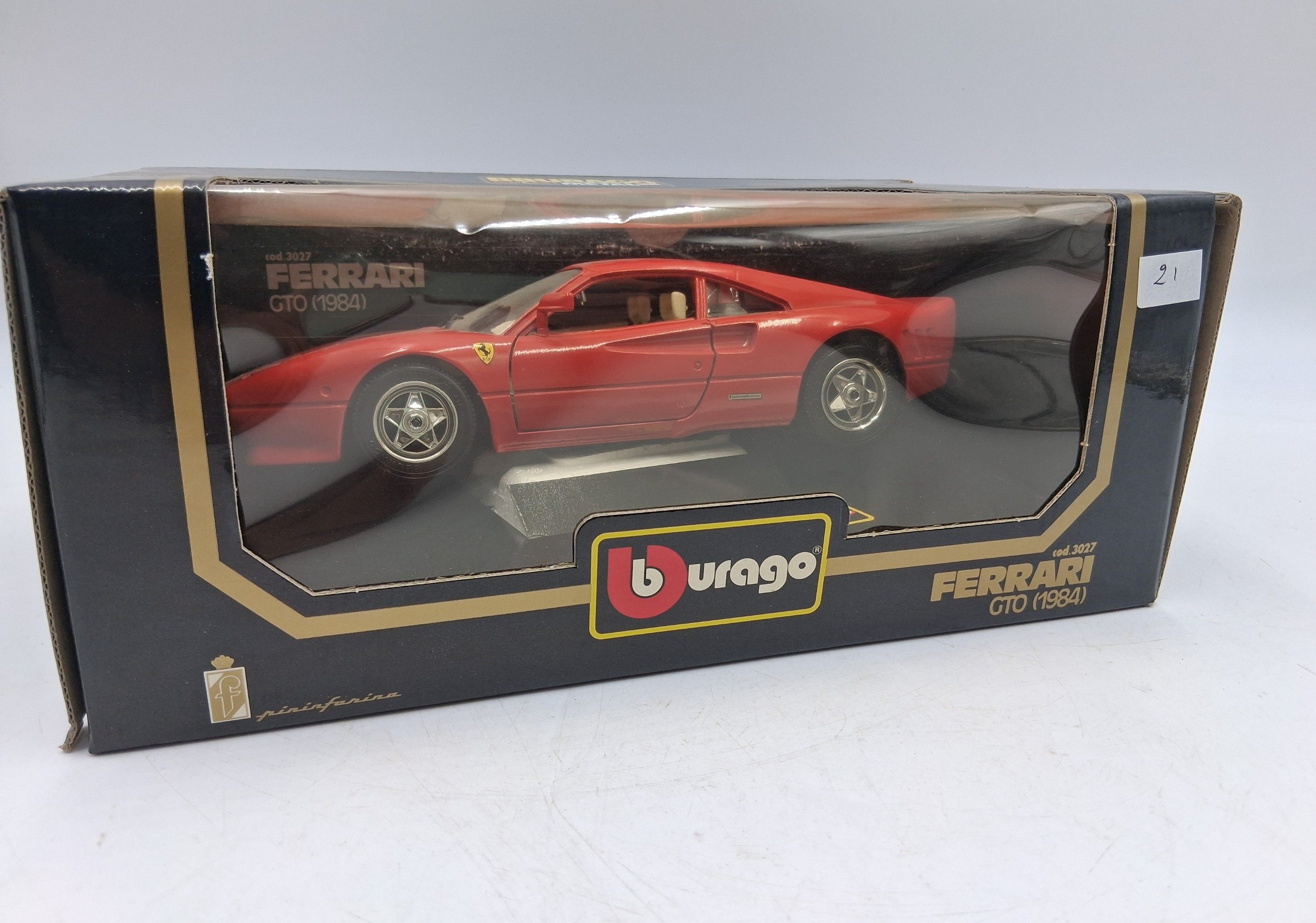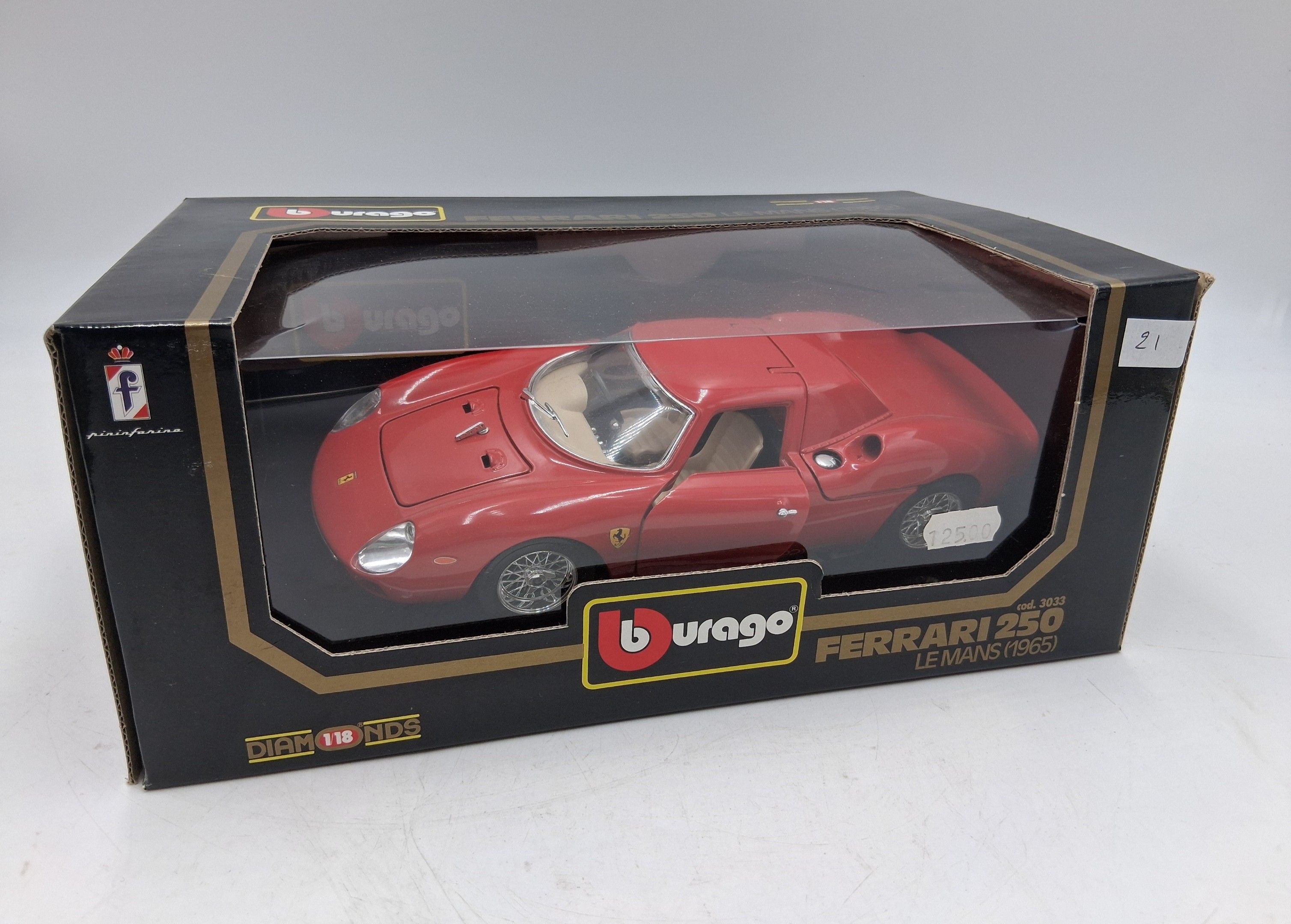 Set of three Ferrari BURAGO, 1/18th scale including: 348tb (1989), GTO (1984), Ferrari 250 Le Mans (1965). Original box