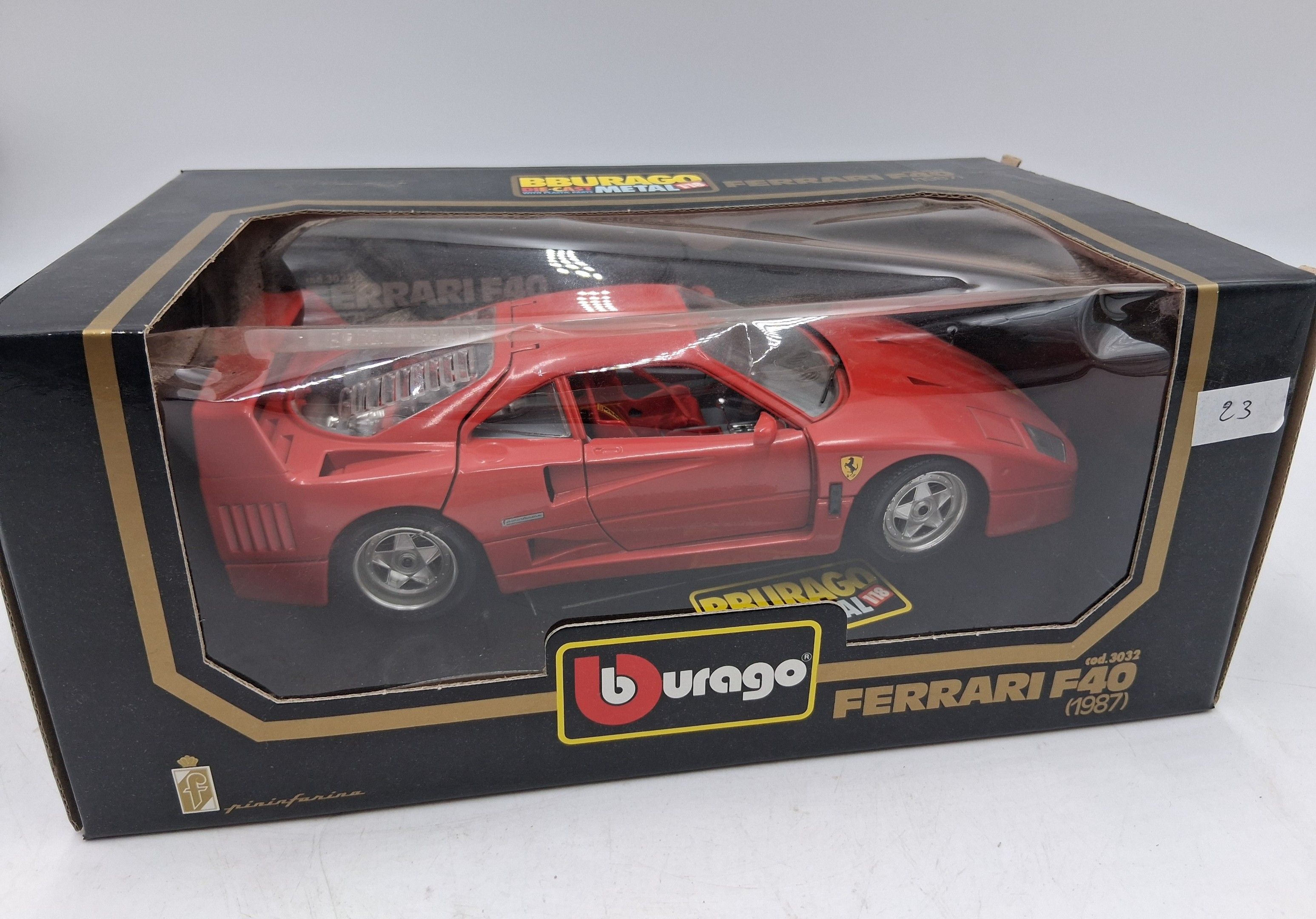 Three Ferrari BURAGO cars, 1/18th scale, including : F40 (19…