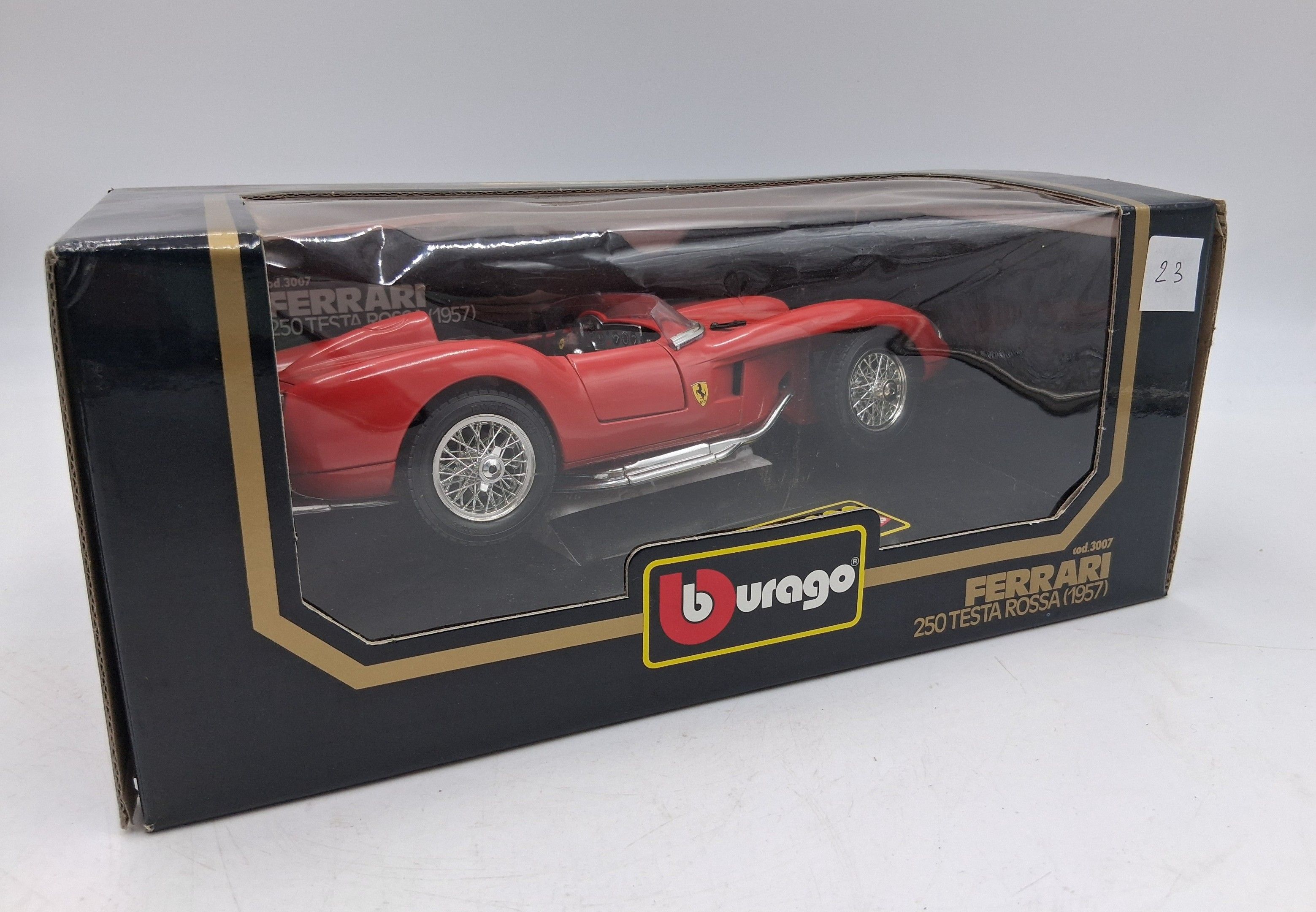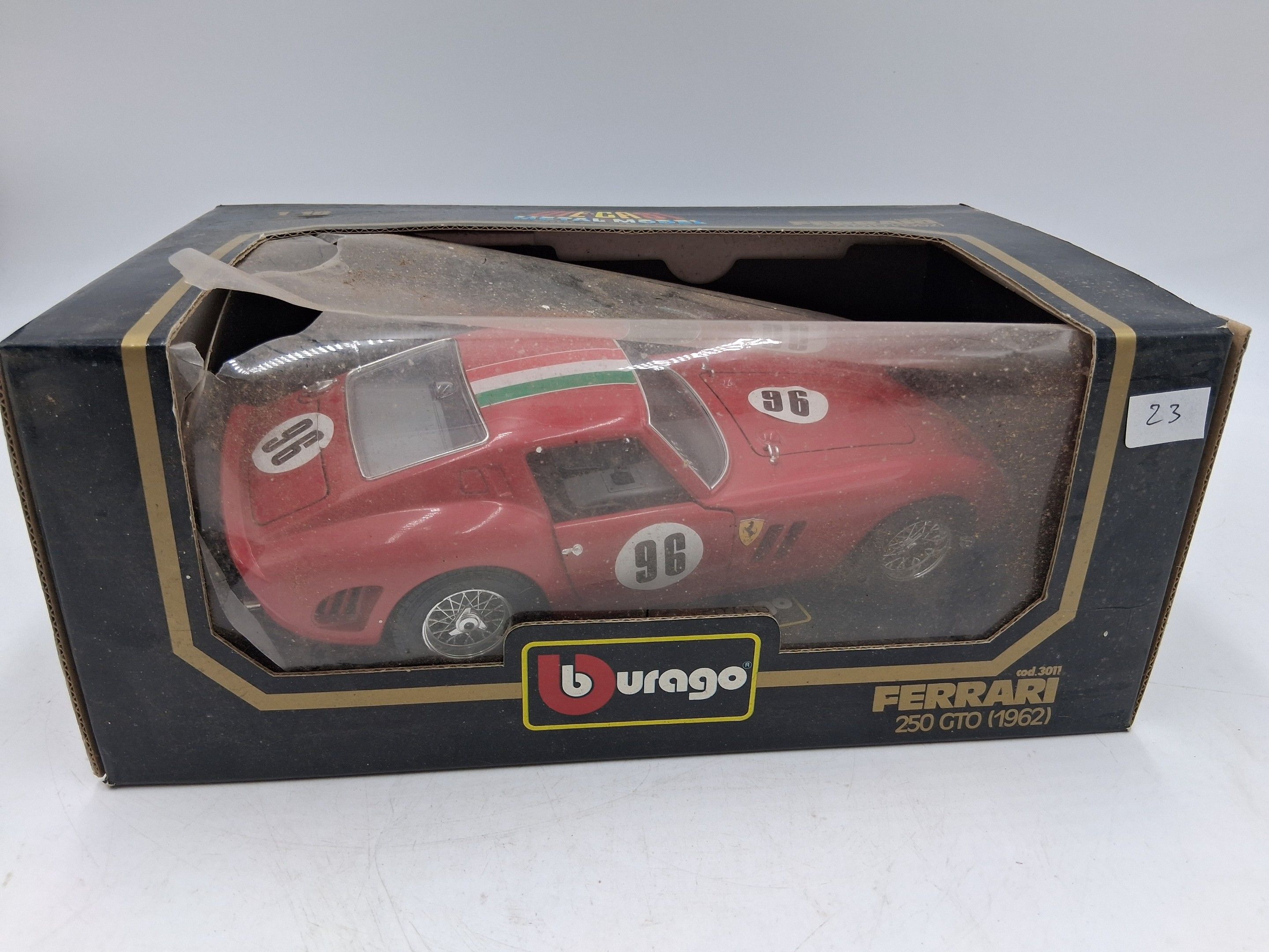 Three Ferrari BURAGO cars, 1/18th scale, including : F40 (1987), 250 GTO (1962), 250 Testa Rossa (1957). Original box. (box accidents)