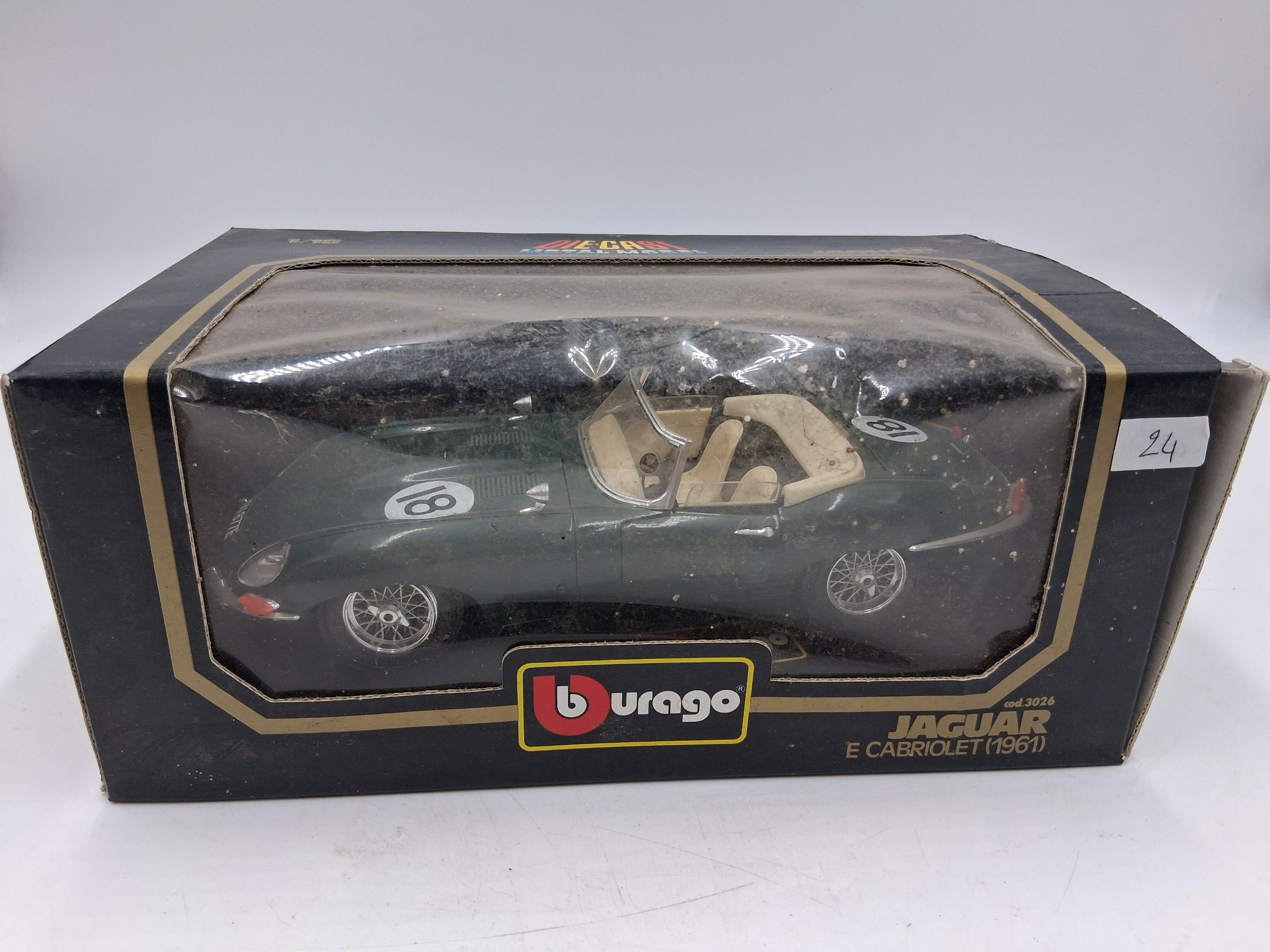 Three Jaguar BURAGO cars, scale 1/18, including: two SS 100 (1937), E CABRIOLET (1961). Original box. (box accidents)