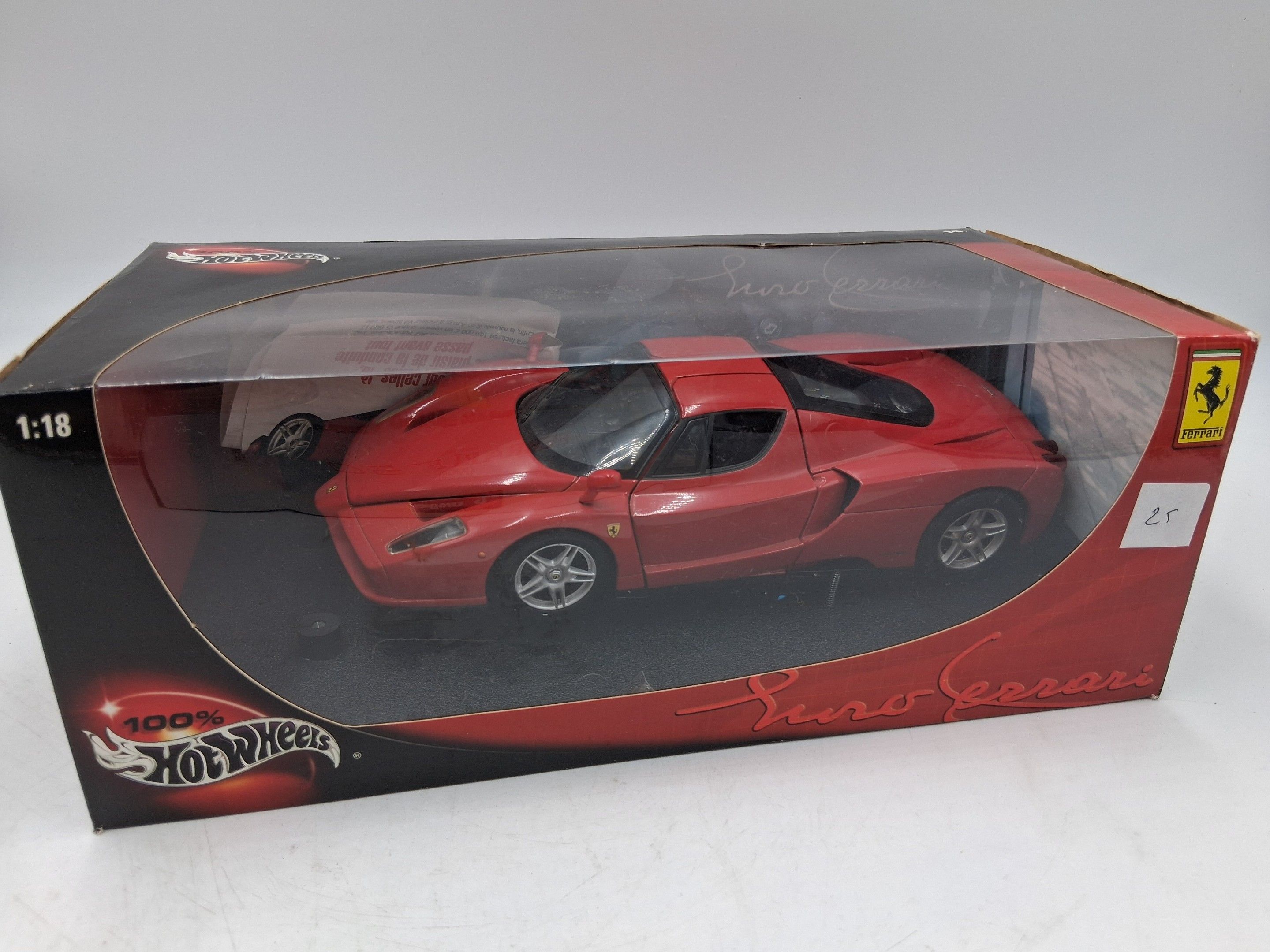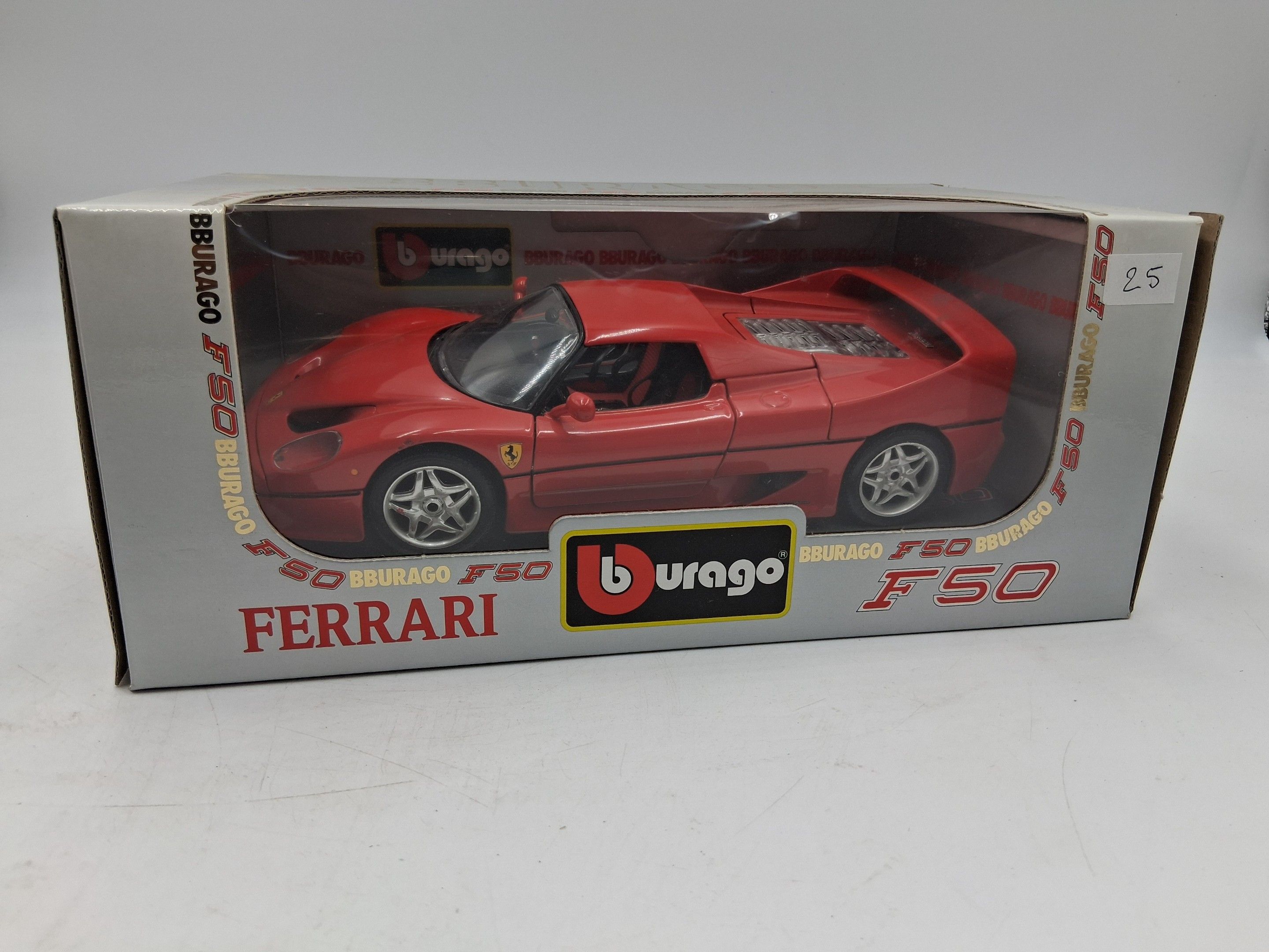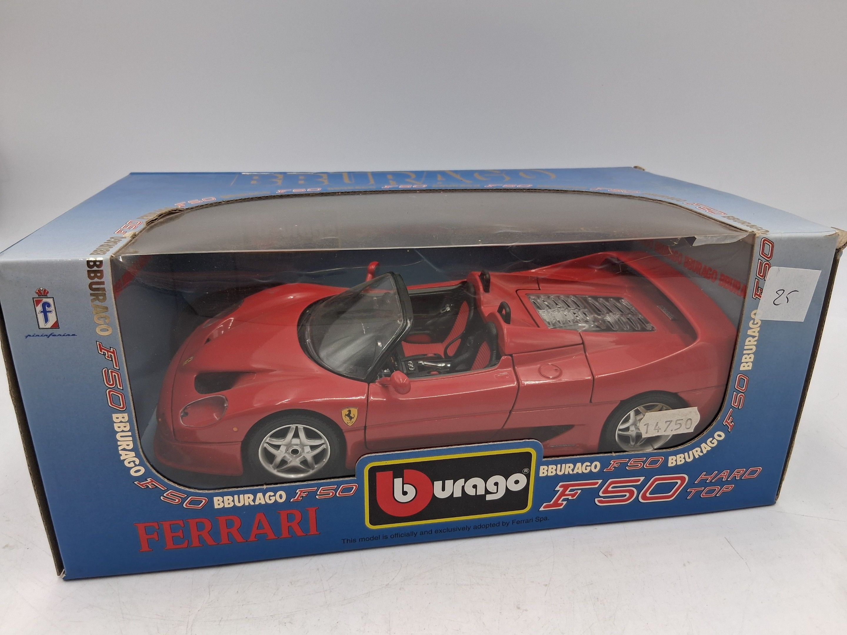 Set of three Ferrari cars, 1/18th scale including: an F 50 BURAGO, an F 50 Hard-Top (1995), Luro Ferrari 100% Hotwheels. All with original boxes. (some wear to boxes)