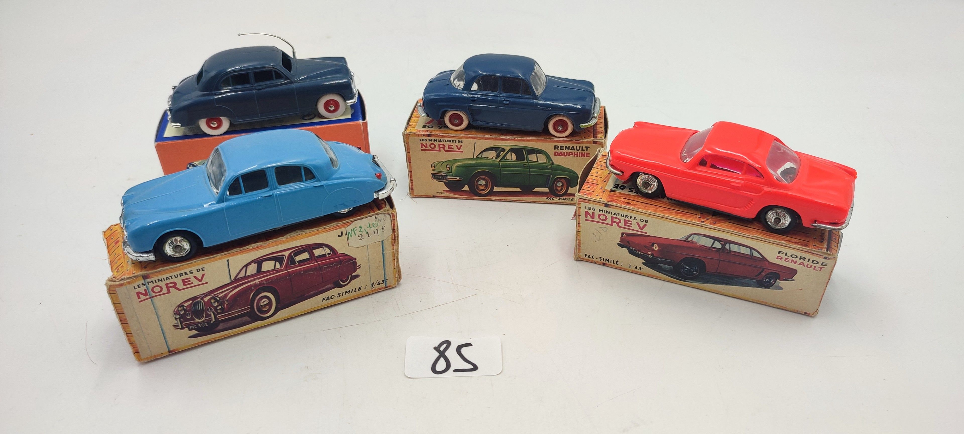 NOREV scale 1/43 - plastic - Lot of 4 cars in their original box : RENAULT DAUPHINE, SIMCA ARONDE, JAGUAR, RENAULT FLORIDE. Minor accidents to the boxes