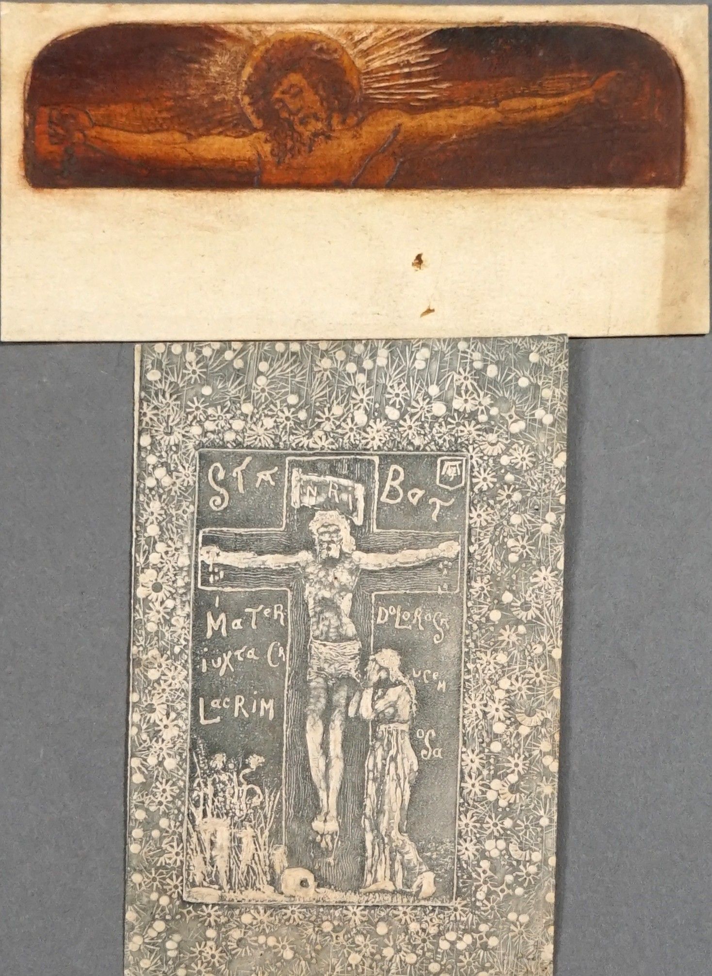 Arthur Henri LEFORT DES YLOUSES (1856-1912). Deploration and Christ on the Cross in bust form. Etching in relief. Proof in black for one, brown for the other, on wove paper. Probable binding designs. One monogrammed in the subject top right. 9 x 19 and 18 x 12 cm. Freckles and paper cut for one.