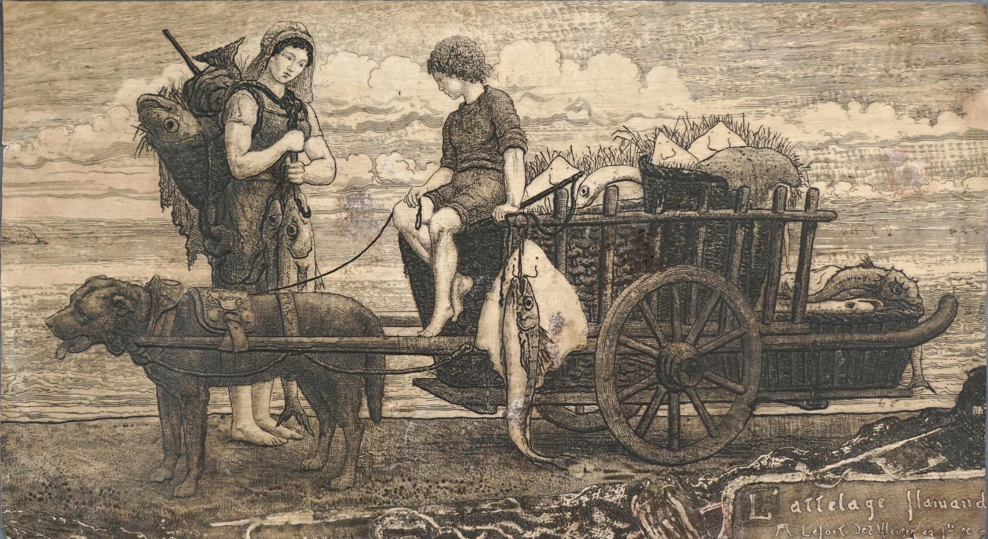 Arthur Henri LEFORT DES YLOUSES (1846-1912). The Flemish carriage. Etching in relief. Proof in black on laid paper trimmed to the subject. Signed lower right. 27 x 49 cm (folds and small tears).
