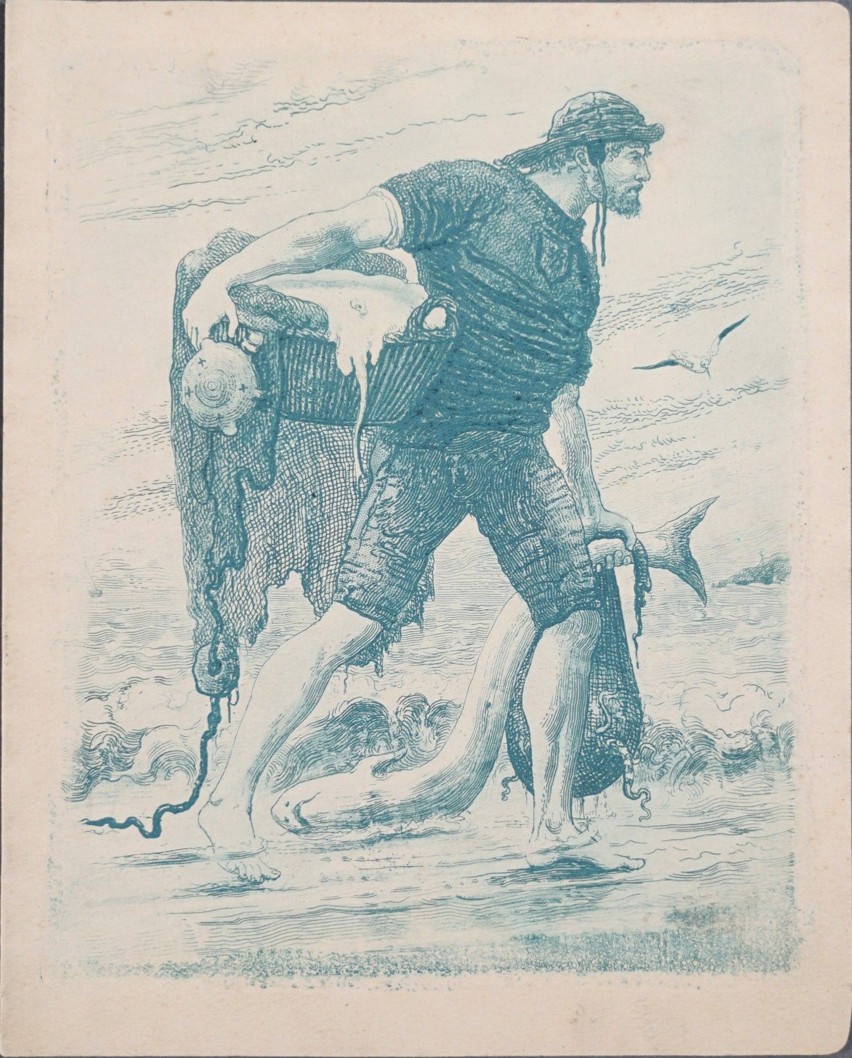 Arthur Henri LEFORT DES YLOUSES (1846-1912). The fisherman with the shark. Etching in relief. Blue proof on wove paper. 19 x 23 cm. Some brown spots.