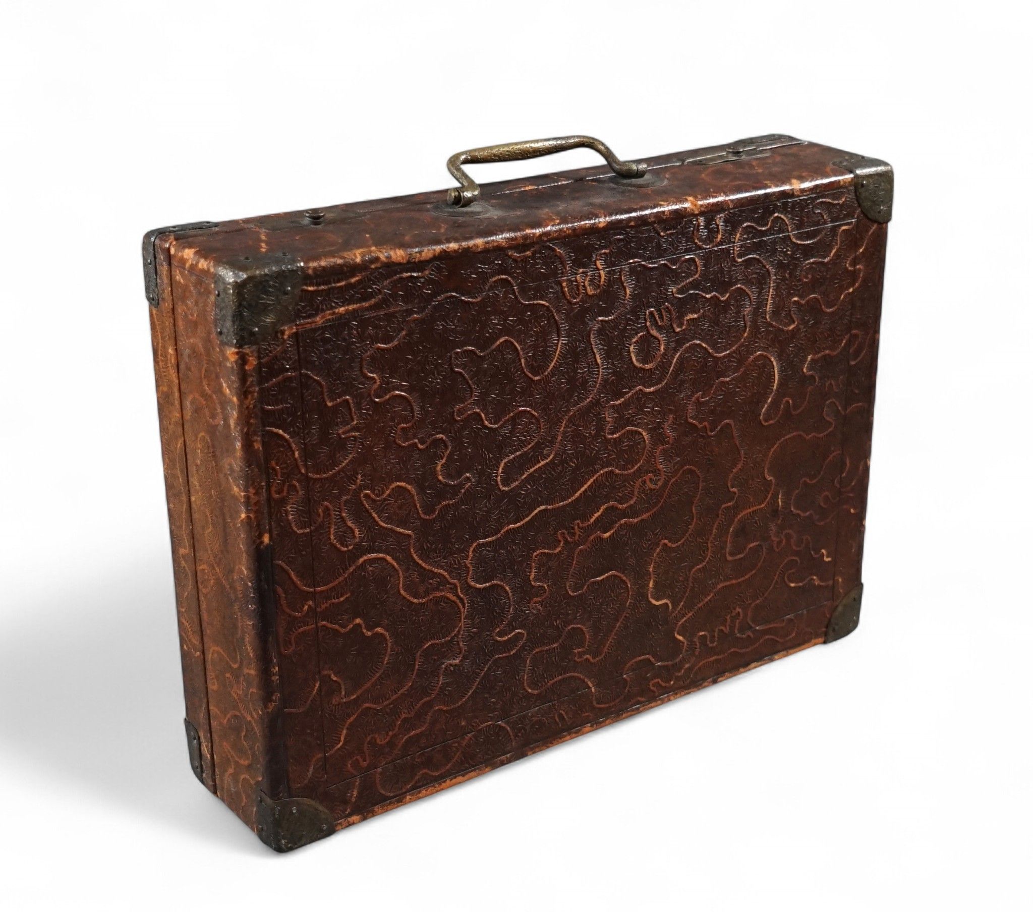 Arthur Henri LEFORT DES YLOUSES (1846-1912). Beautiful case in stamped leather with vermiculated decoration, the corners in hammered copper, the central register showing an antique flute player facing a snake in a landscape. Inside in green velvet. 9.5 x 37 x 26 cm. Slight rubbing and wear.