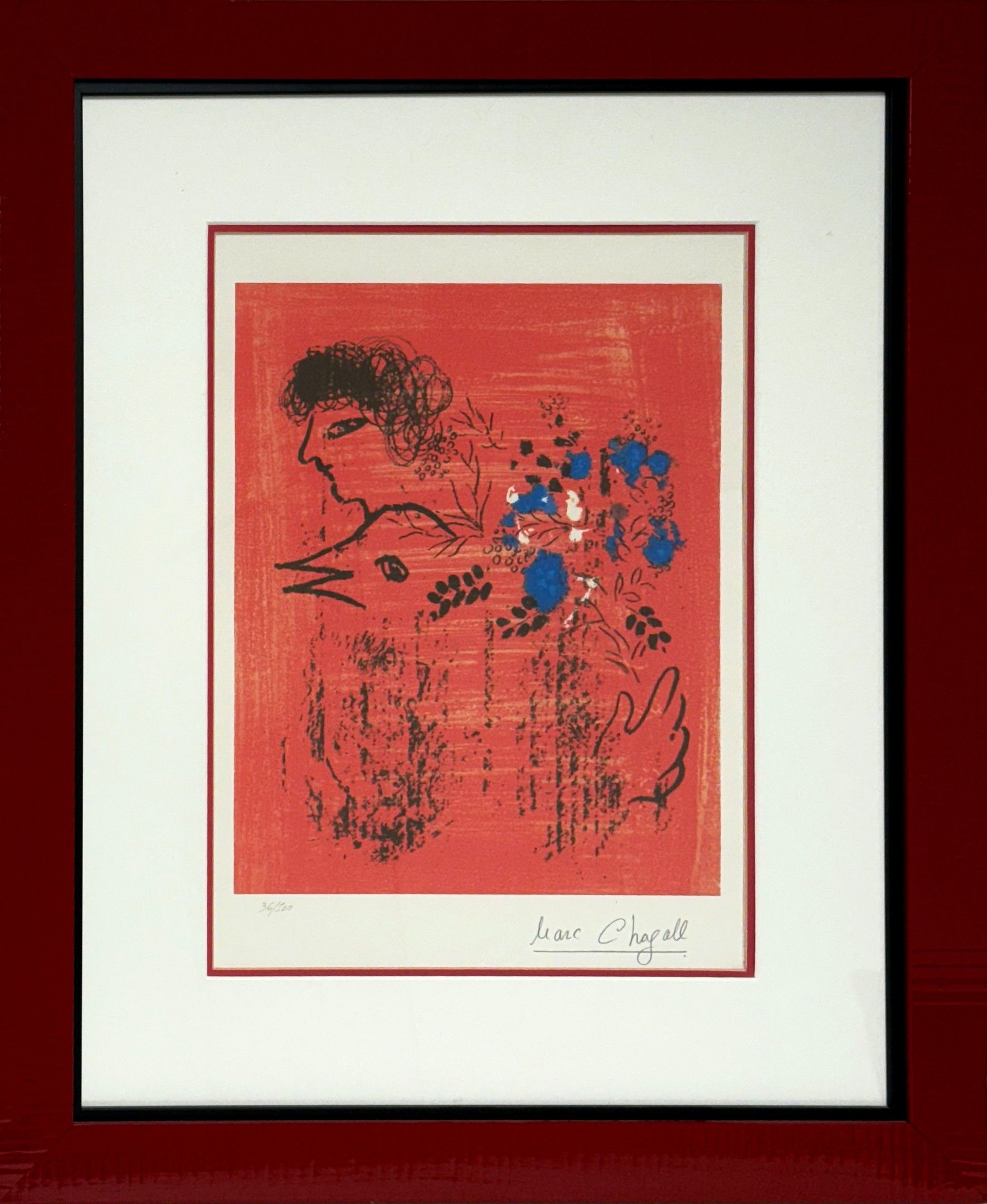 Marc CHAGALL (1887-1985) (After) Bouquet à l'oiseau. Lithograph signed in the plate in the margin and numbered 36/100. Beautiful red lacquered frame under glass.