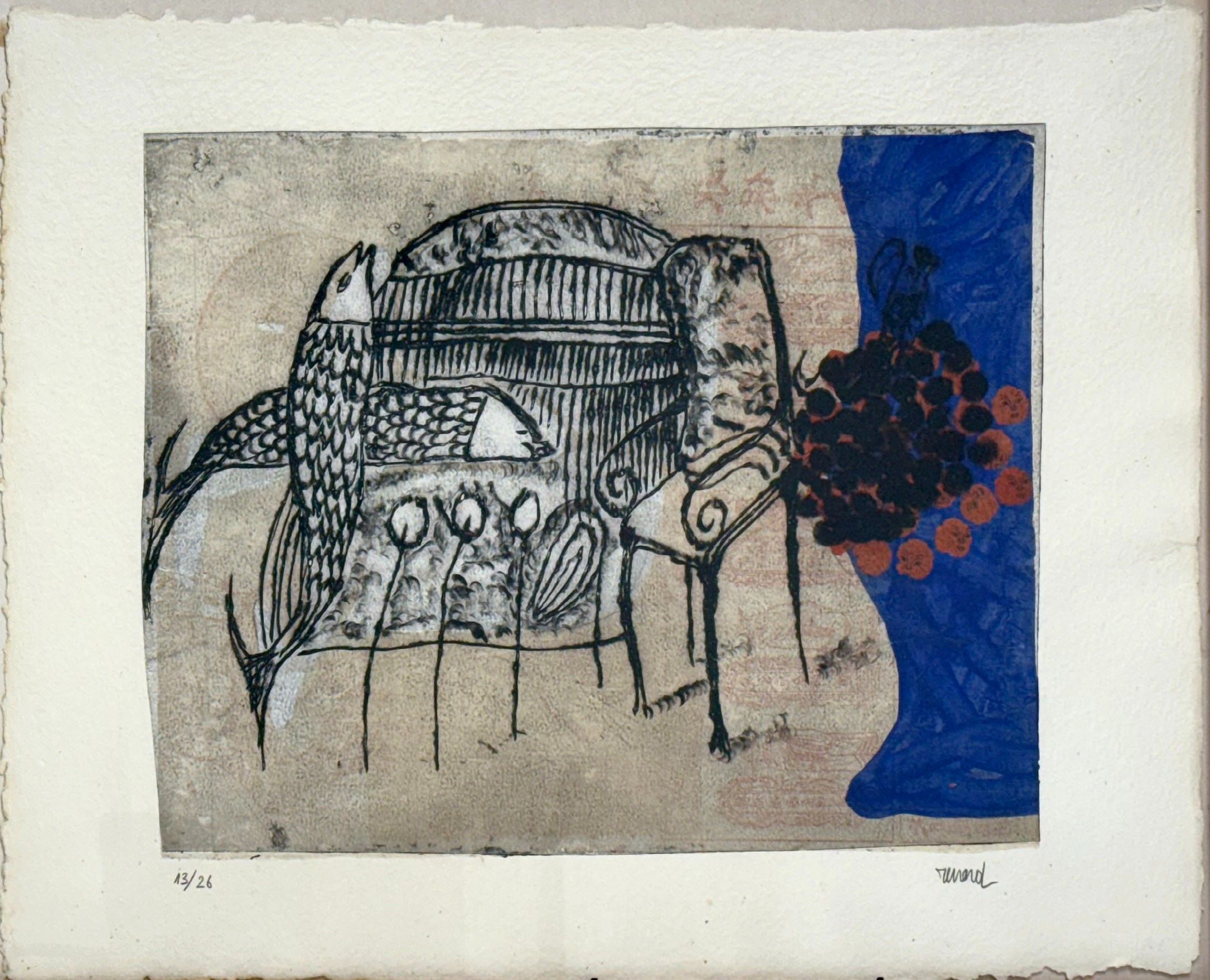 Emmanuelle RENARD (1963) Fish, bench and flowers. Carborundum etching signed lower left and numbered 13/26. 55 x 73 cm