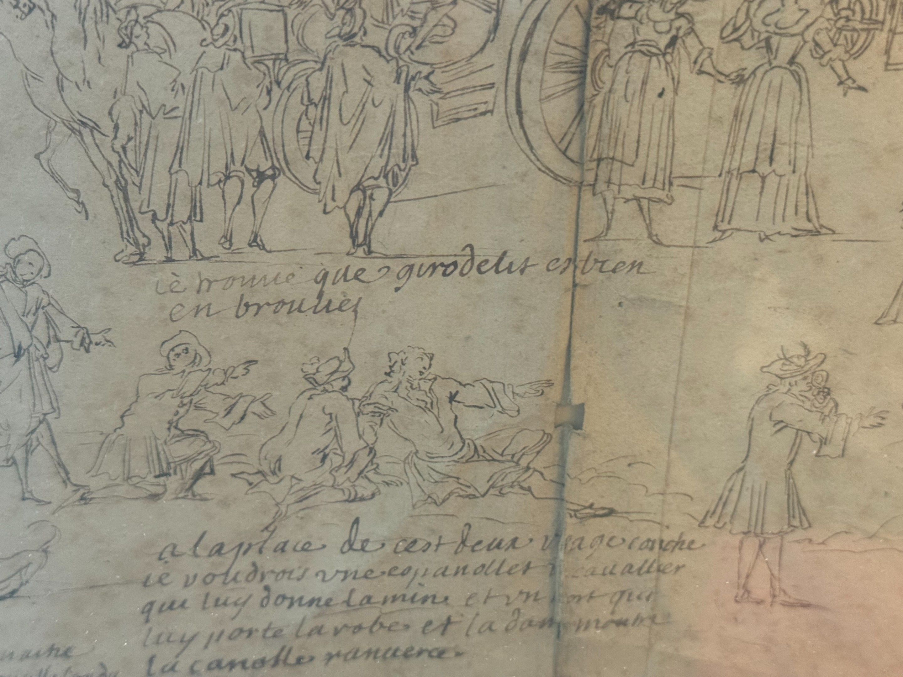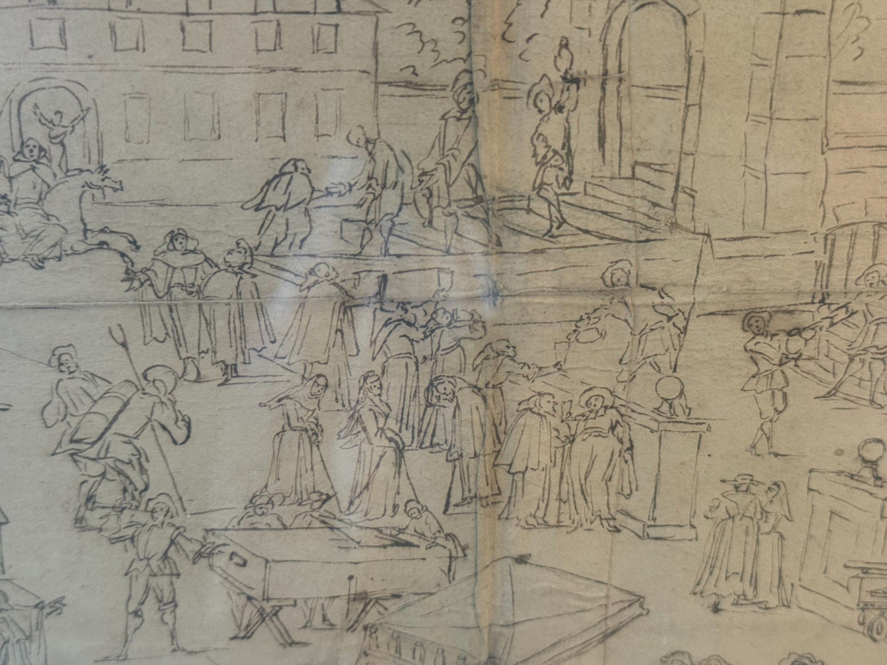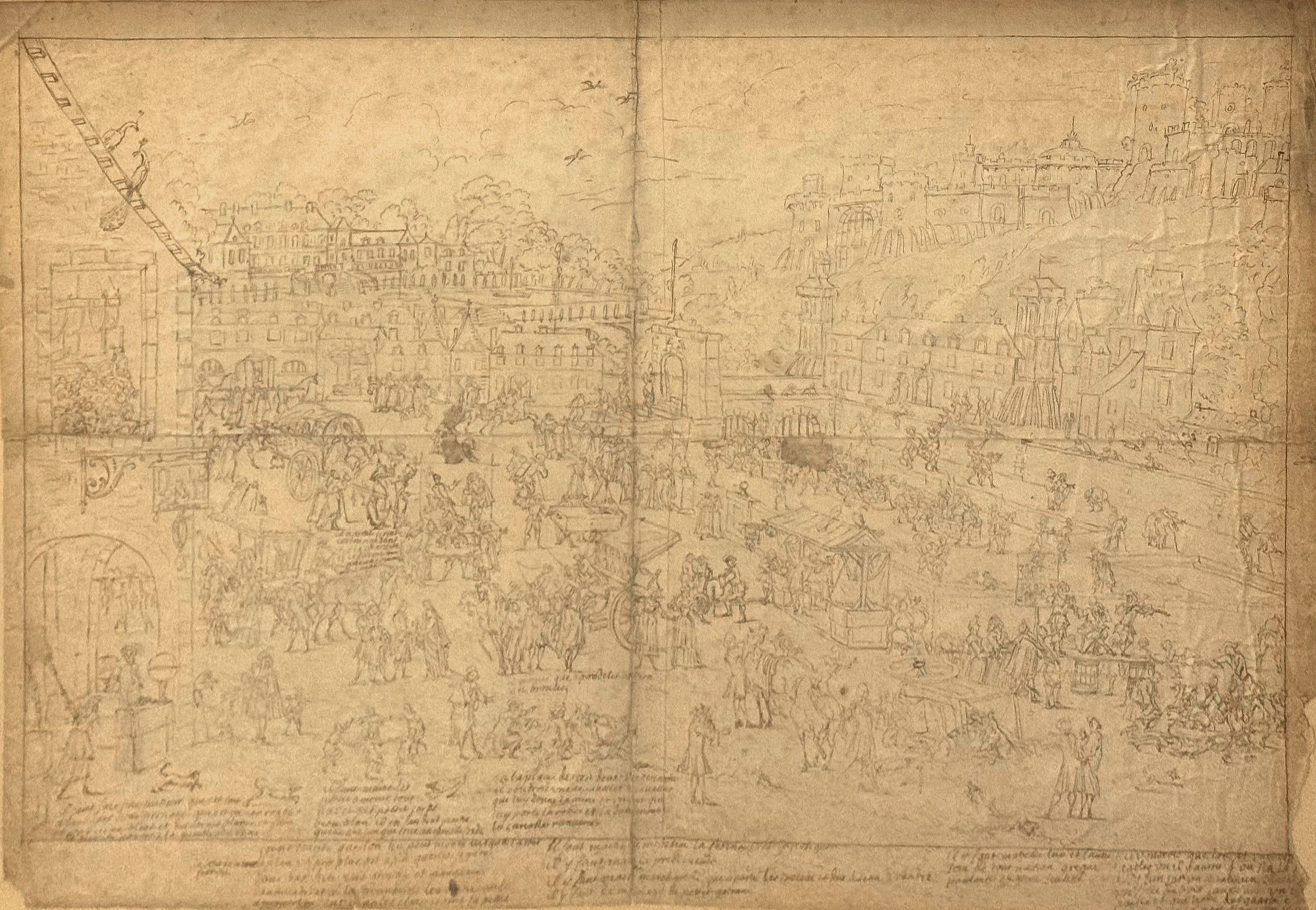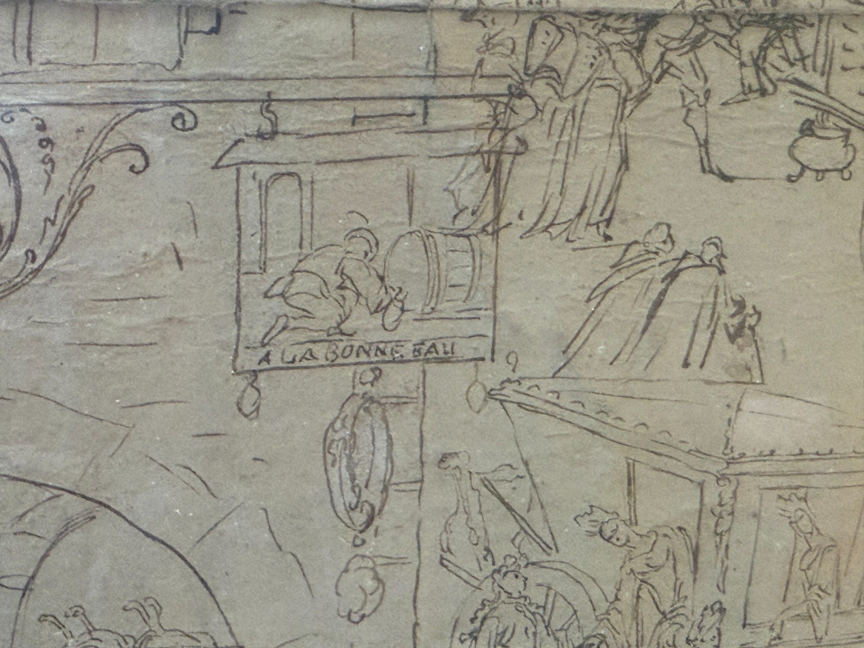 18th century French school. Original pen-and-ink DRAWING on a centrefold folio page, depicting a busy town square with many amusing and satirical scenes, including monks in a cart, an overturned carriage with a woman with her skirts raised, a barber's stall behind which characters are showing their buttocks, a cook chasing a cat with a broom, a building with the sign "A la bonne eau", where on the upper floor you can see a banquet of monks accompanied by courtesans, elegant women arriving in carriages accompanied by gentlemen, a platform of musicians, figures busy in three large tubs, a counter serving drinks, etc., all accompanied by handwritten annotations in which the author or commissioner gives his opinion on possible modifications and indications of colours. In the background are the staircase of the Château de Fontainebleau and a medieval castle (small missing parts in the lower right, some stains). 45 x 66 cm