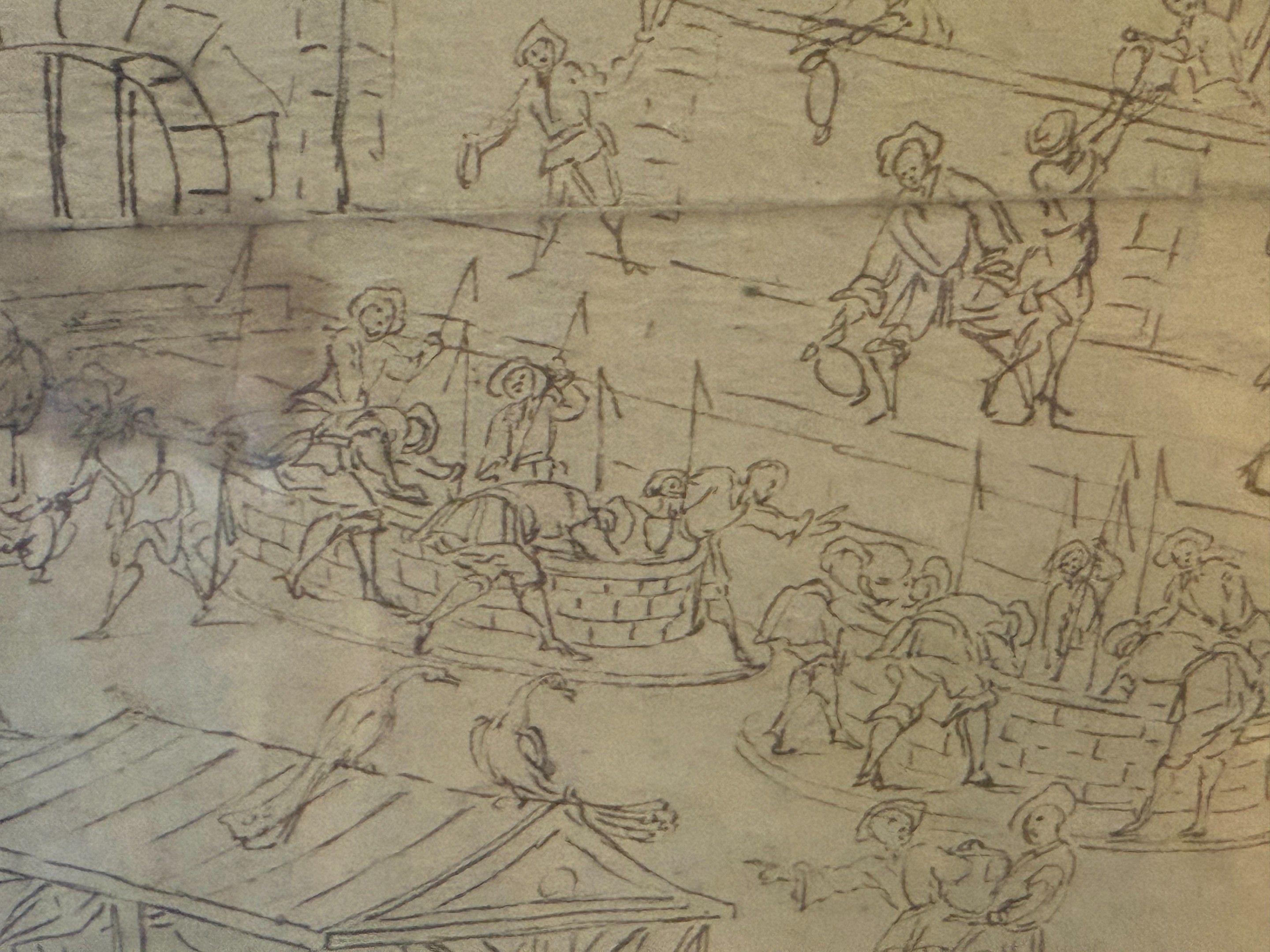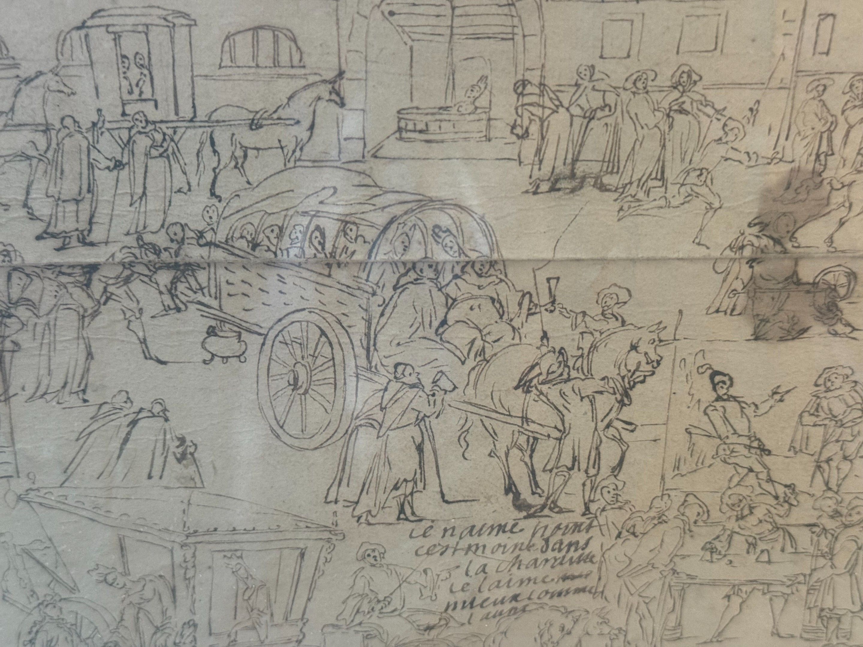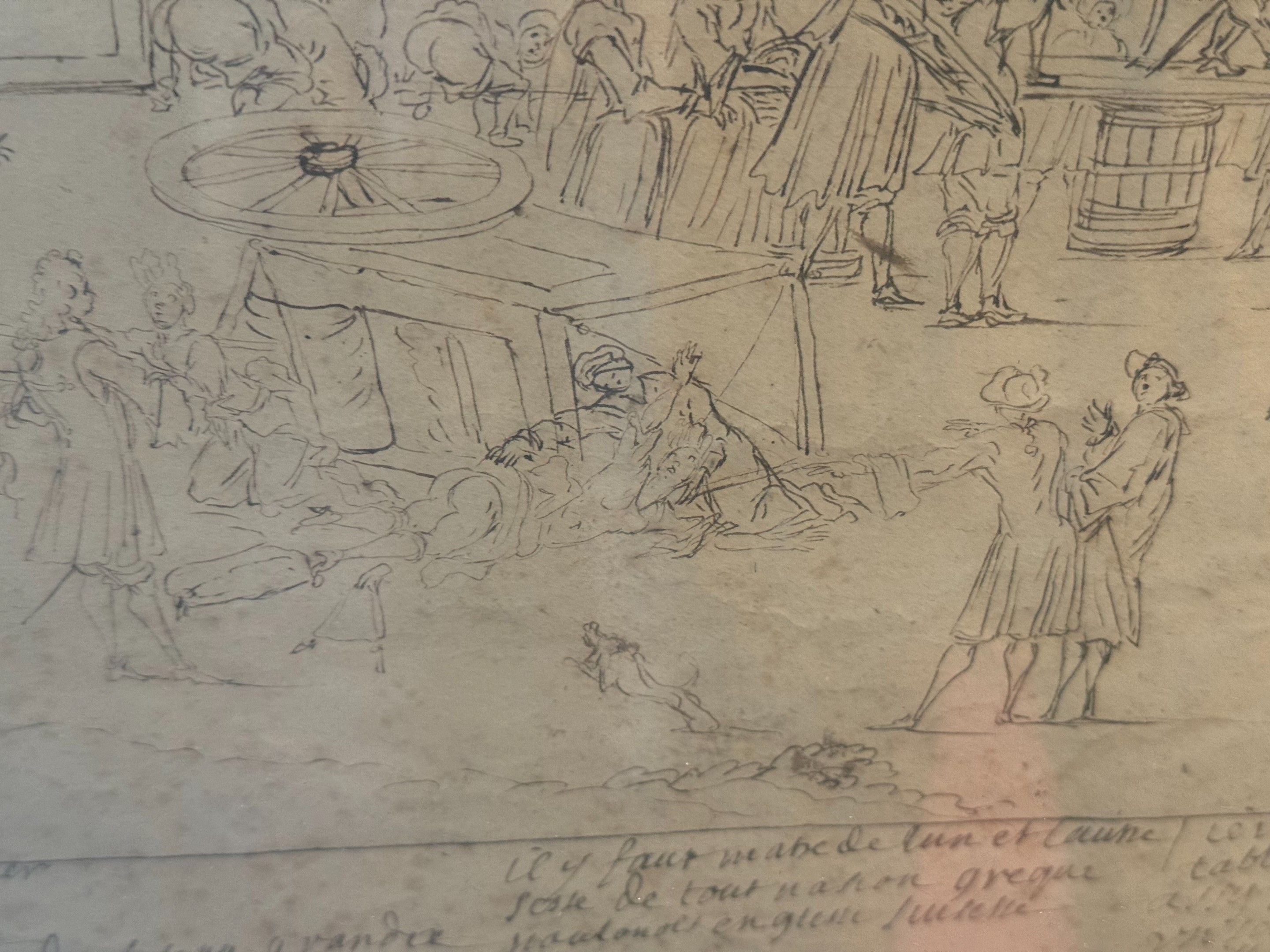 18th century French school. Original pen-and-ink DRAWING on a centrefold folio page, depicting a busy town square with many amusing and satirical scenes, including monks in a cart, an overturned carriage with a woman with her skirts raised, a barber's stall behind which characters are showing their buttocks, a cook chasing a cat with a broom, a building with the sign "A la bonne eau", where on the upper floor you can see a banquet of monks accompanied by courtesans, elegant women arriving in carriages accompanied by gentlemen, a platform of musicians, figures busy in three large tubs, a counter serving drinks, etc., all accompanied by handwritten annotations in which the author or commissioner gives his opinion on possible modifications and indications of colours. In the background are the staircase of the Château de Fontainebleau and a medieval castle (small missing parts in the lower right, some stains). 45 x 66 cm