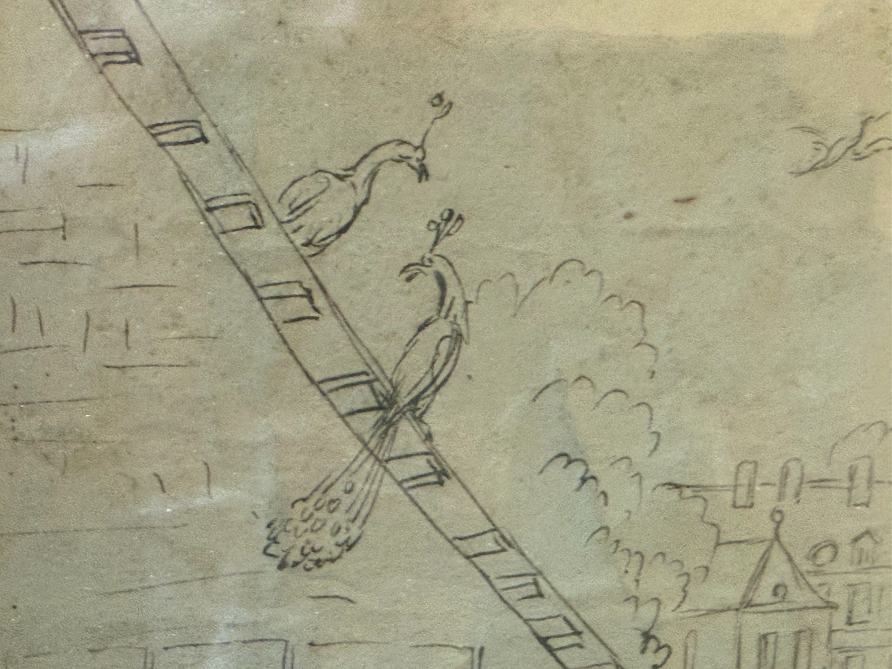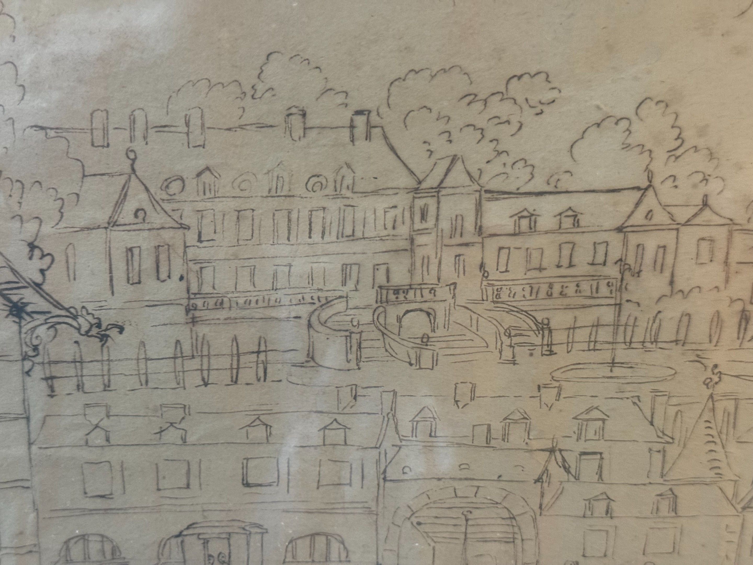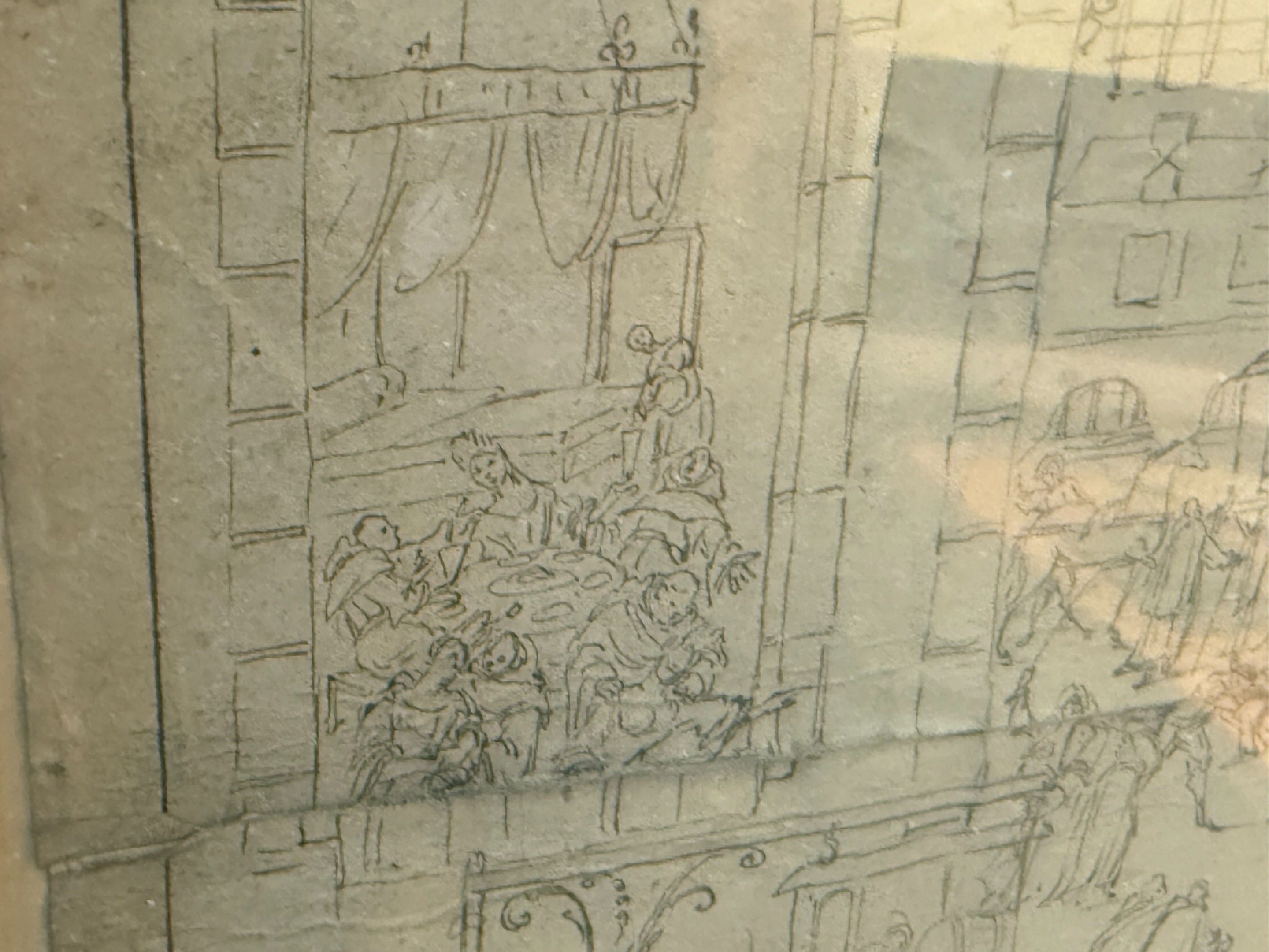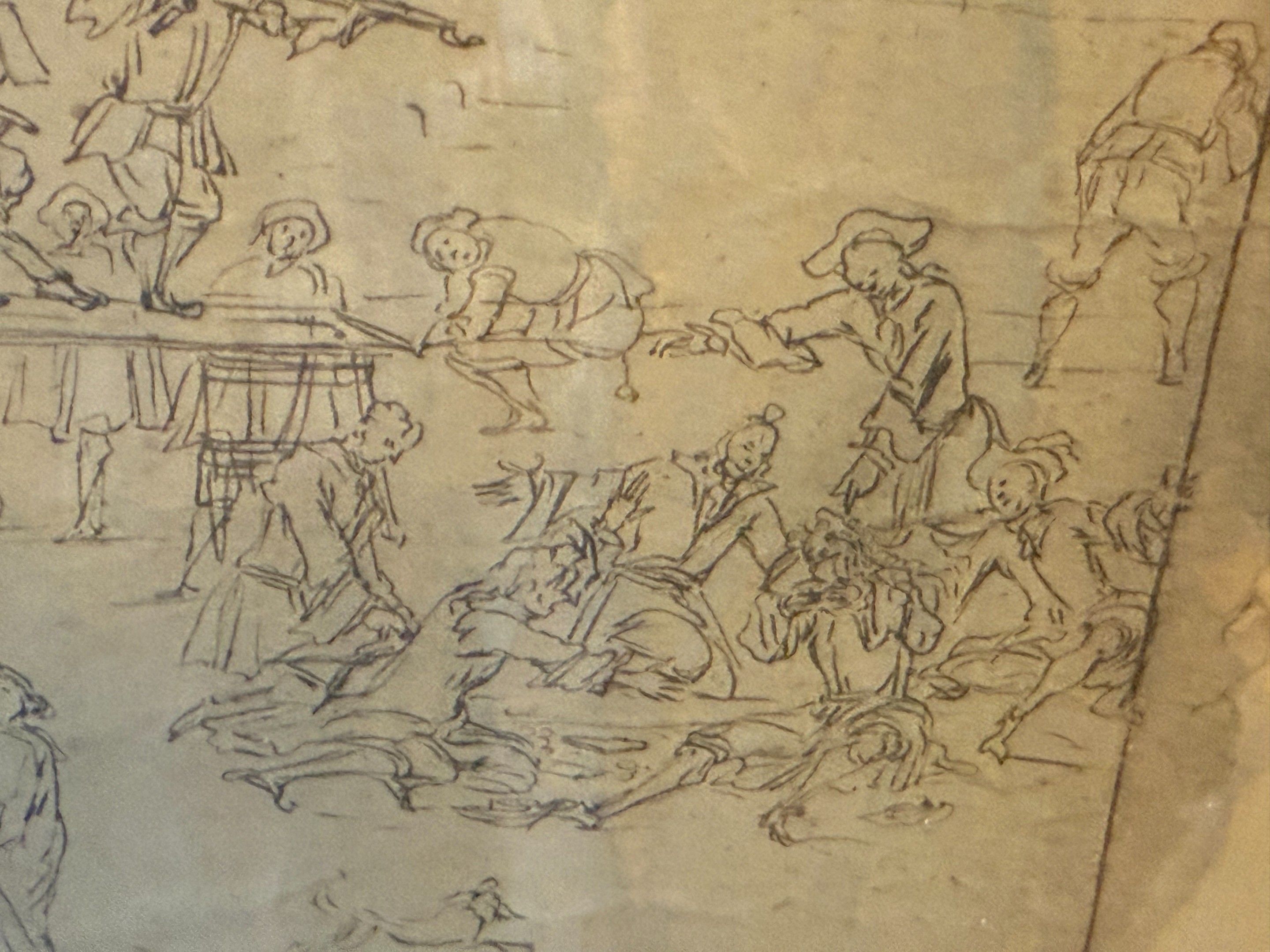 18th century French school. Original pen-and-ink DRAWING on a centrefold folio page, depicting a busy town square with many amusing and satirical scenes, including monks in a cart, an overturned carriage with a woman with her skirts raised, a barber's stall behind which characters are showing their buttocks, a cook chasing a cat with a broom, a building with the sign "A la bonne eau", where on the upper floor you can see a banquet of monks accompanied by courtesans, elegant women arriving in carriages accompanied by gentlemen, a platform of musicians, figures busy in three large tubs, a counter serving drinks, etc., all accompanied by handwritten annotations in which the author or commissioner gives his opinion on possible modifications and indications of colours. In the background are the staircase of the Château de Fontainebleau and a medieval castle (small missing parts in the lower right, some stains). 45 x 66 cm