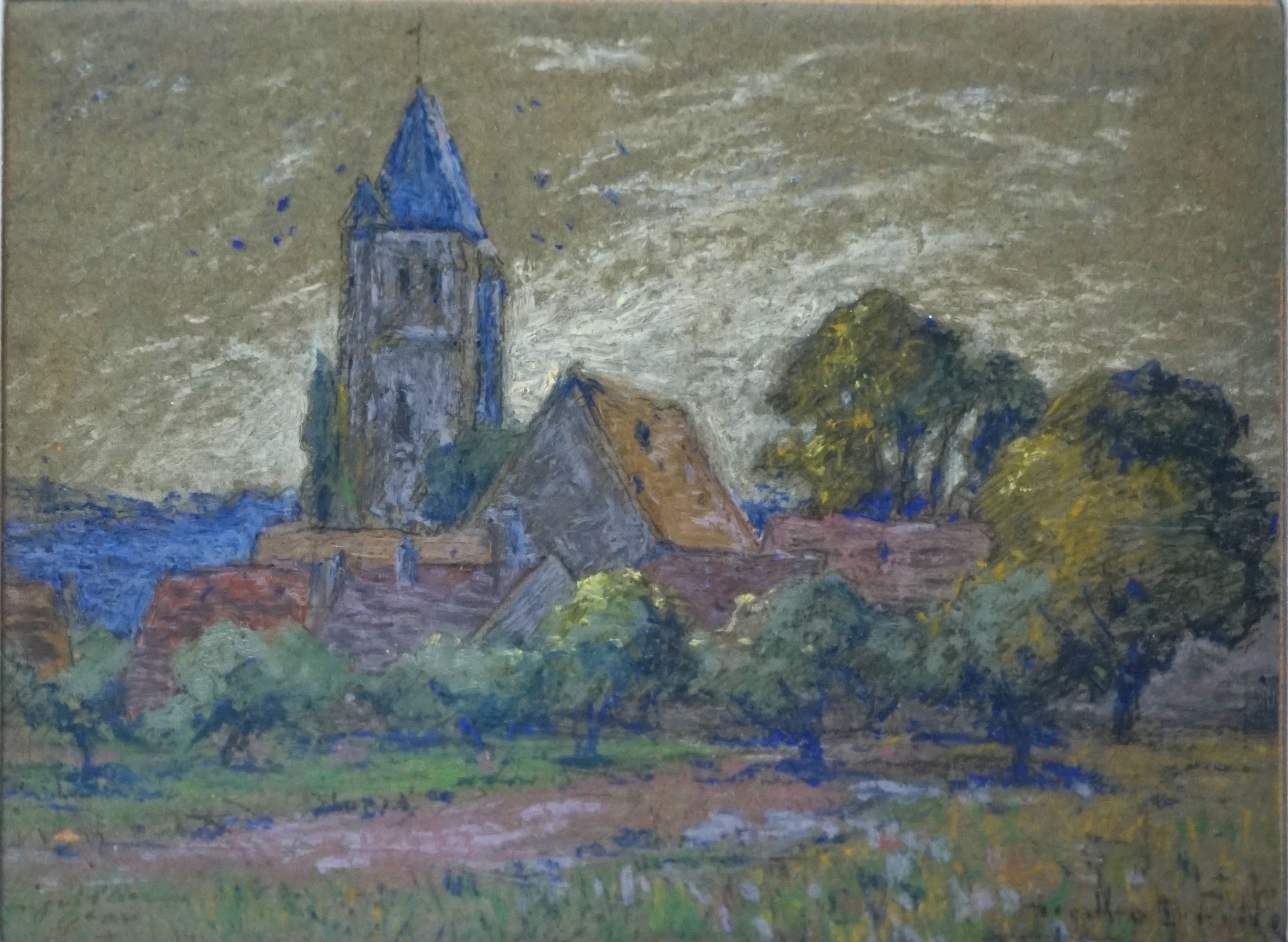 Pierre Ernest PRINS (1838-1913). Village with bell tower in the Oise. Pastel on paper signed lower right. 22 x 30 cm.