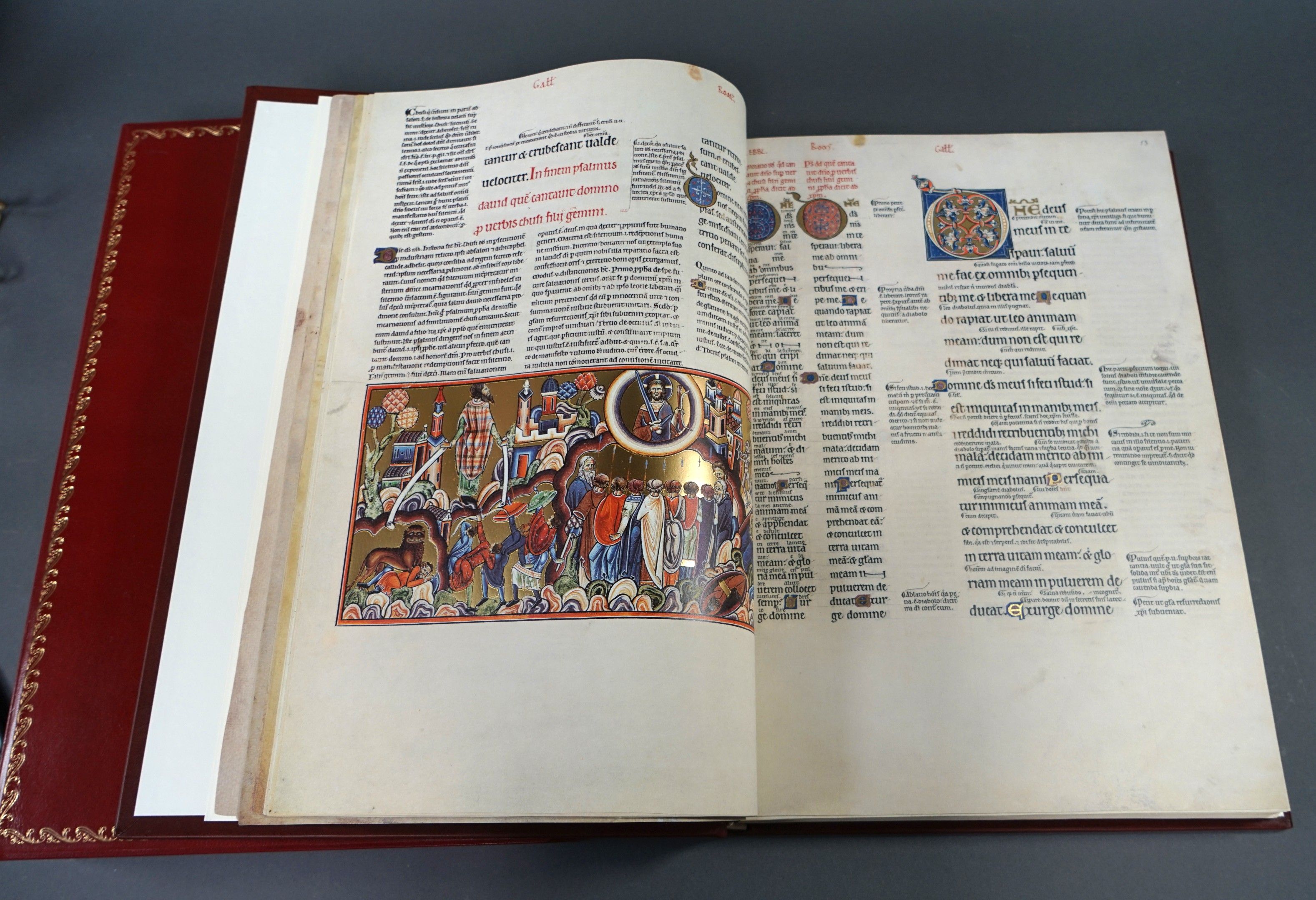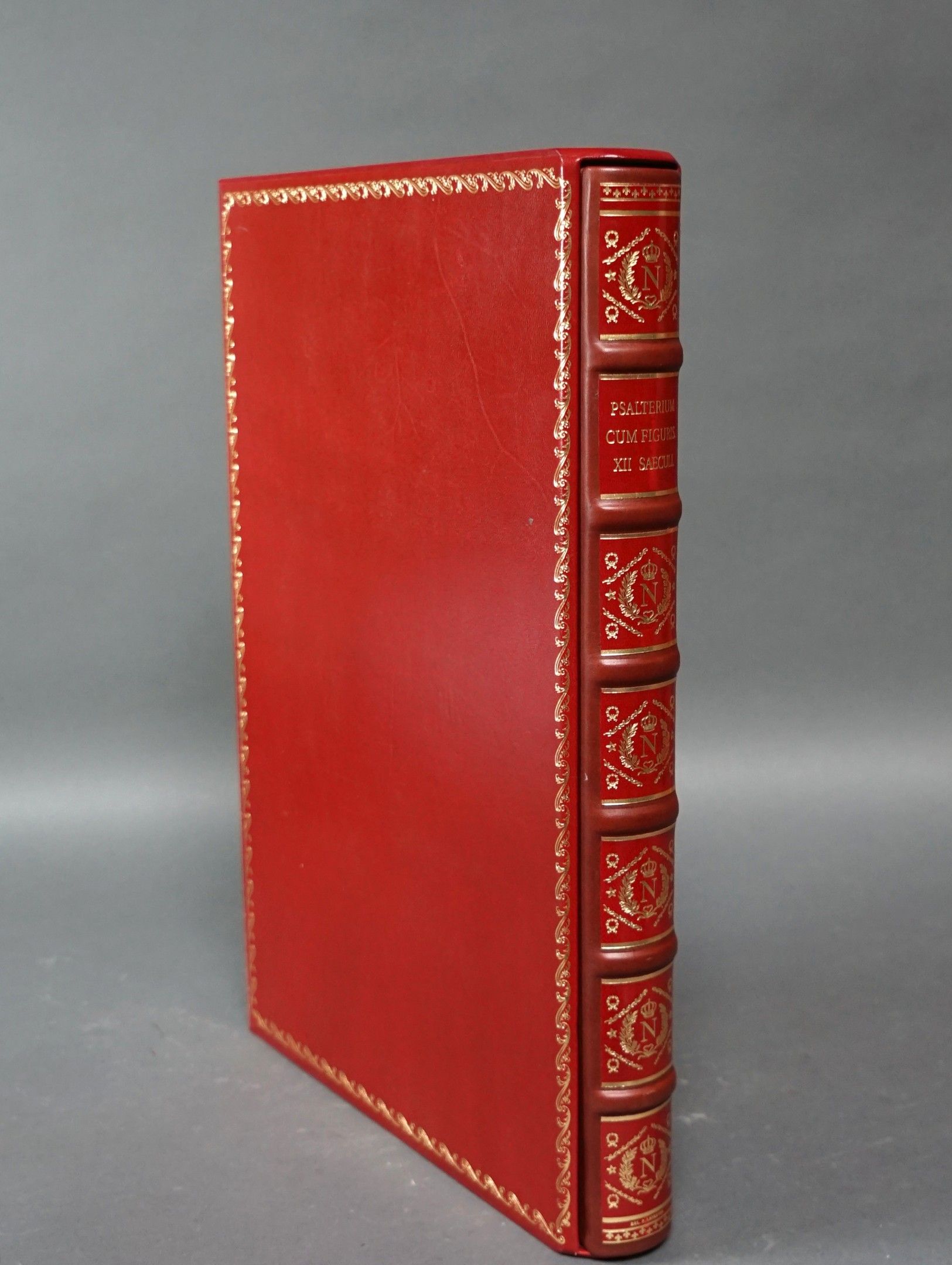 PSALTERIUM GLOSATUM SALTERO ANGLO-CATALAN. Published by Moleiro. Barcelona 2004. Facsimile broadside. Bound in gilt red leather. Numbered 15/987. In its slipcase. Also included ANGLO-CATALAN PSALTER, Moleiro Editions. Barcelona 2006. 1 vol. in folio paperback.