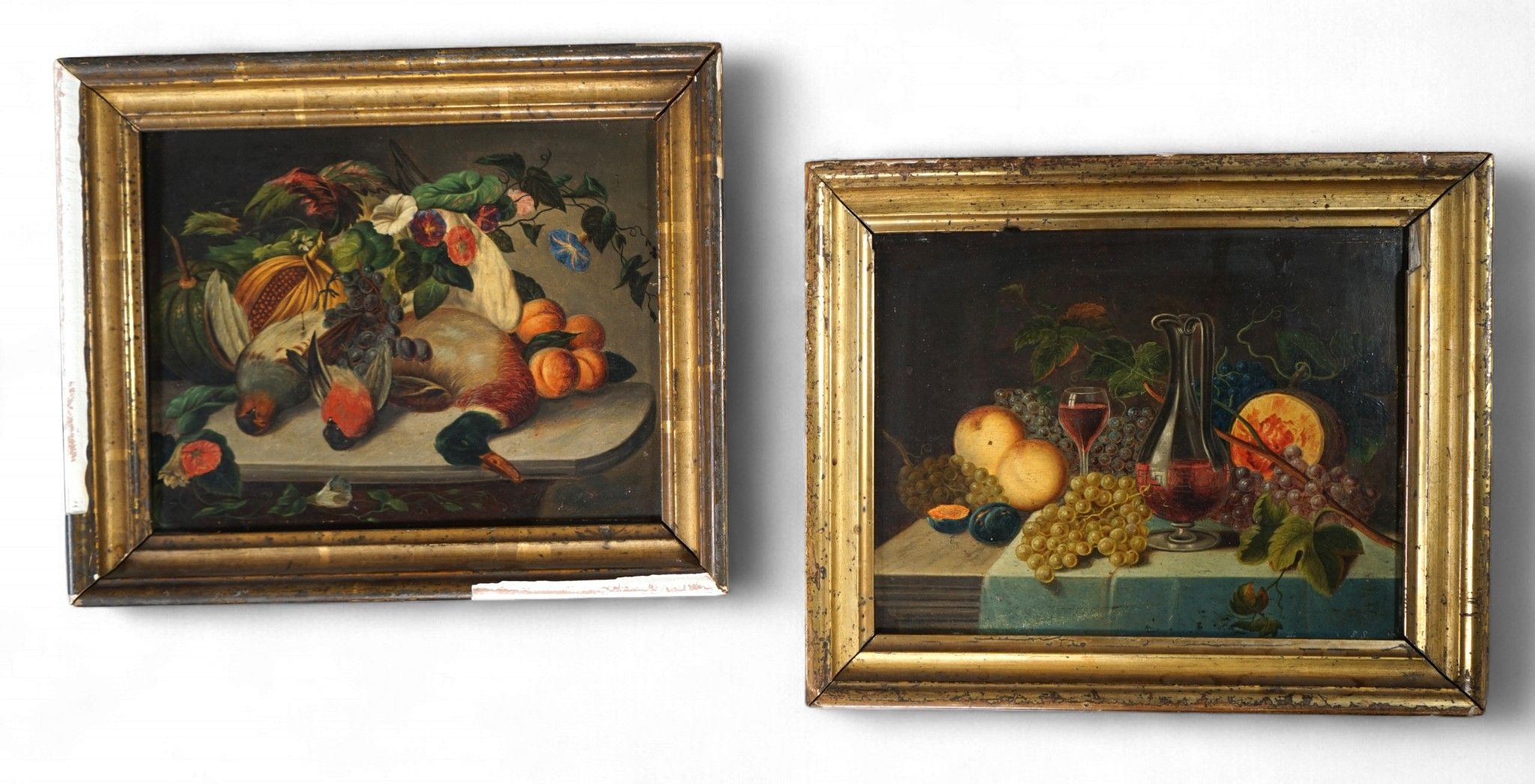 19th century French school. Still lifes with game and a carafe of wine. Two oils on panels, one monogrammed BS. 18 x 24 cm.