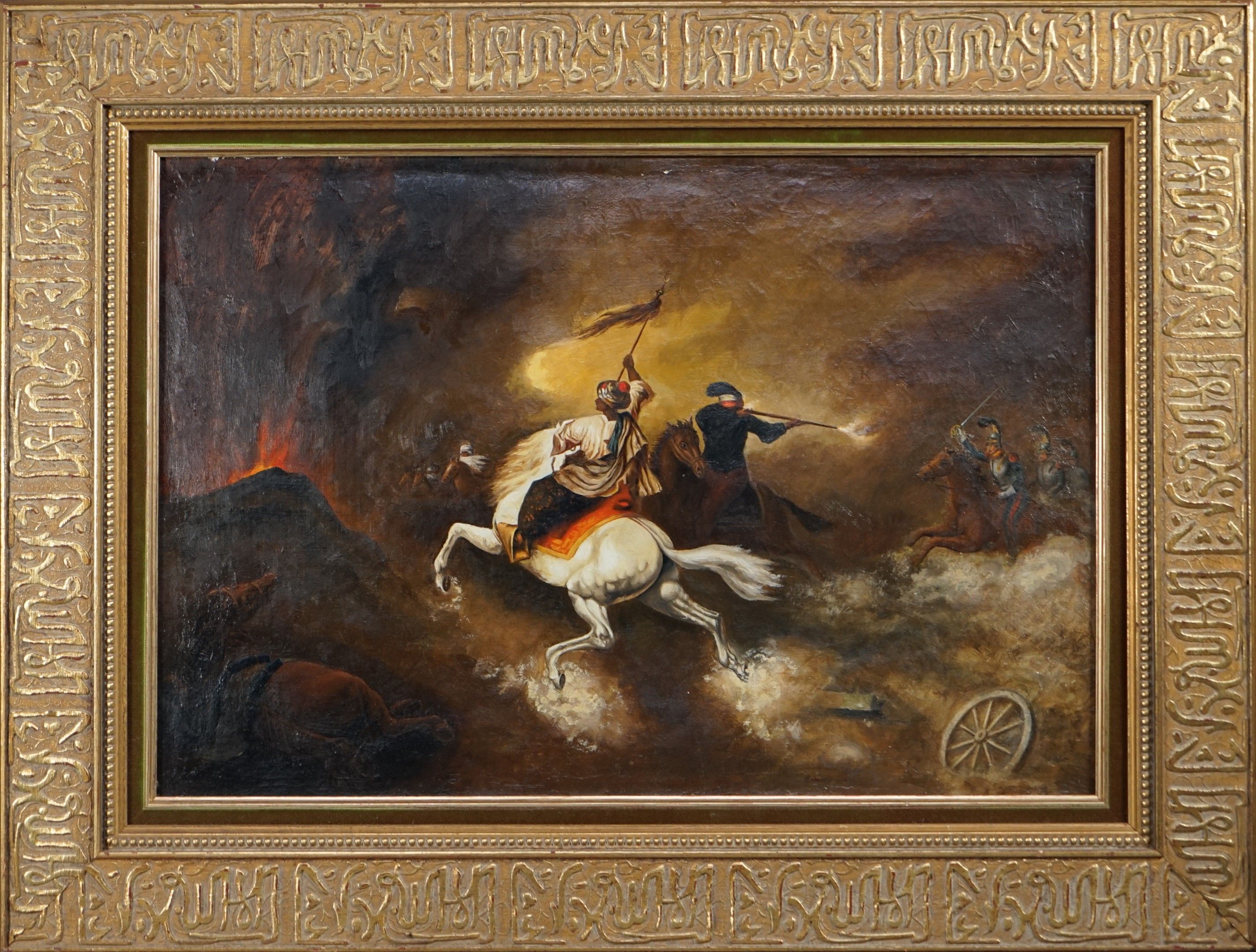 Romantic school. Battle scene in the desert. Oil on canvas. 38 x 58 cm.
