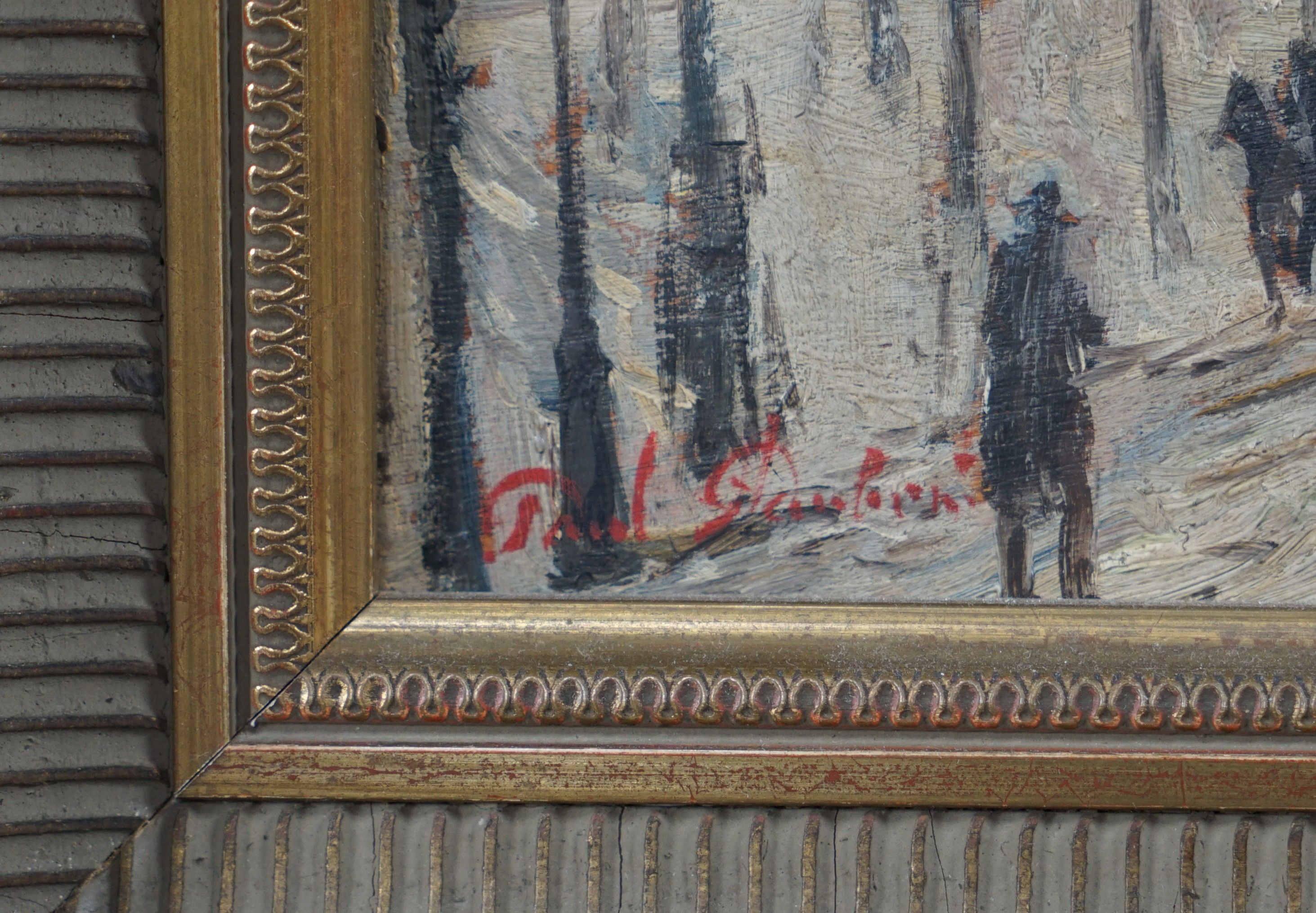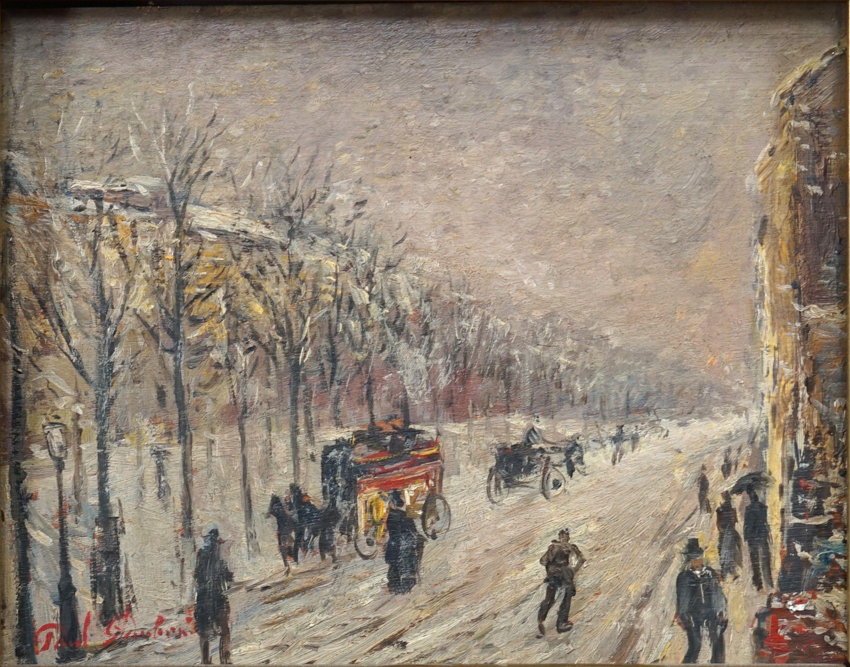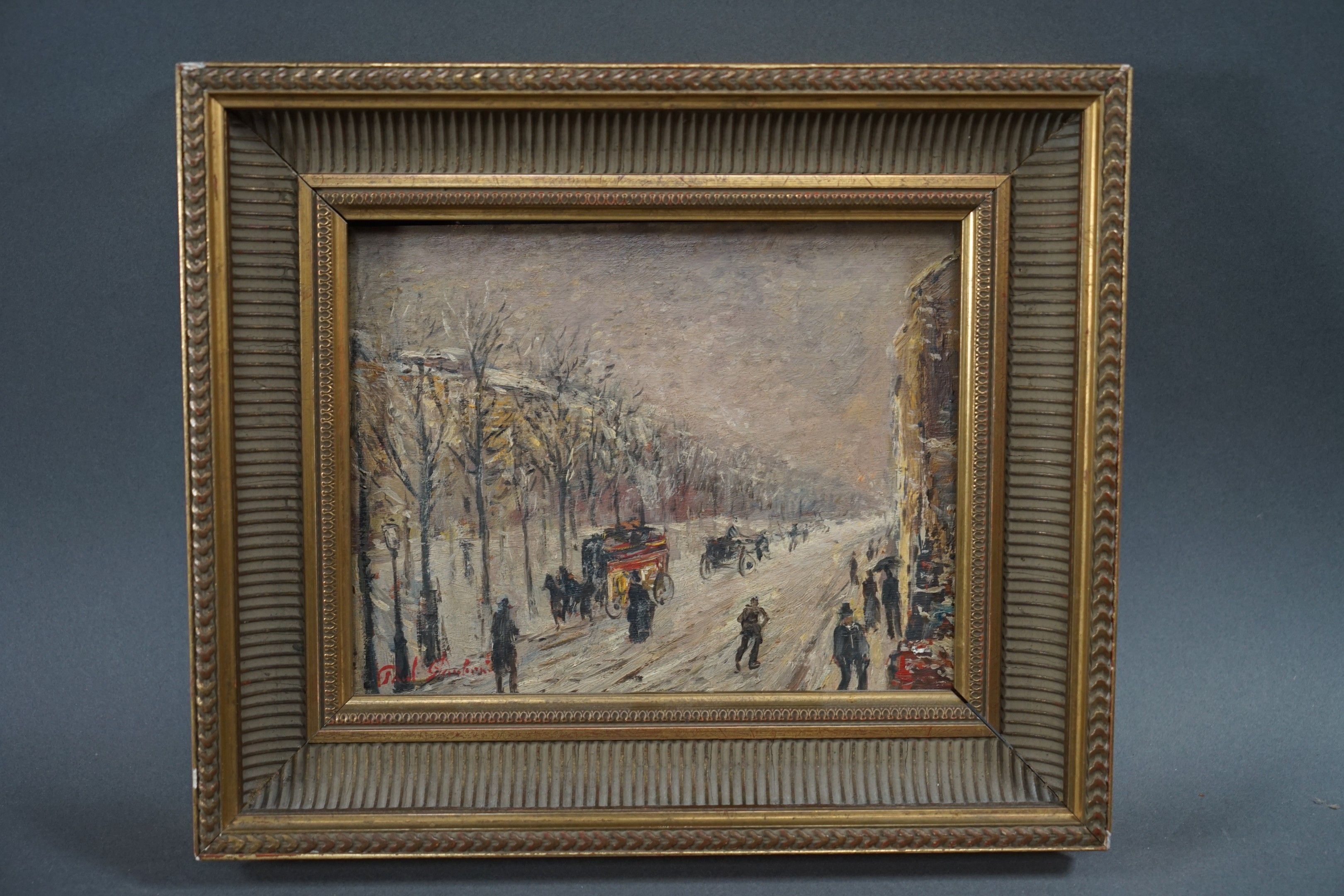 French school end of XIXth century. Street in Paris under the snow. Oil on wood panel signed lower left. 18.5 x 23.5 cm.