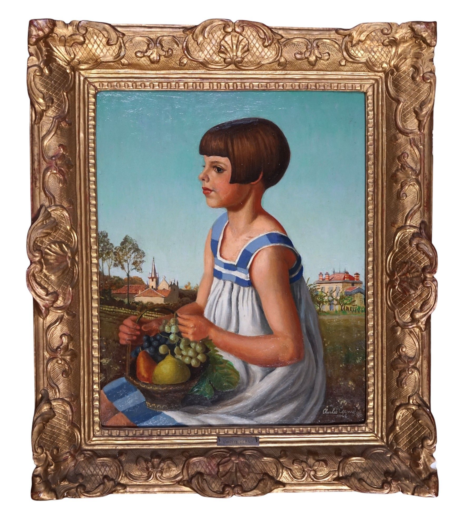 Charles CERNY (1892-1965). Portrait of a young girl with a basket outdoors. Oil on Isorel signed and dated '1945' lower right. 40 x 33 cm.