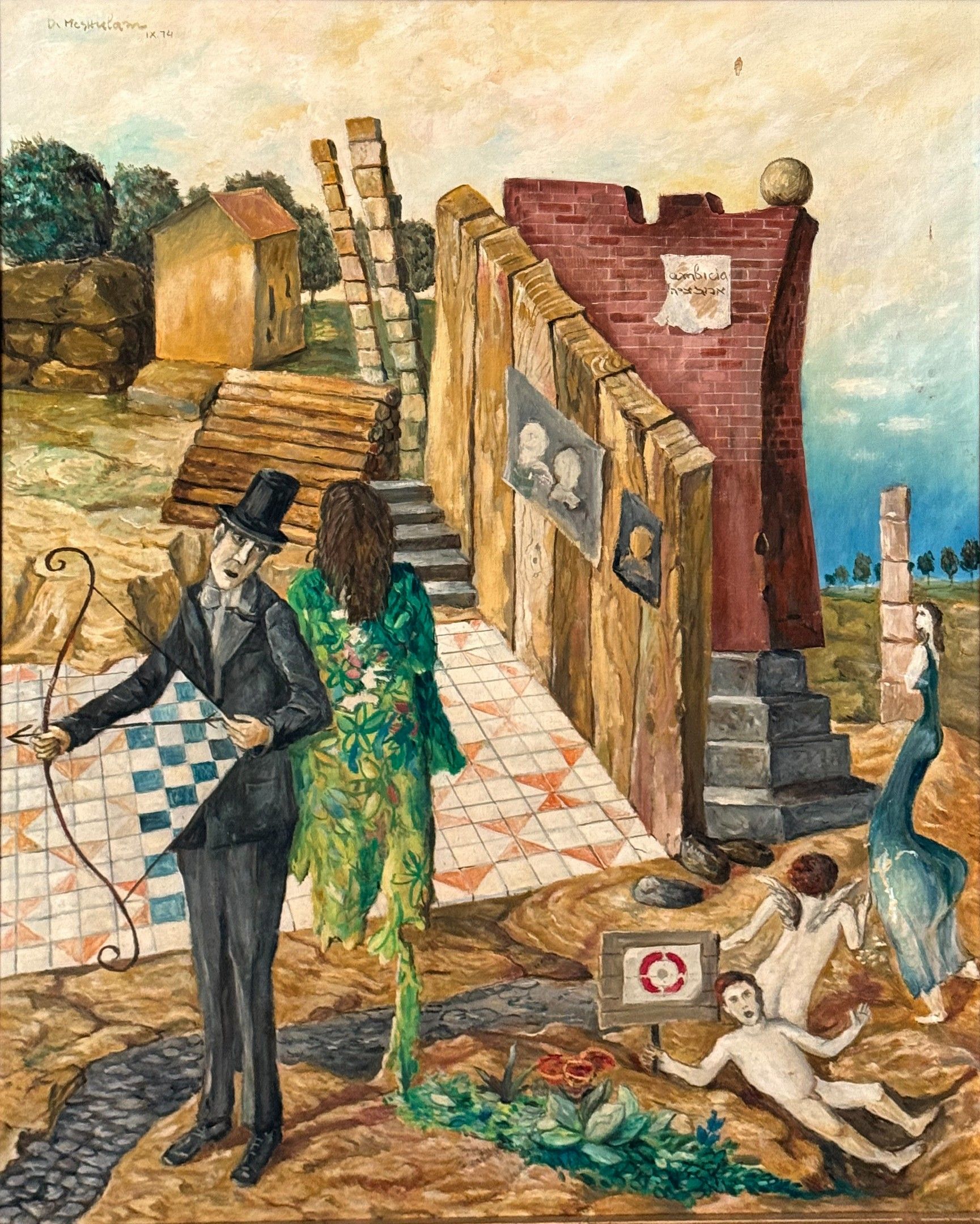 David MESHULAM (1930-1987) Personnages à l'arc et la cible, 1974. Oil on canvas signed upper left and dated IX 74. 62 x 46 cm
