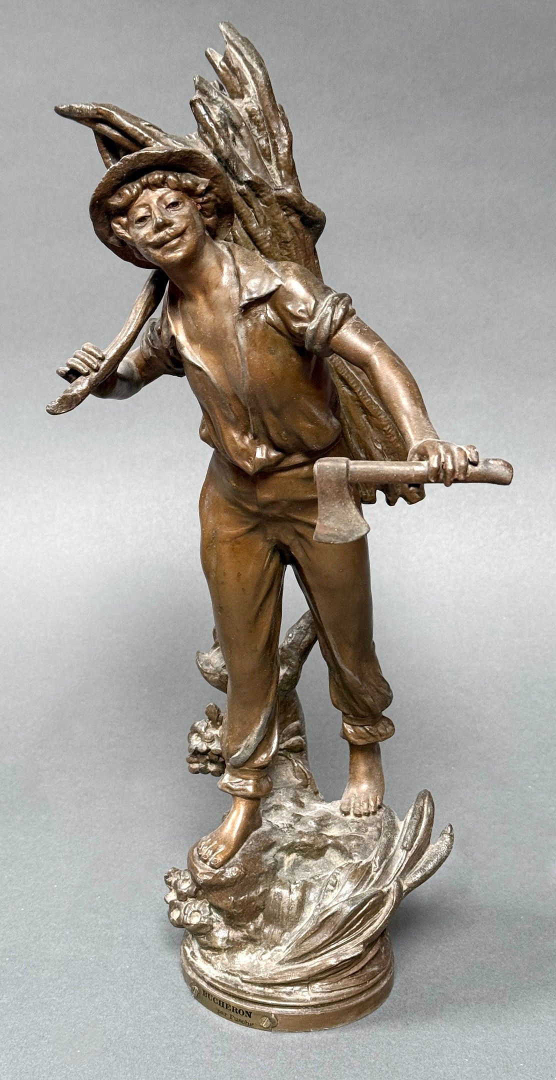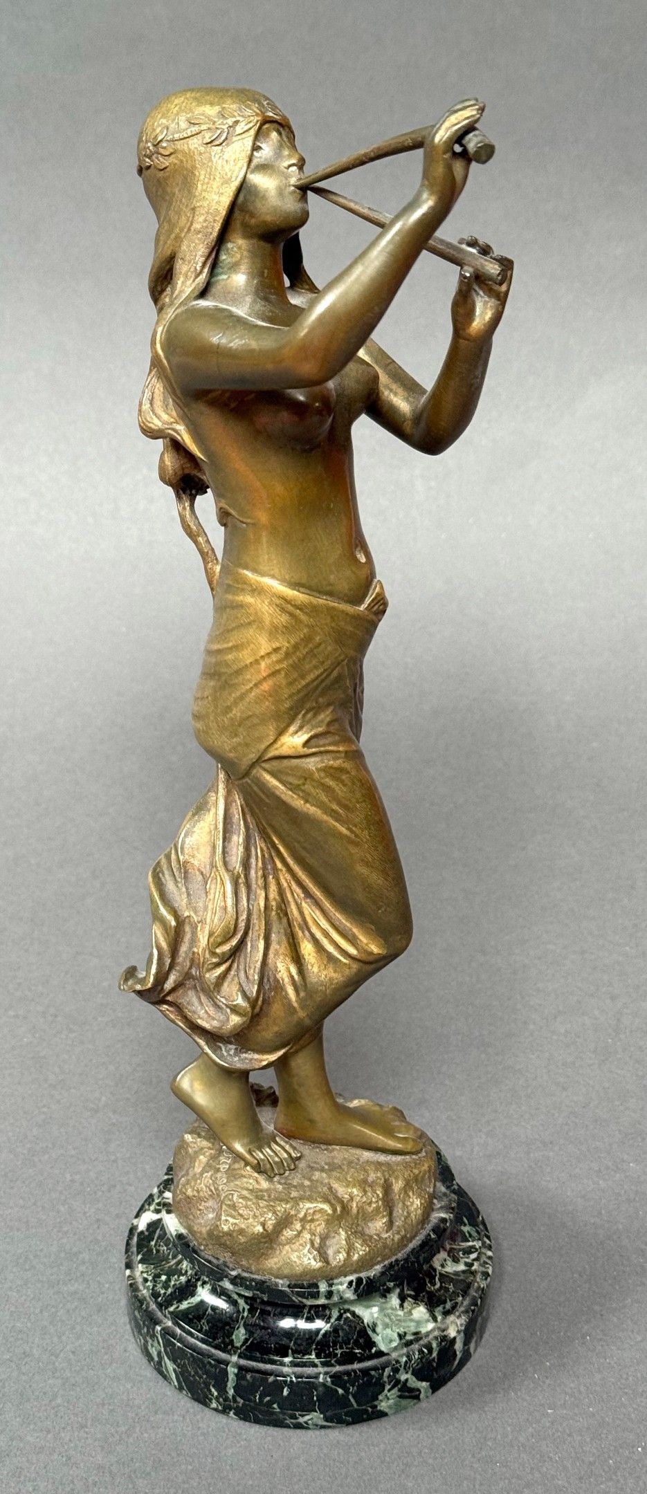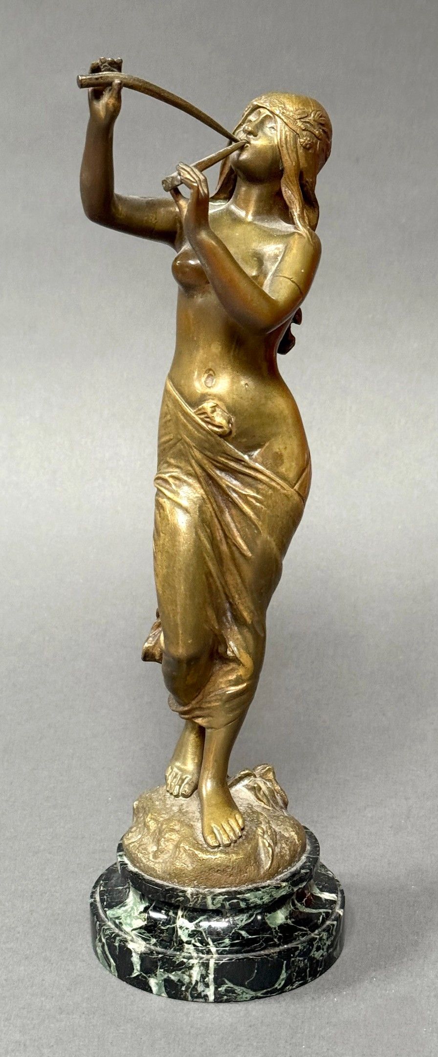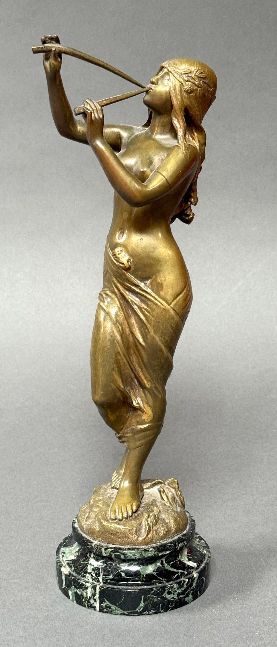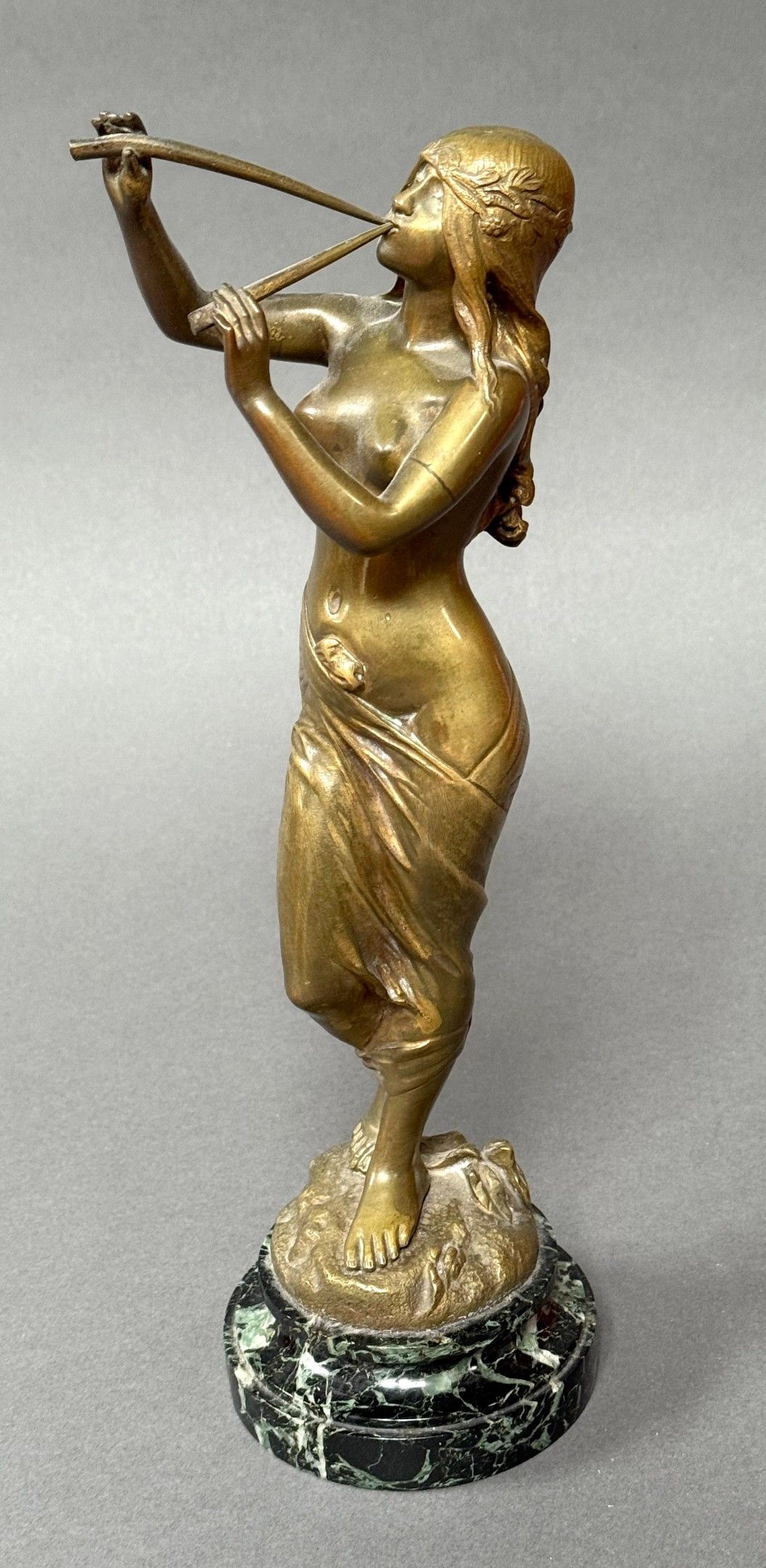 Edouard DROUOT (1859-1945) Muse des bois, circa.1900. Bronze with golden patina, signed. H. 33 cm Sea green marble base. Total height : 35 cm
