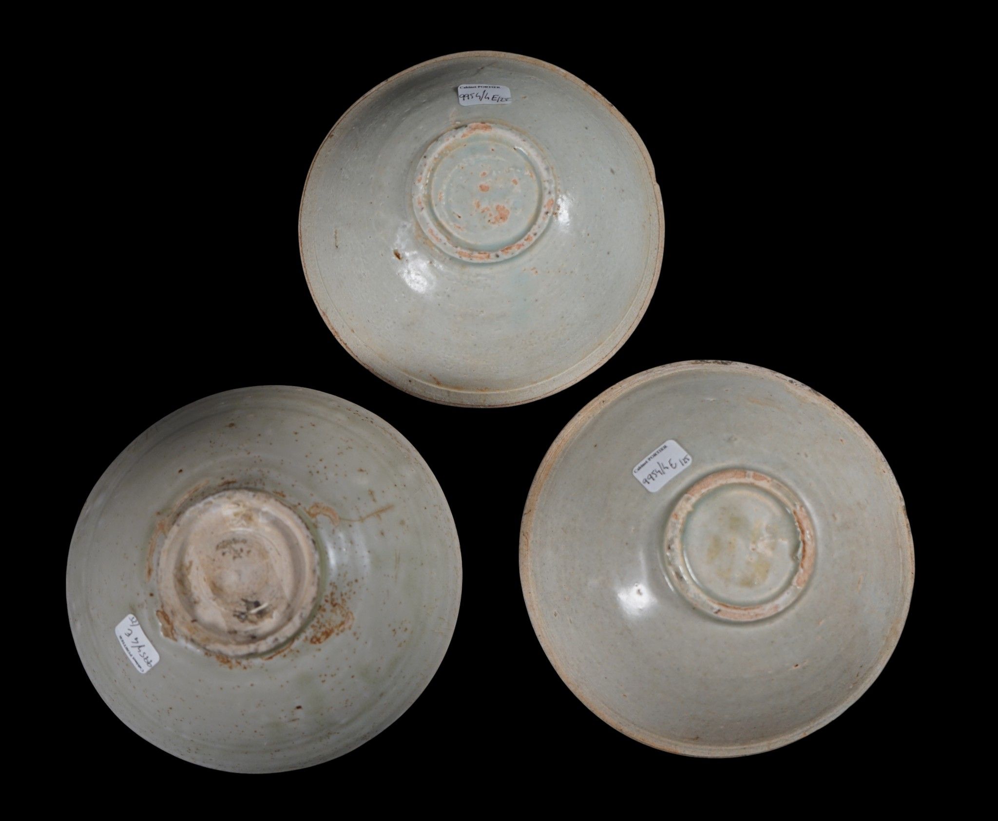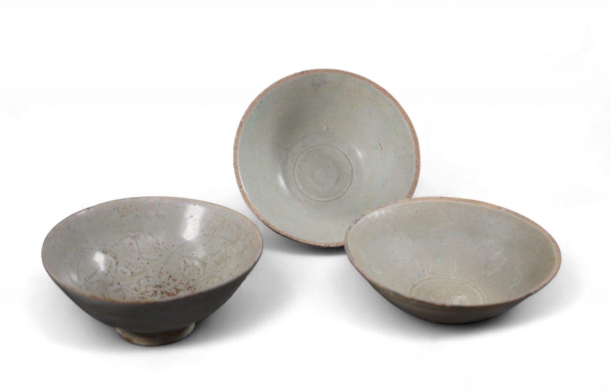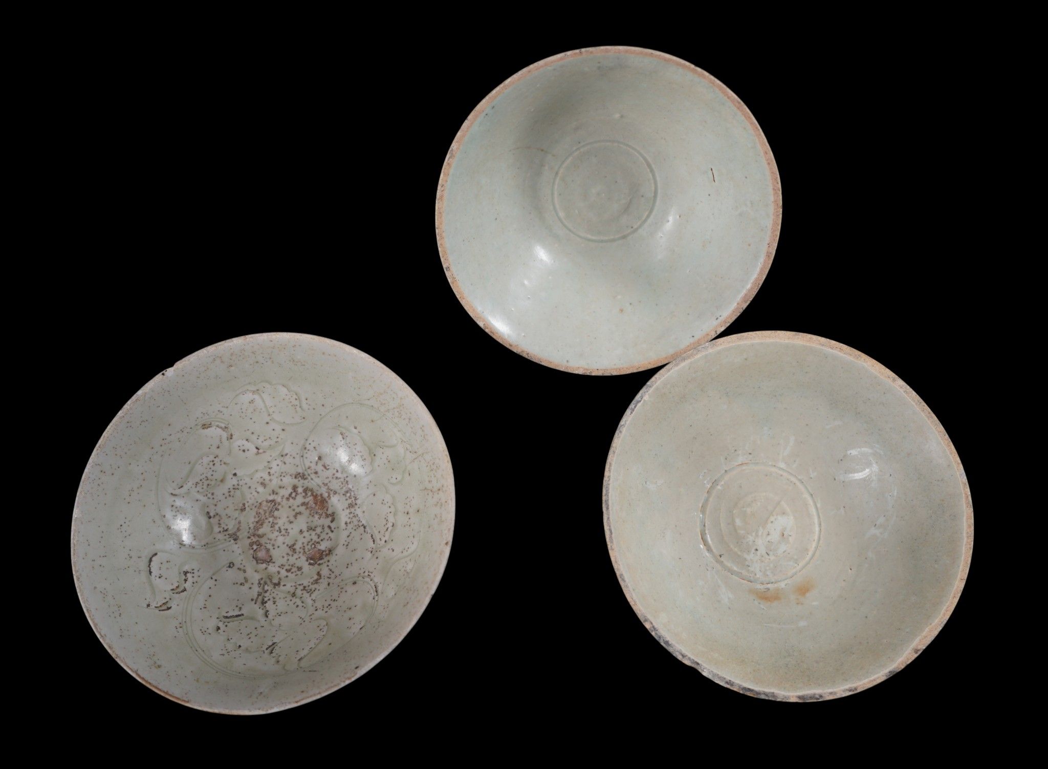 CHINA, Qingbai kilns - SONG Dynasty (960 - 1279) Three bluish-white glazed stoneware CUPS, one with stylized flowers incised under the glaze. (Chips, chips) D. 1514 to 17.1 cm