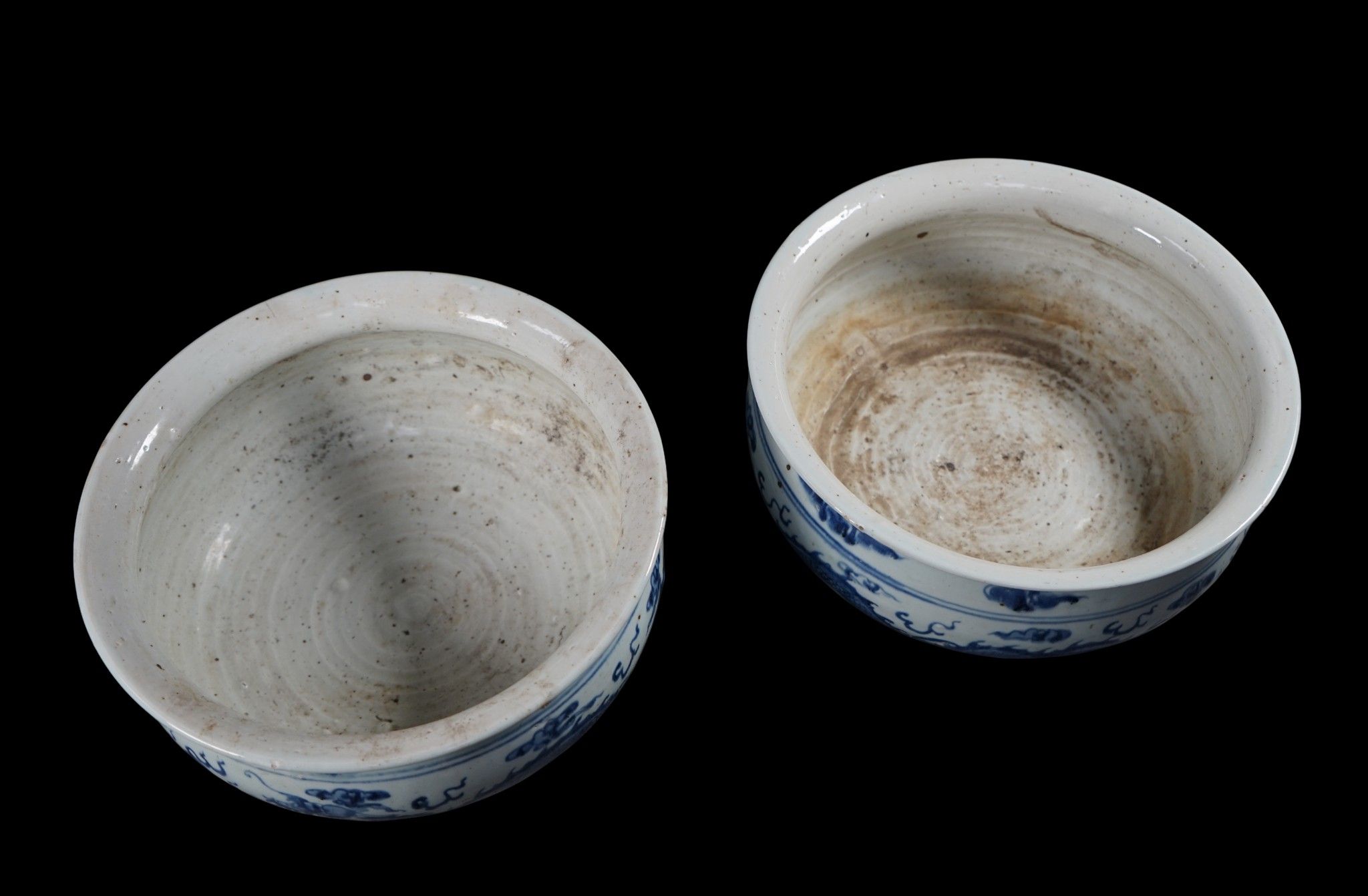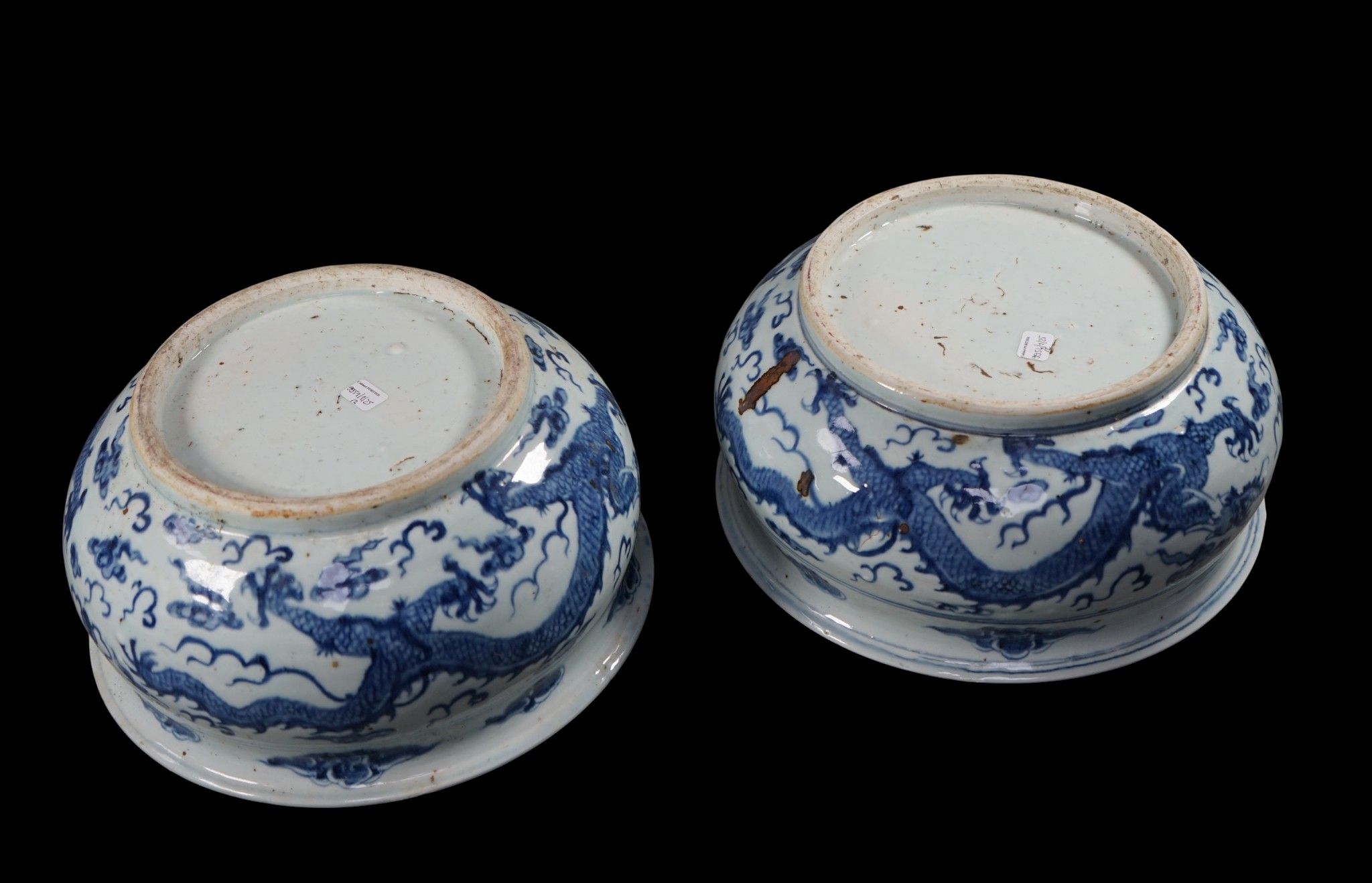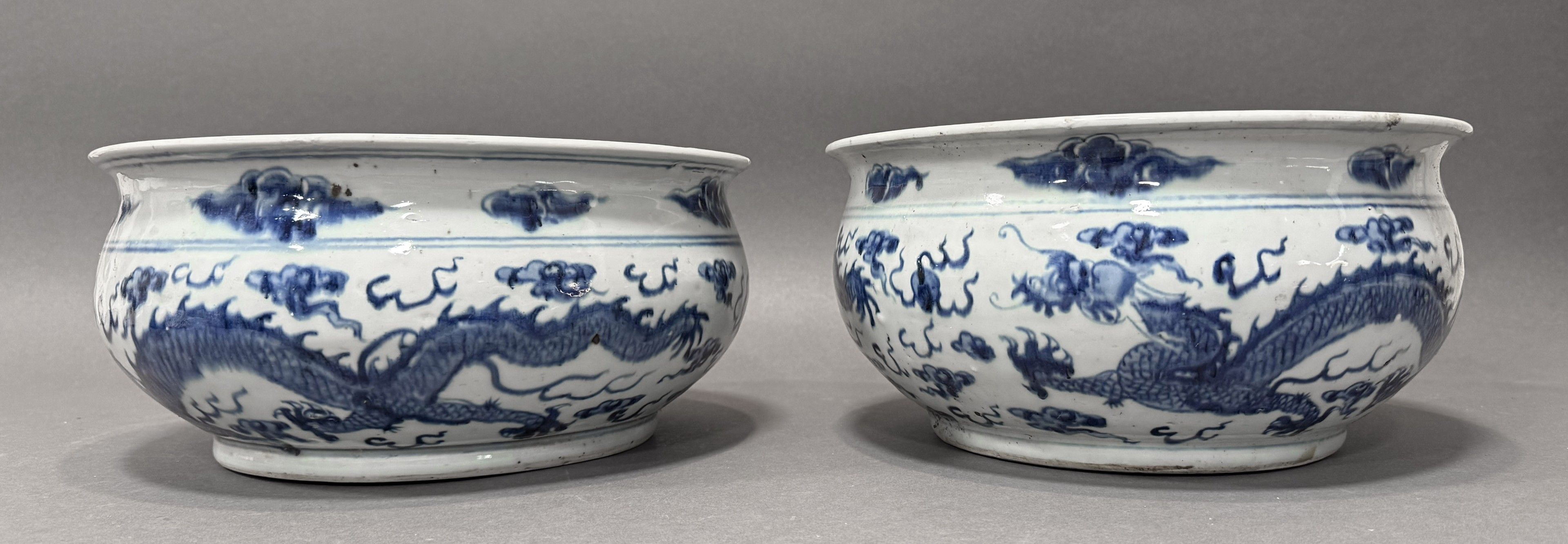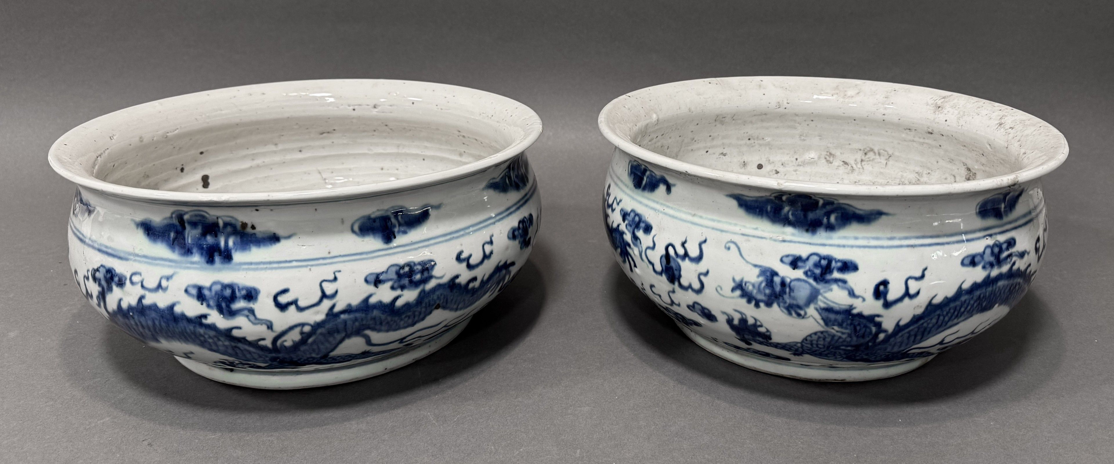 CHINA - KANGXI period (1662 - 1722) Pair of small porcelain VASQUES decorated in blue underglaze with two dragons in the clouds chasing the flamed pearl. (Chips on one, firing defects). D. 31 cm