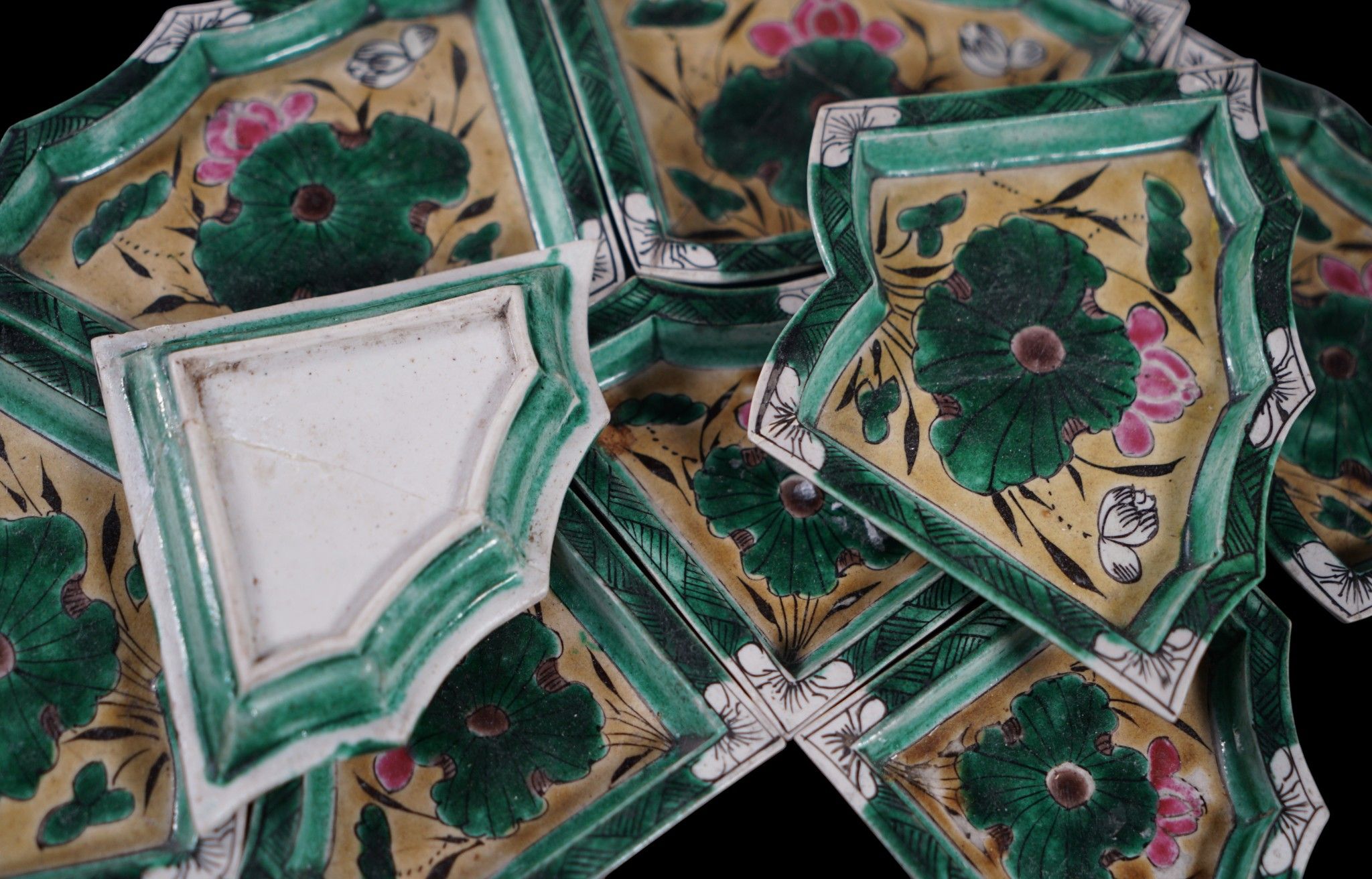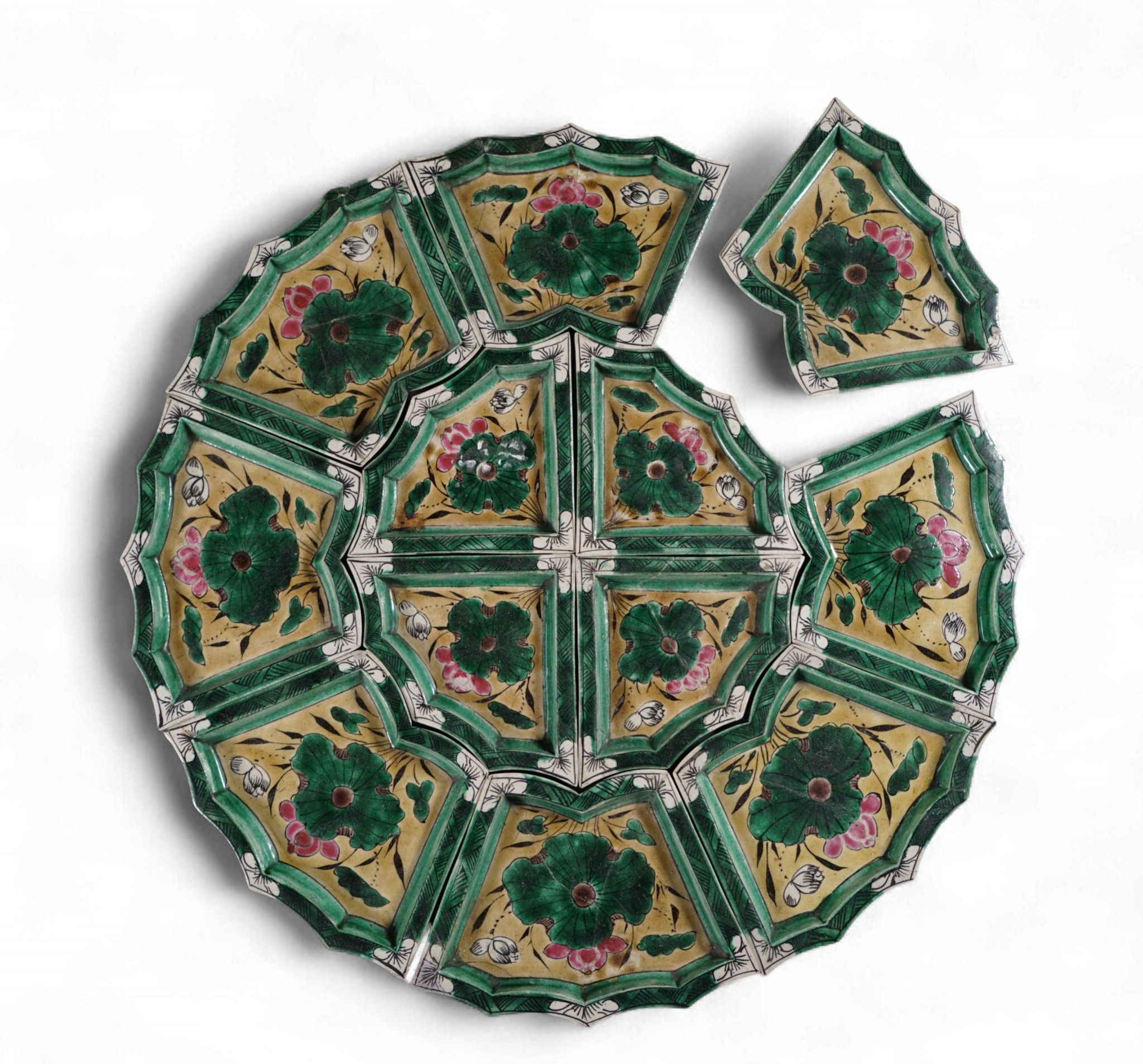 CHINA - KANGXI period (1662 - 1722) Porcelain DRAGEOIR in the form of flowers composed of twelve cups, four forming the heart and eight the petals with polychrome enamelled decoration known as 'sancai' of lotus flowers in their foliage. (Numerous restorations and small chips). Total diameter: 39.3 cm